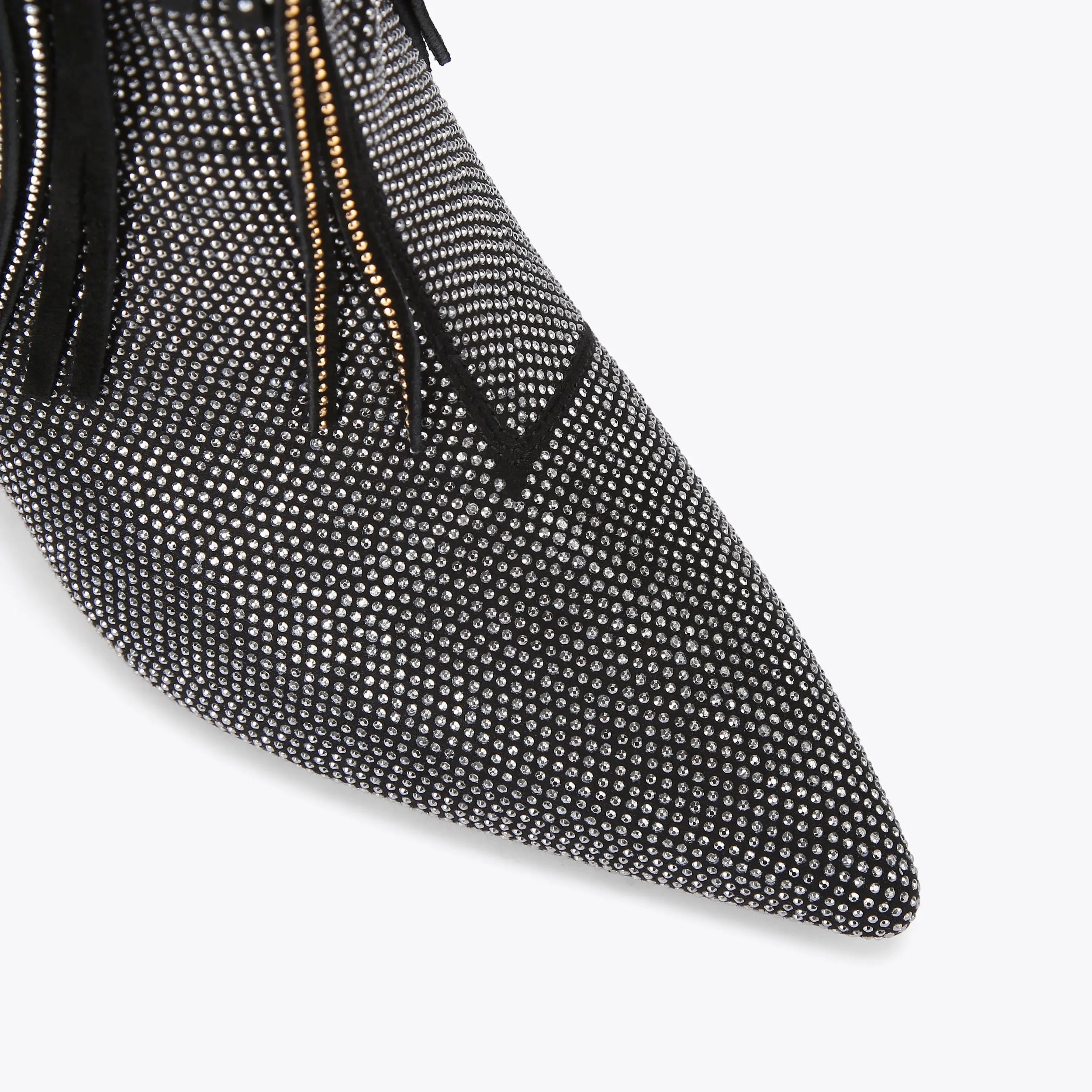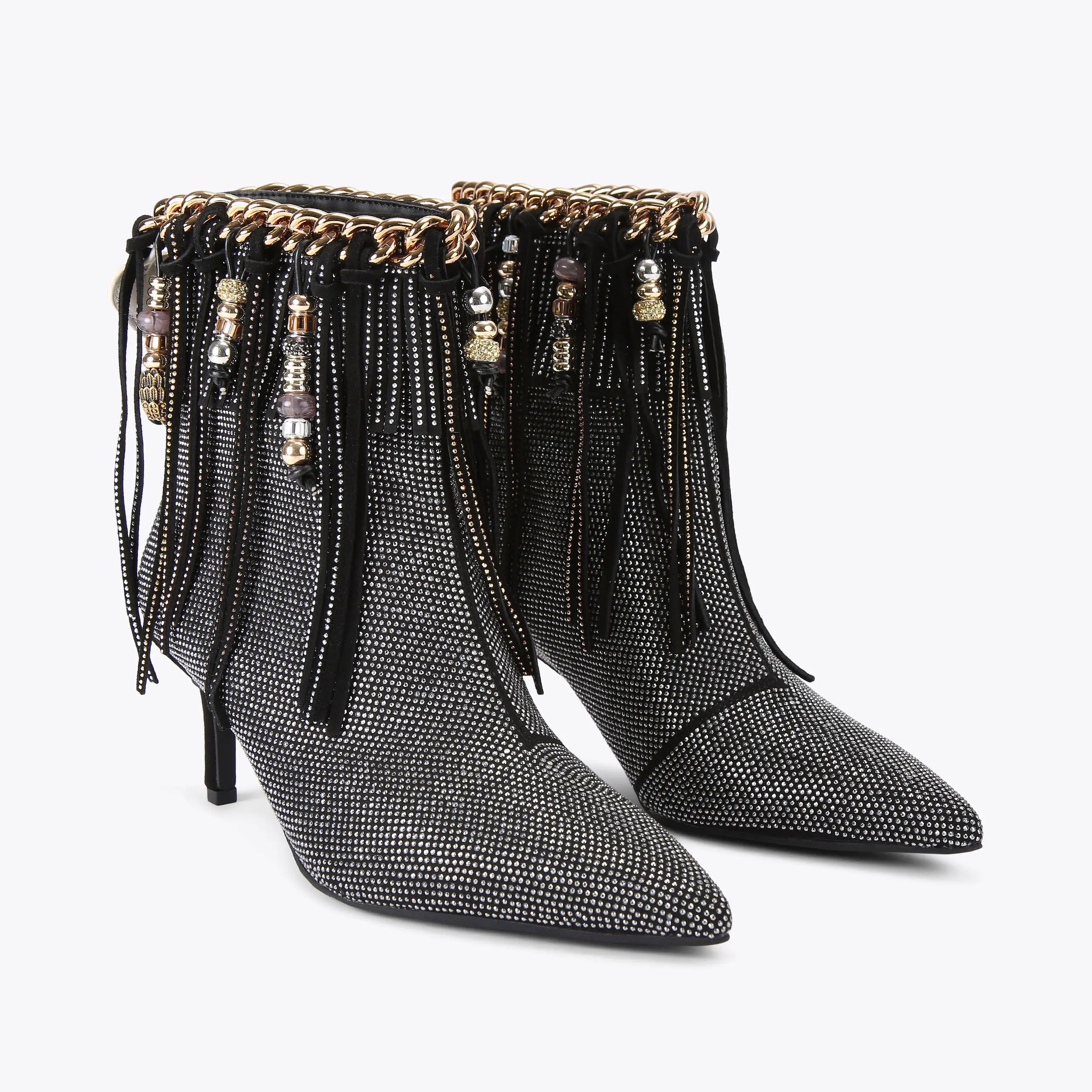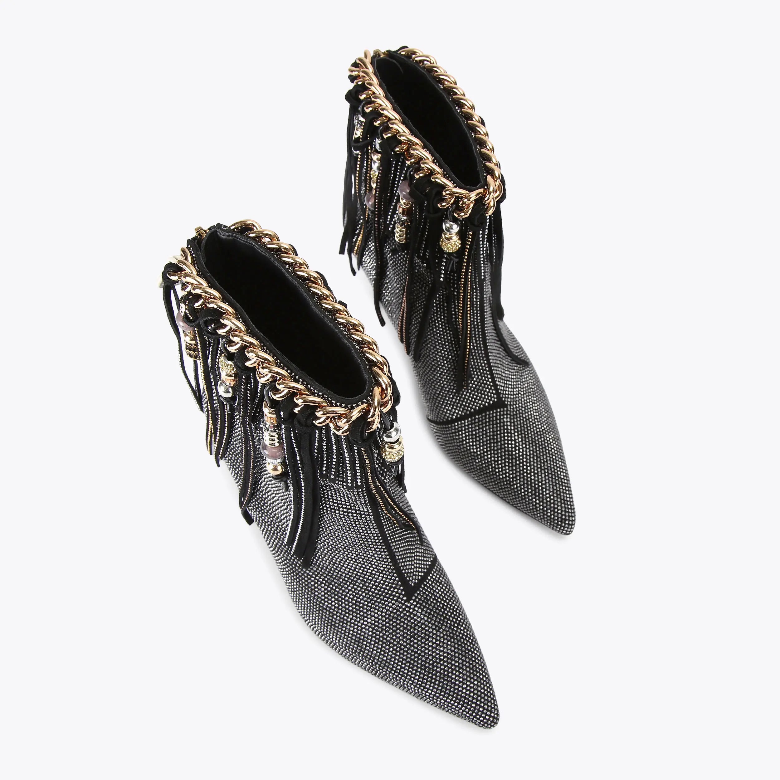 This Fringe Beaded Boot is crafted in black with silver crystal. There is a gold tone chain around the ankle with fringe detail and beads.