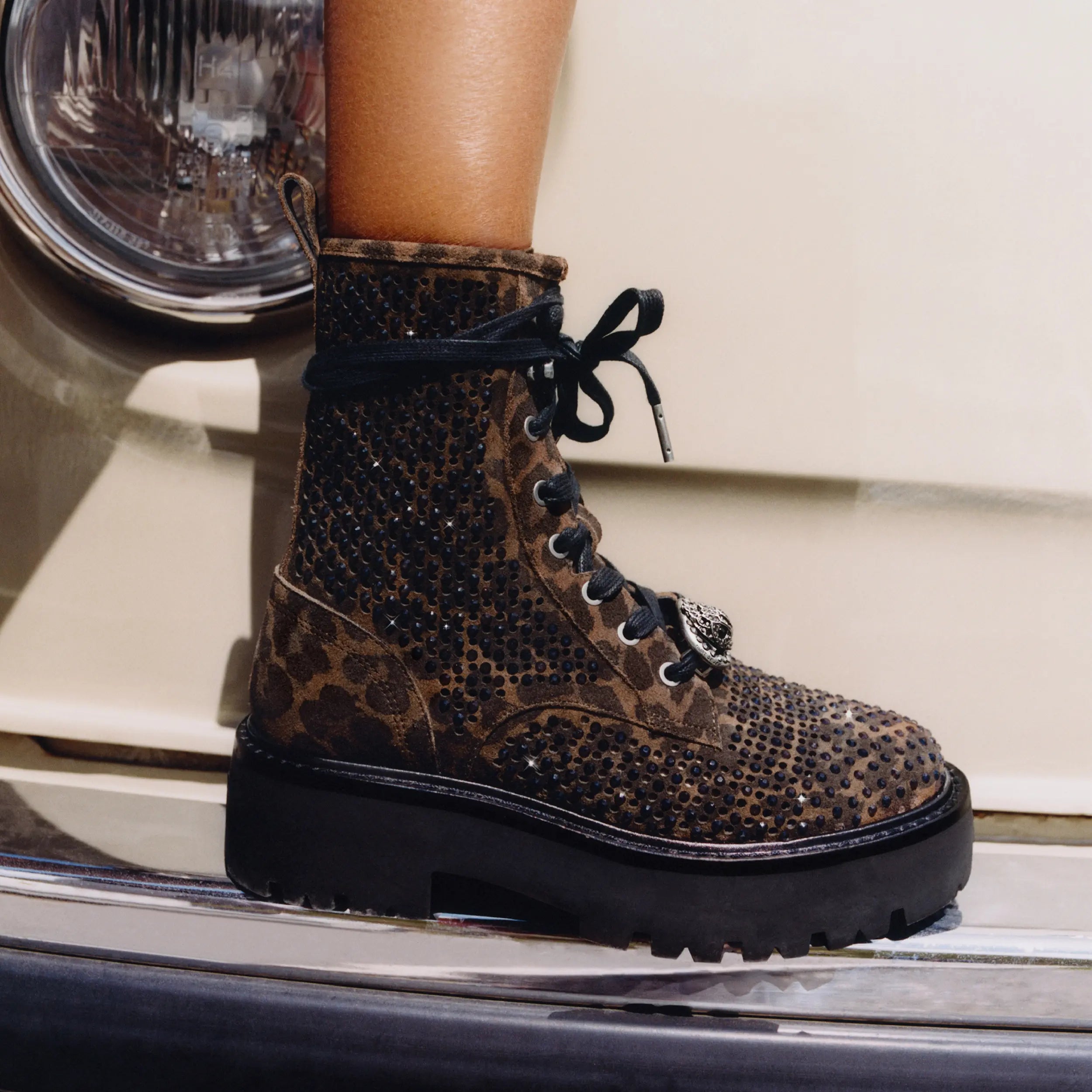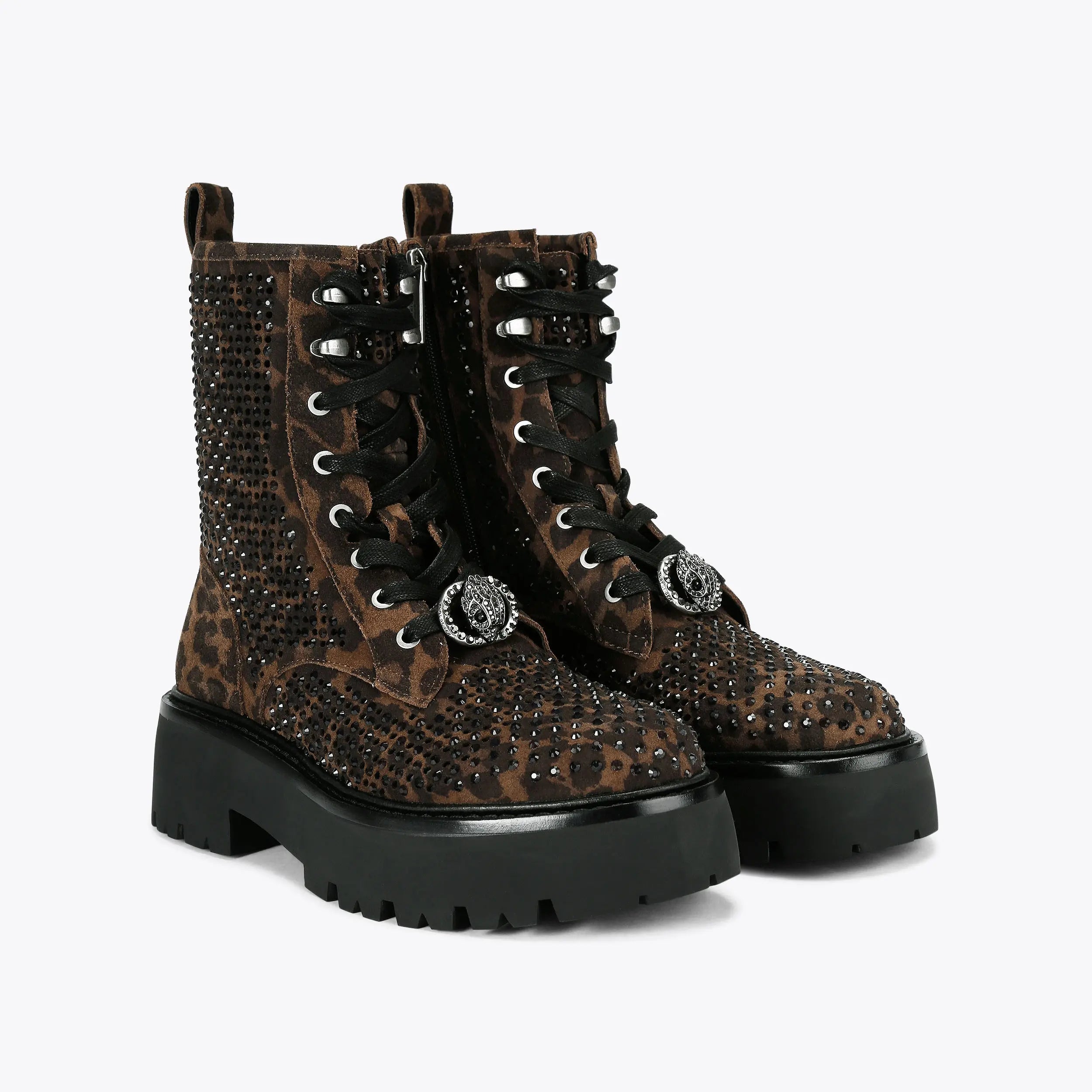 This Chelsea Perf Boot is crafted from a leopard print suede. There are perforated holes and embellished with black crystals. There is an antiqued silver oval trim with eagle head at the centre at the bottom of the laces.