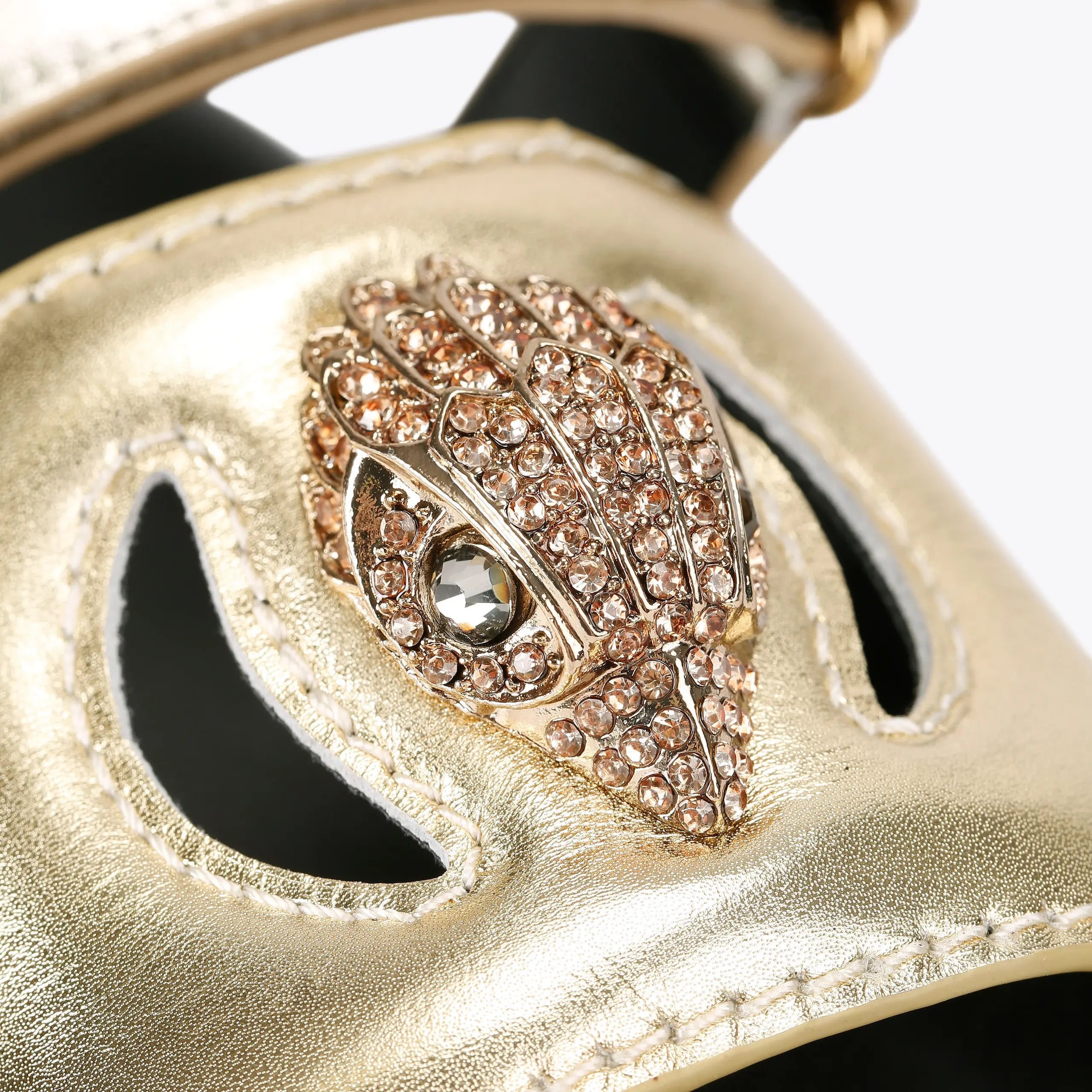 This Eagle Cut Out Sandal is crafted from a gold leather. There is a thinner velcro strap across the foot as well as a darker gold wide strap across the toe. There is a gold crystal embellished eagle head sat on the strap.