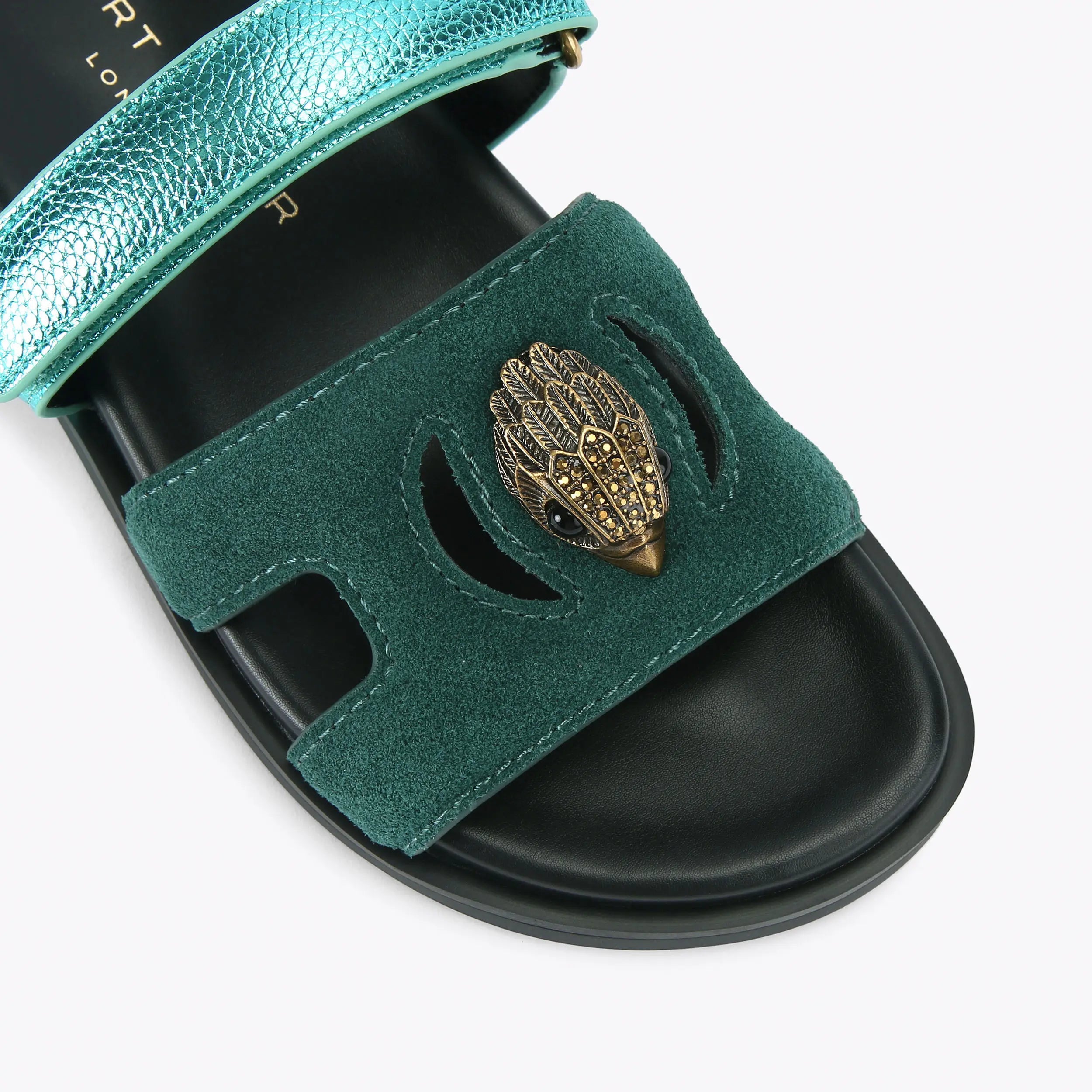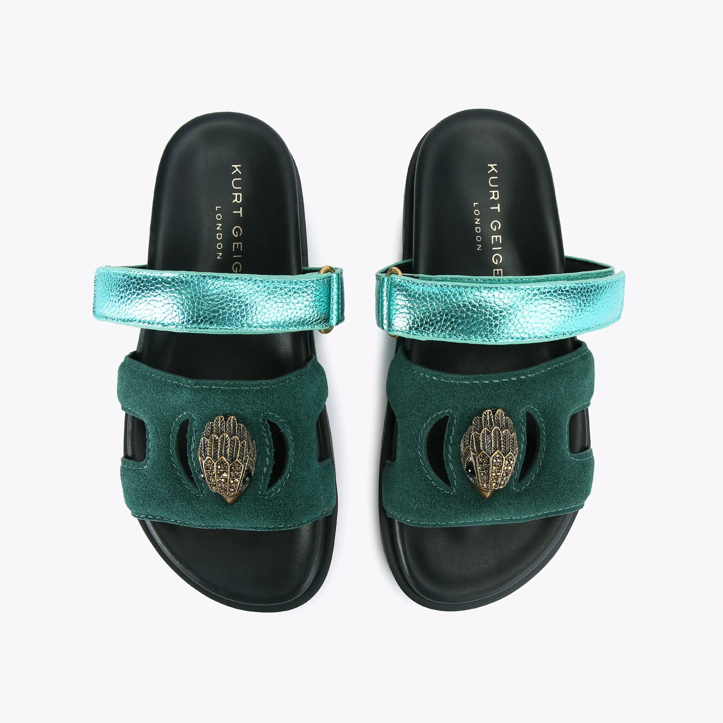 This Eagle Drench Cut Out Sandal is crafted from a green suede leather with antiqued brass eagle head sat on top. There is a pebble grained metallic green velcro strap across the foot.