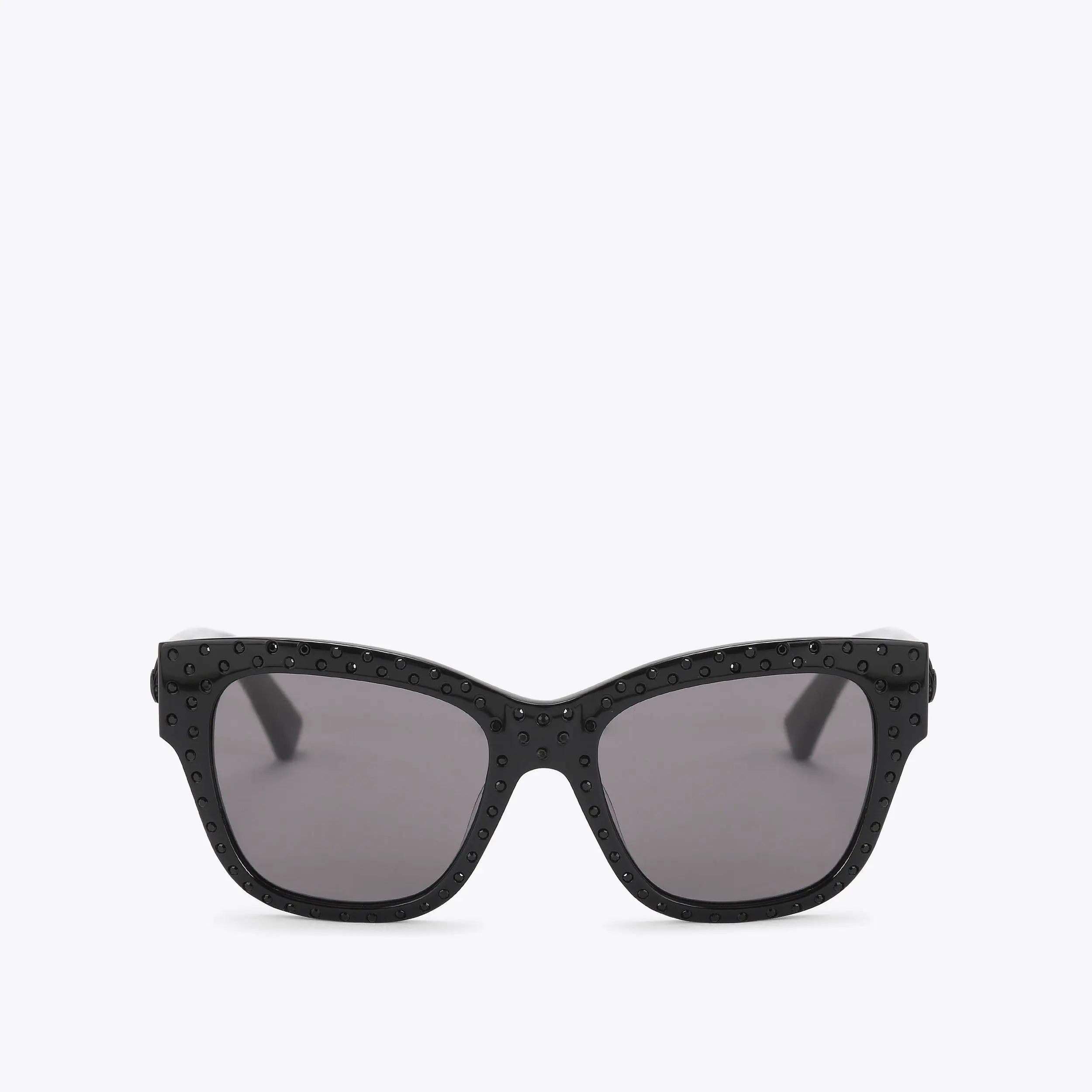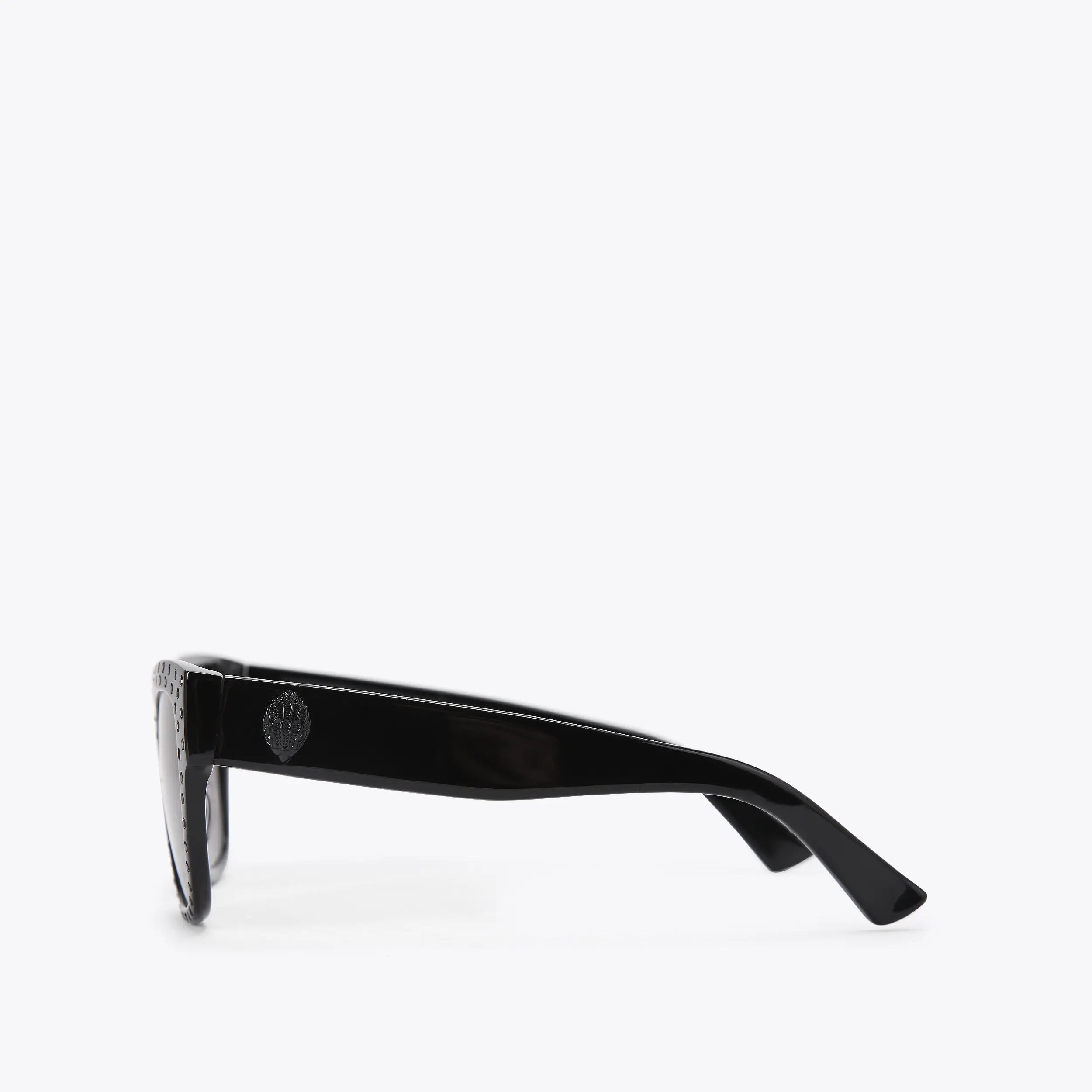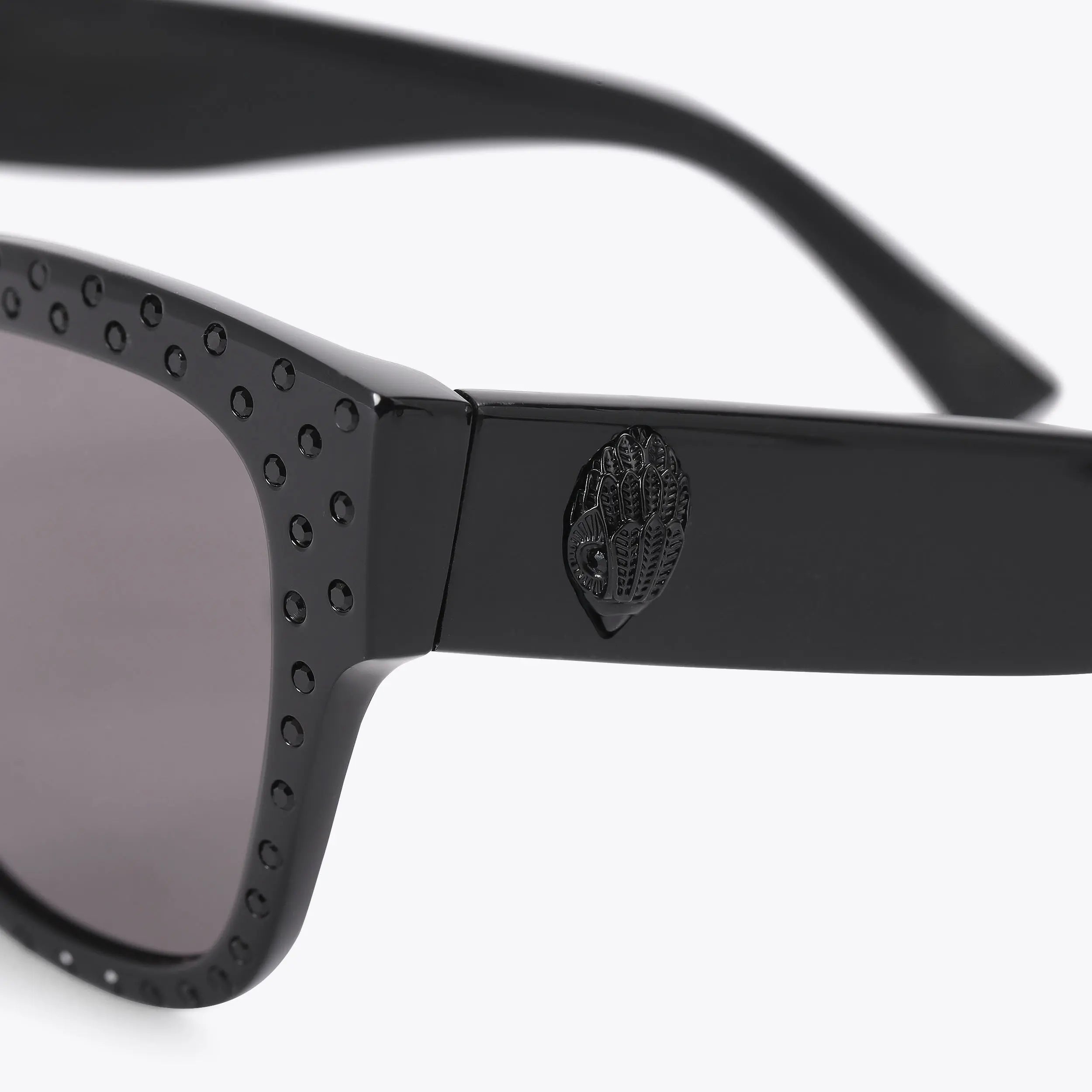 This pair of Shoreditch Square Sunglasses are handmade in black acetate. The arms are designed with black eagle heads. The lenses are tined in grey.