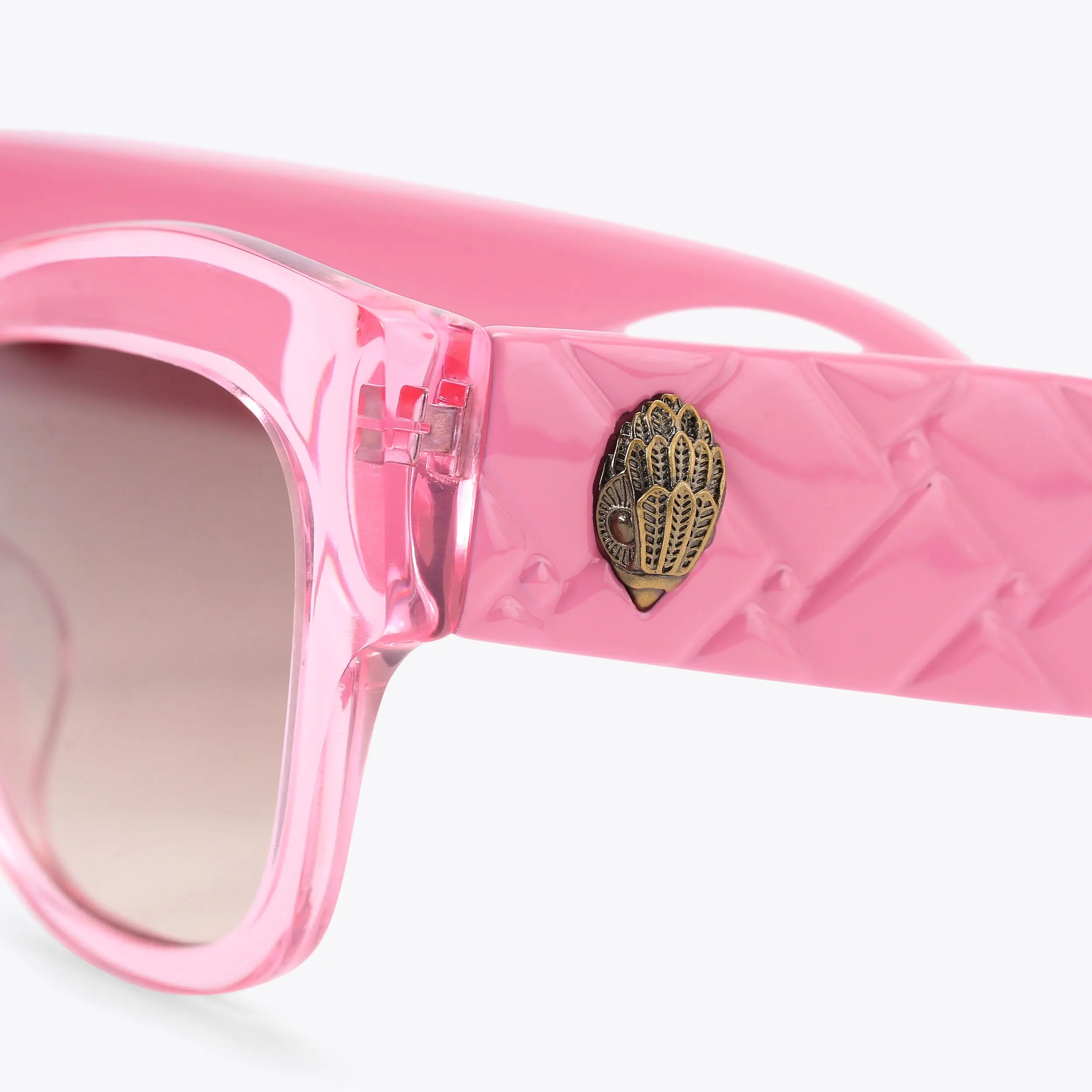 This pair of Kensington Small Butterfly Sunglasses are handmade in a transparent acetate. The arms are designed with statement quilted effect and small antiqued brass eagle branding details. The lenses are slightly tinted.