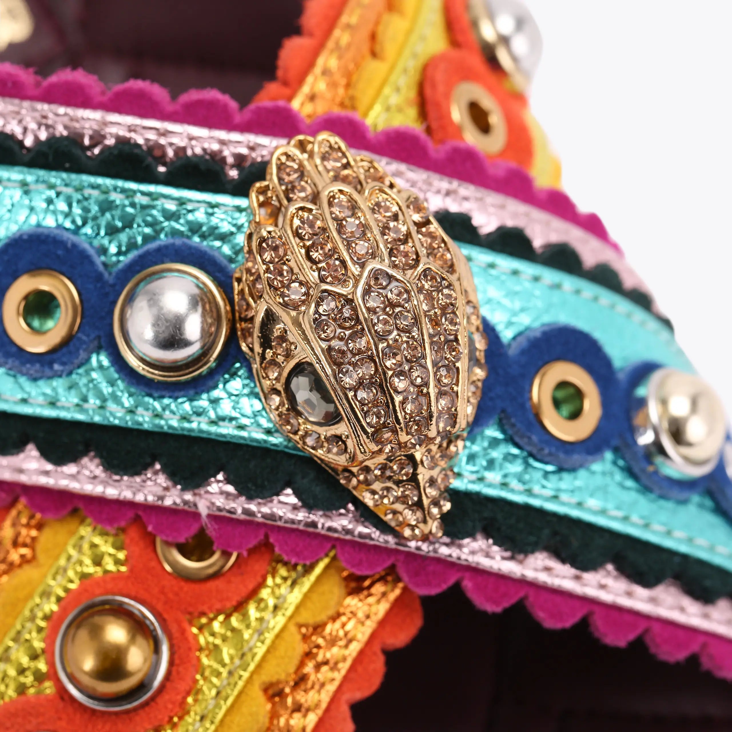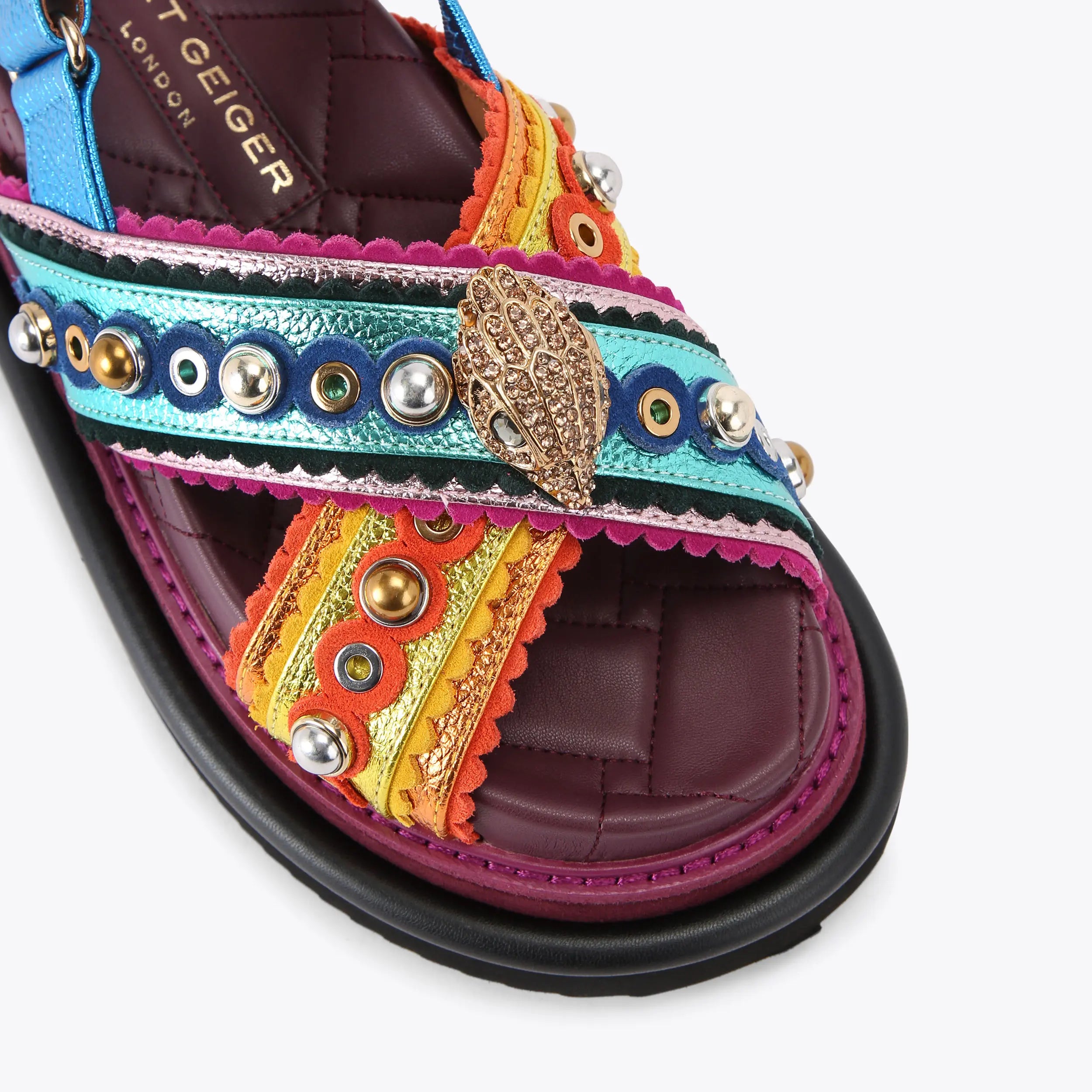 This Orson Cross Scallop sandal is crafted from a multi colour pebble grain leather. The upper straps are detailed with scallops. There are silver and gold studs across the straps and antiqued silver eagle head at the centre.