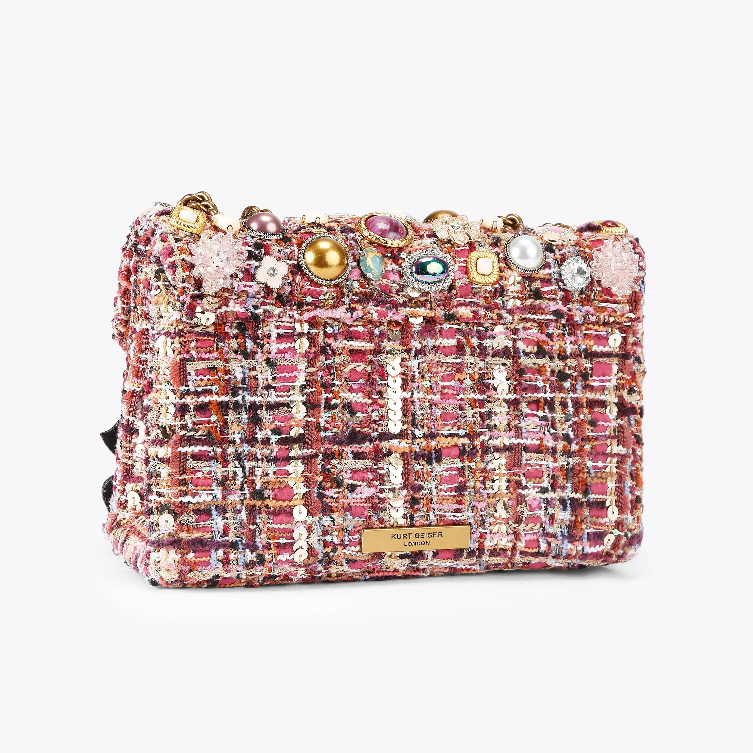 This Medium Kensington Tutti Frutti bag arrives with a pink tweed exterior that is embellished with extravagant 3D charms. They include bows, beaded flowers, crystal hearts and stones.