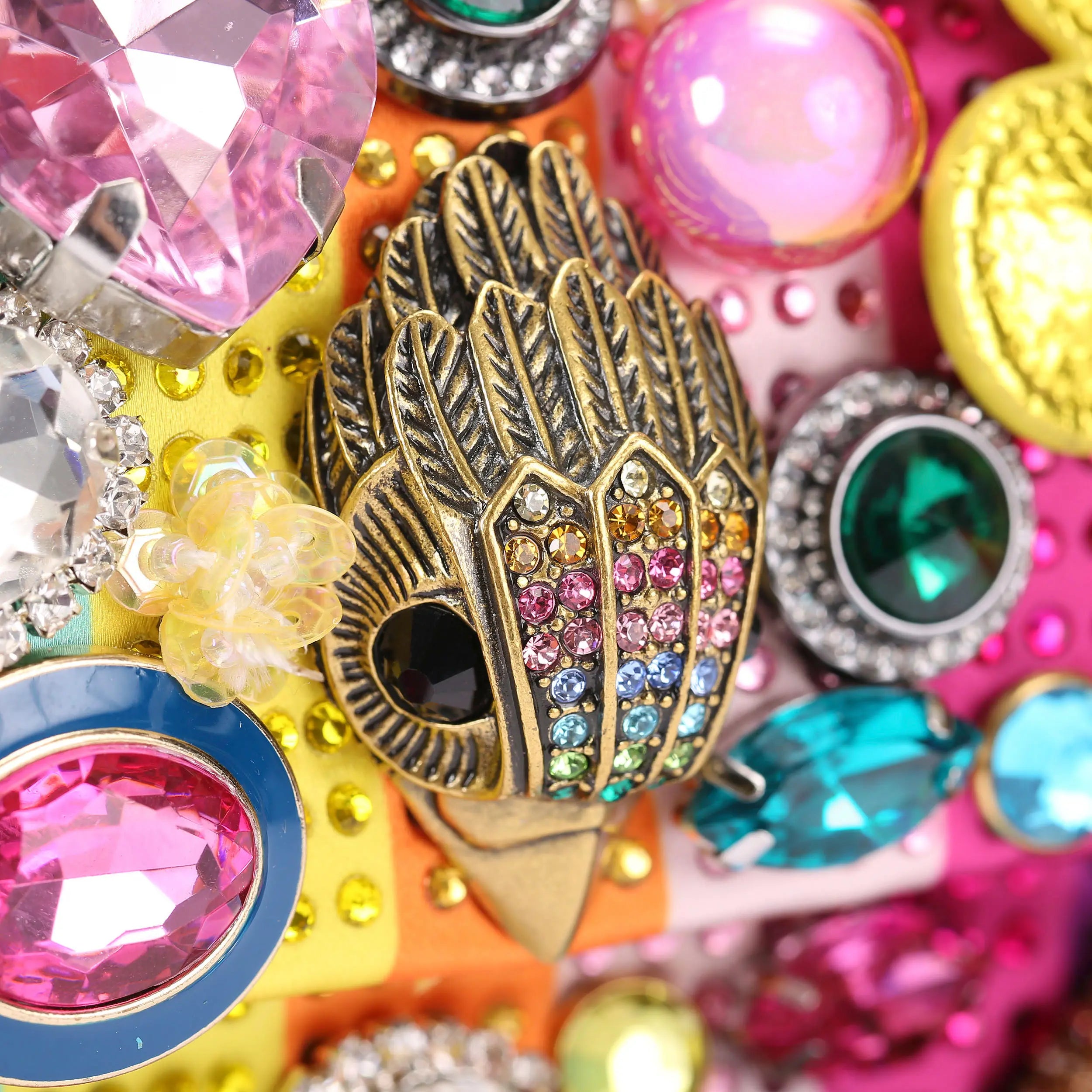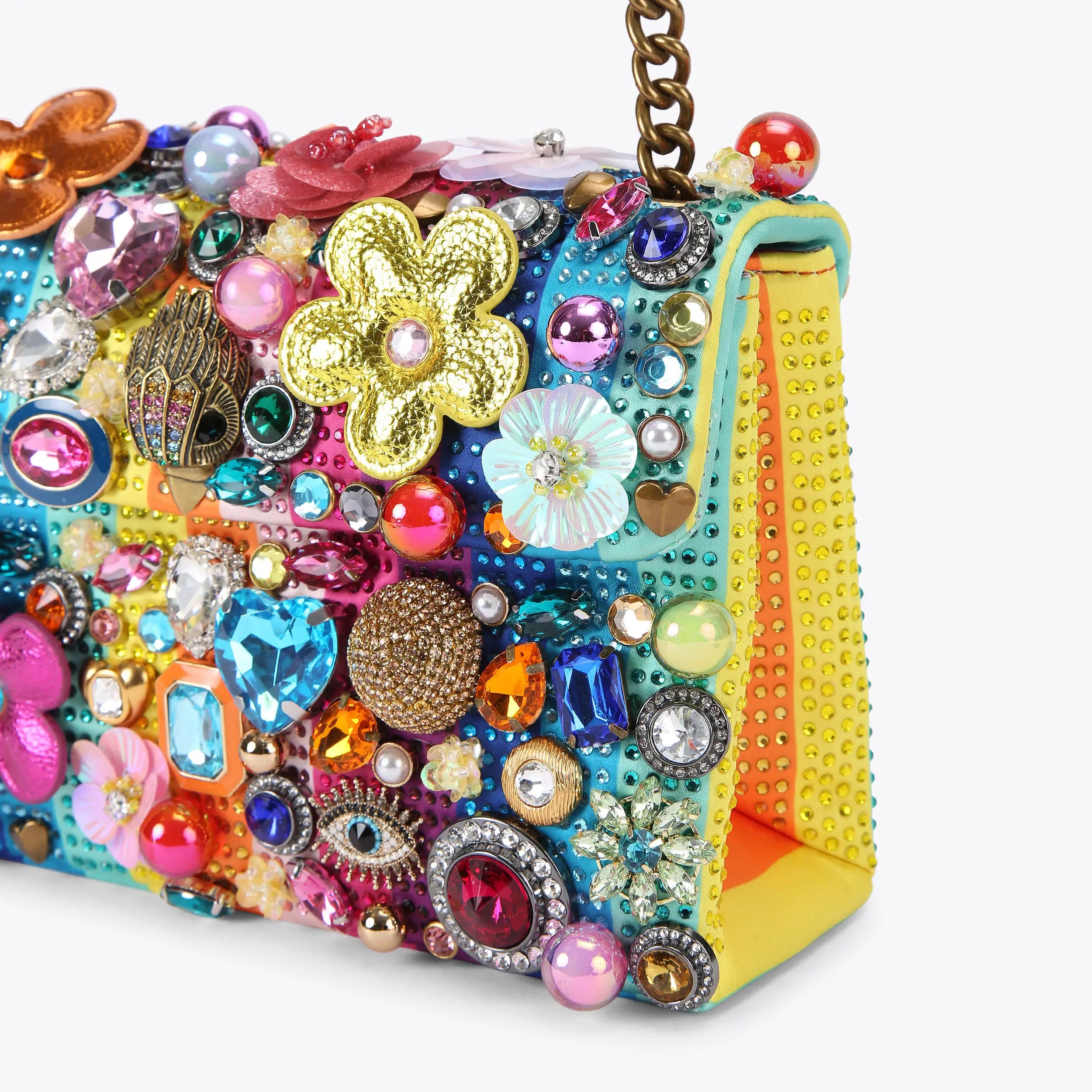 The Medium Tutti Frutti Kensington Purse is crafted in a rainbow striped satin with embellishments including the Icon Kurt Geiger eagle head, evil eye motif, crystals and 3D flowers.