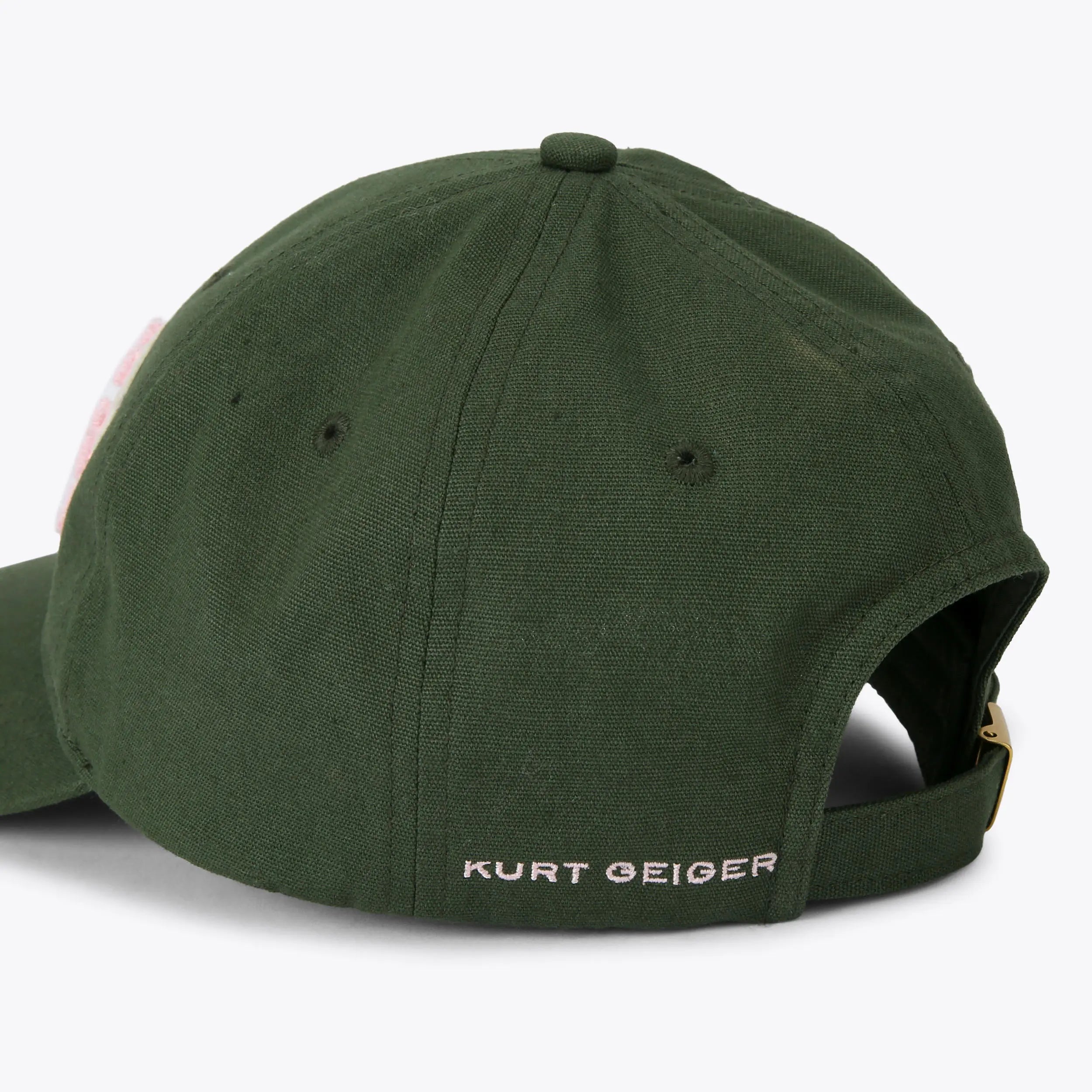 This Kurt's Motel Cap is crafted from a green cotton fabric. There is 'Kurt's Motel' to the front in a textured pink fabric.