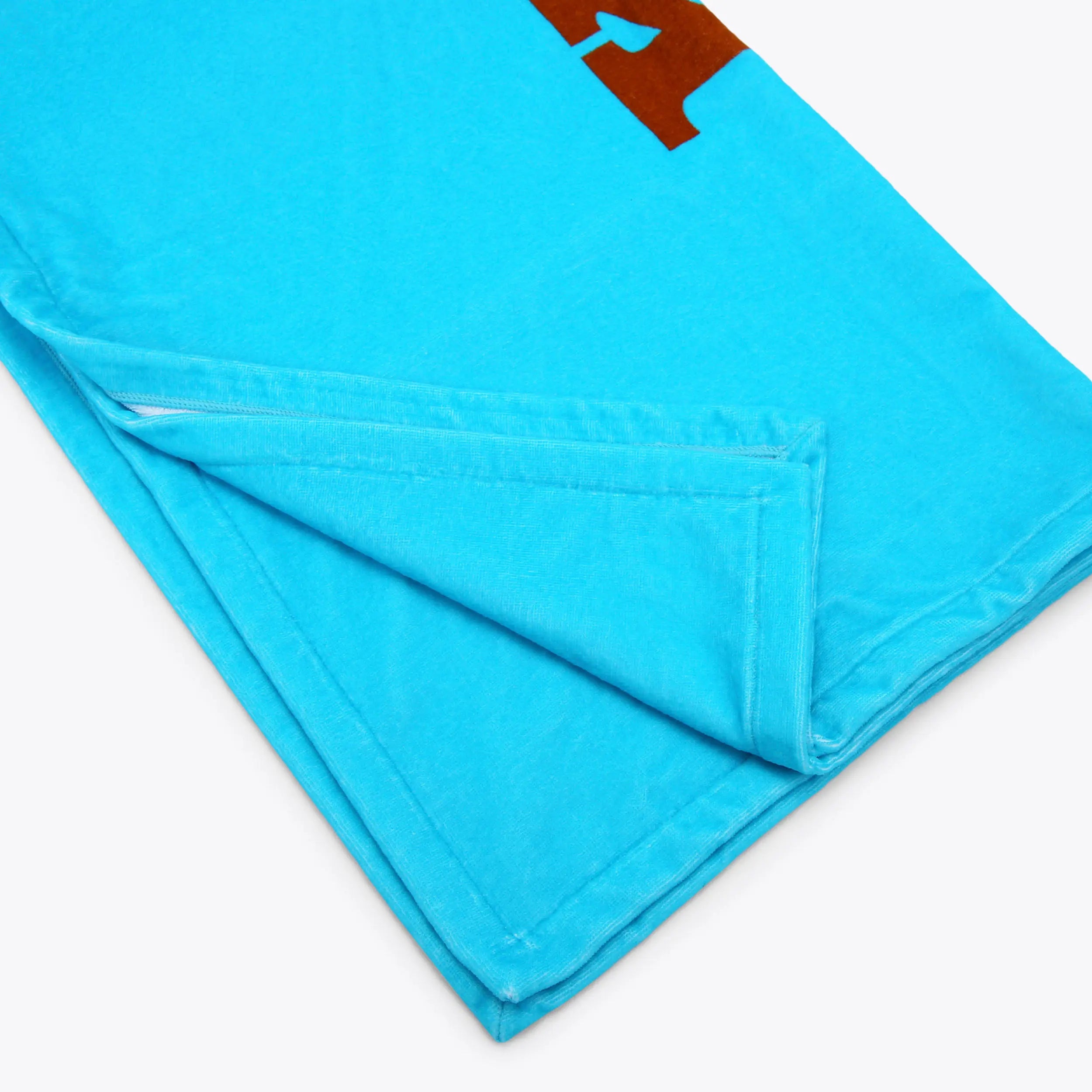 This beach towel arrives in a blue shade with orange 'Kurt's Motel' branding, perfect for days in the sunshine.