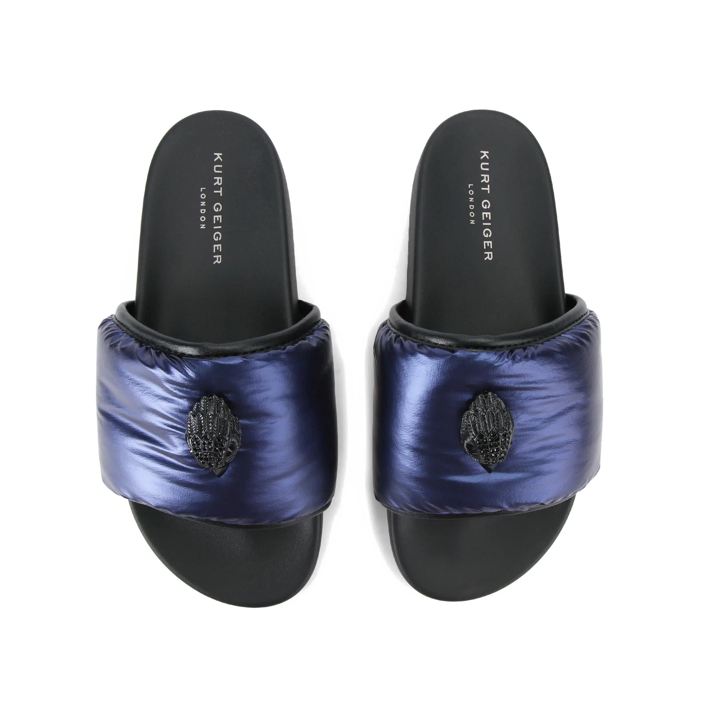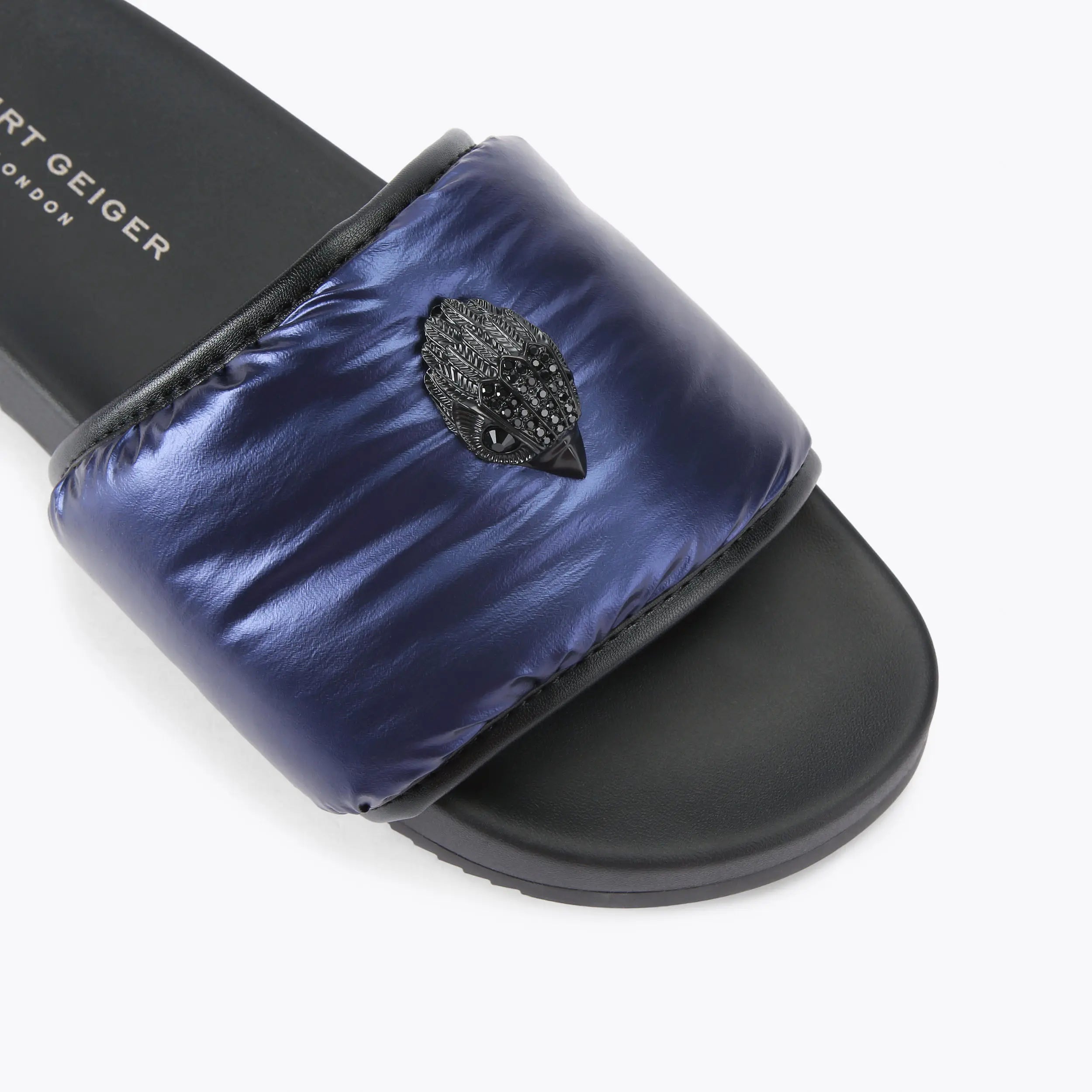 The Eagle puff Slide features a puffy blue nylon strap across the foot. There is a black eagle head sat on the strap.