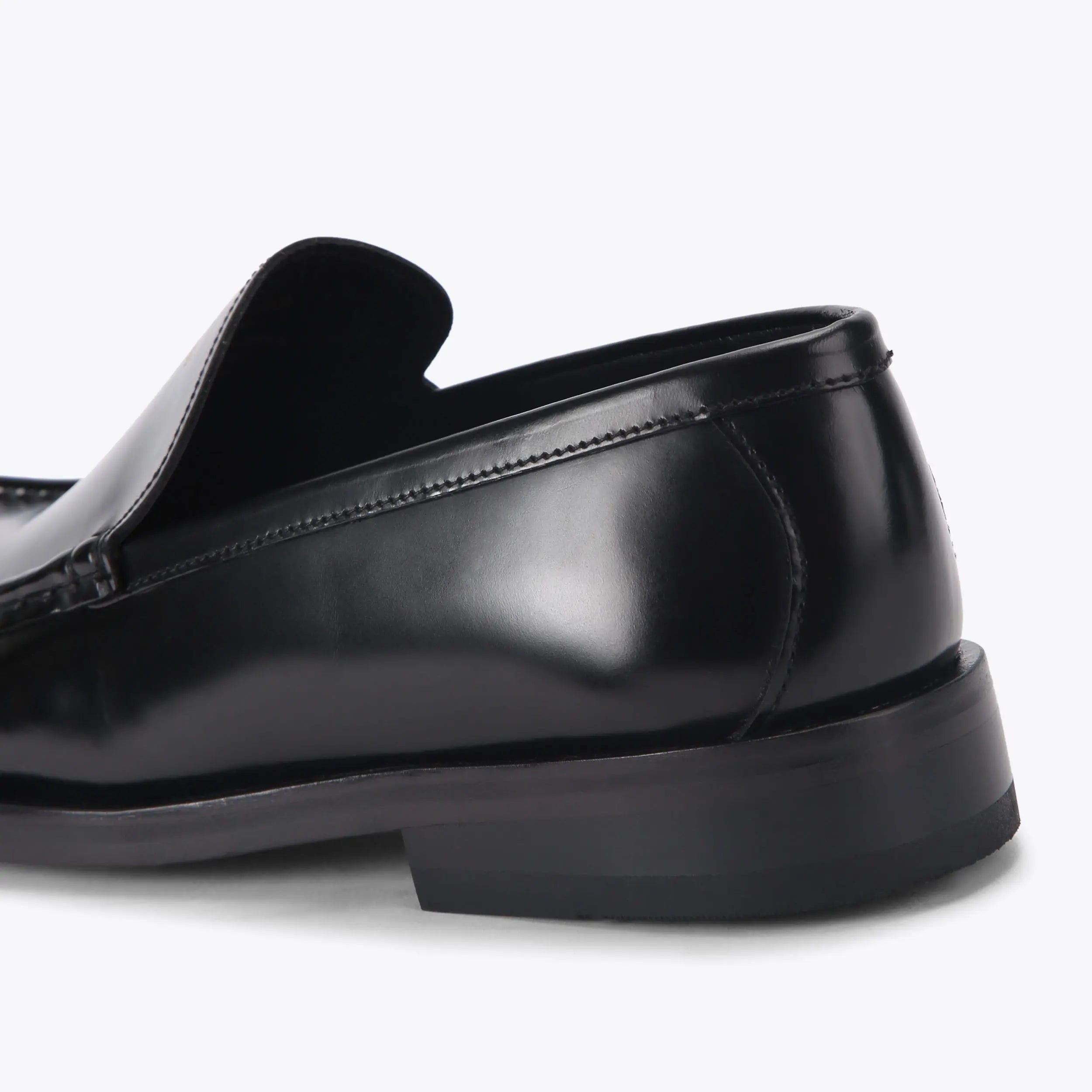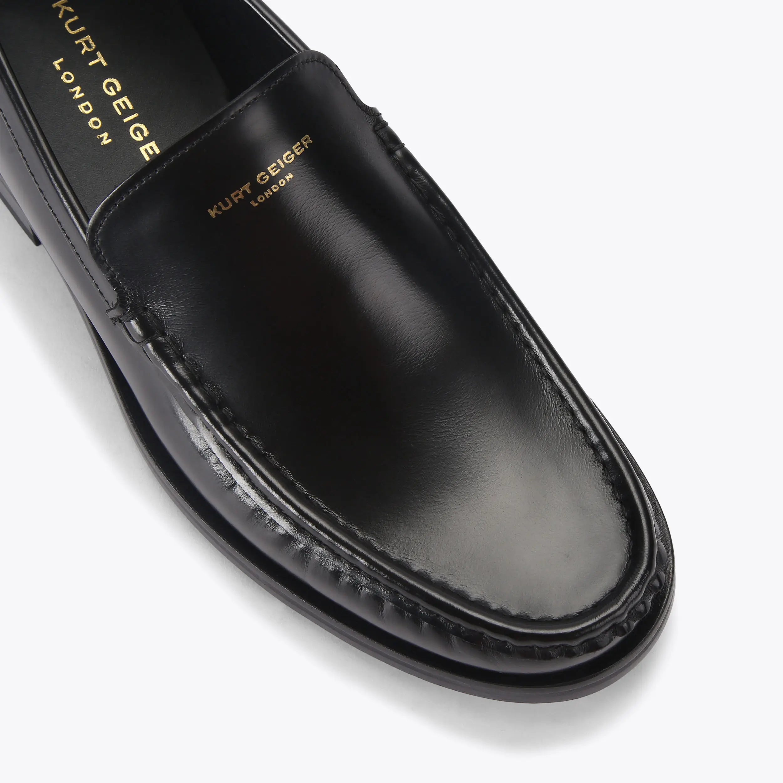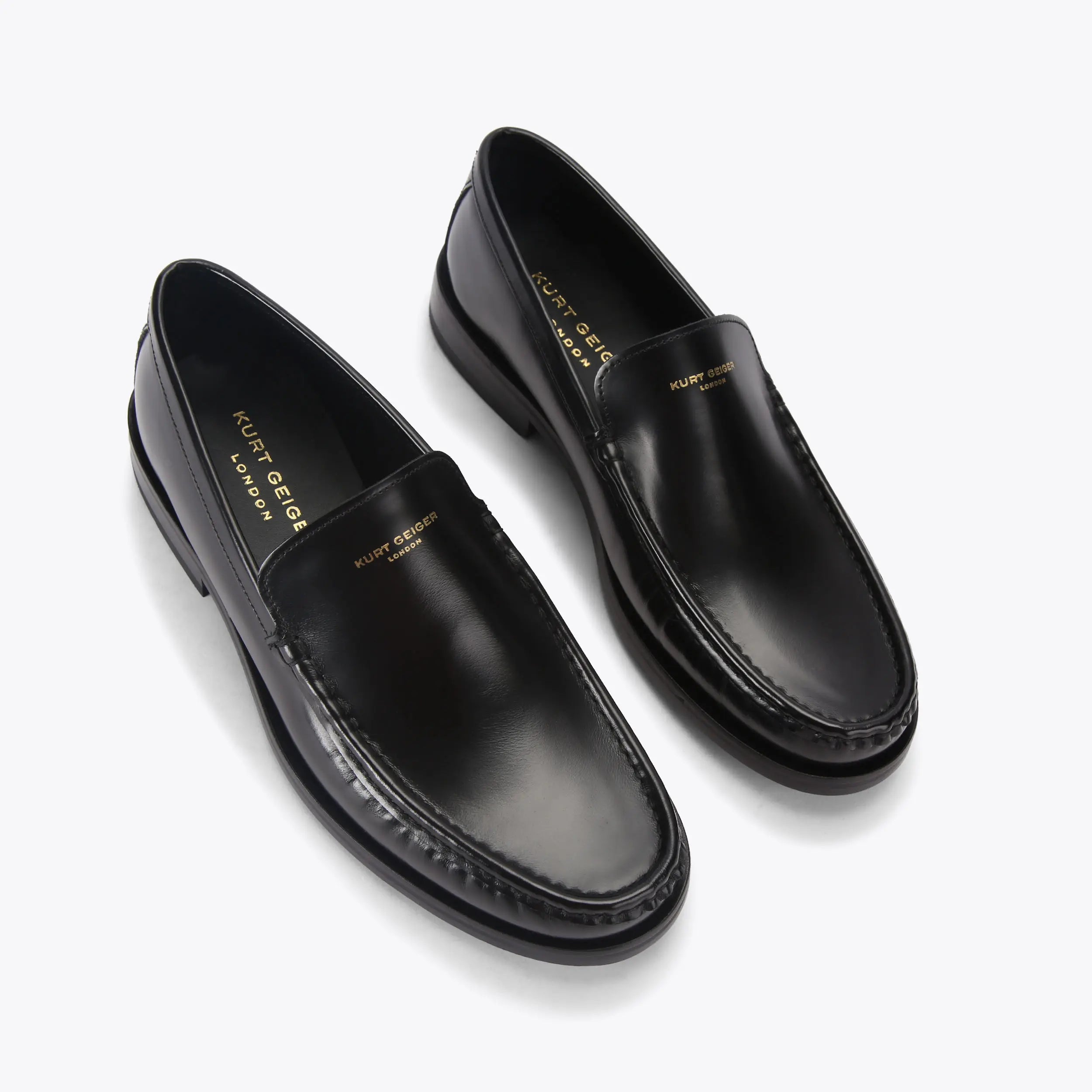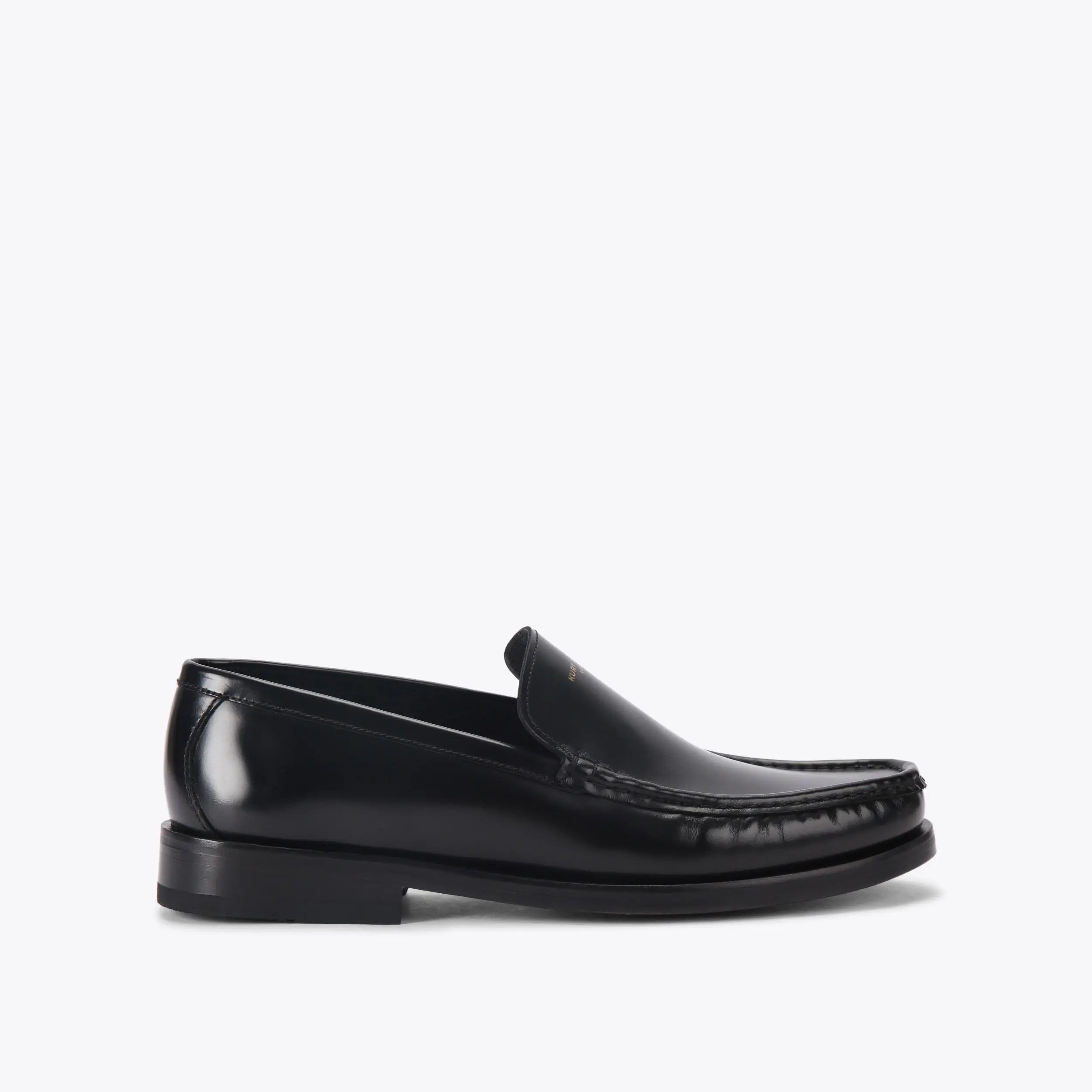 This Denman Loafer is crafted from a black shiny leather. There is simple gold foil embossed branding on the vamp.
