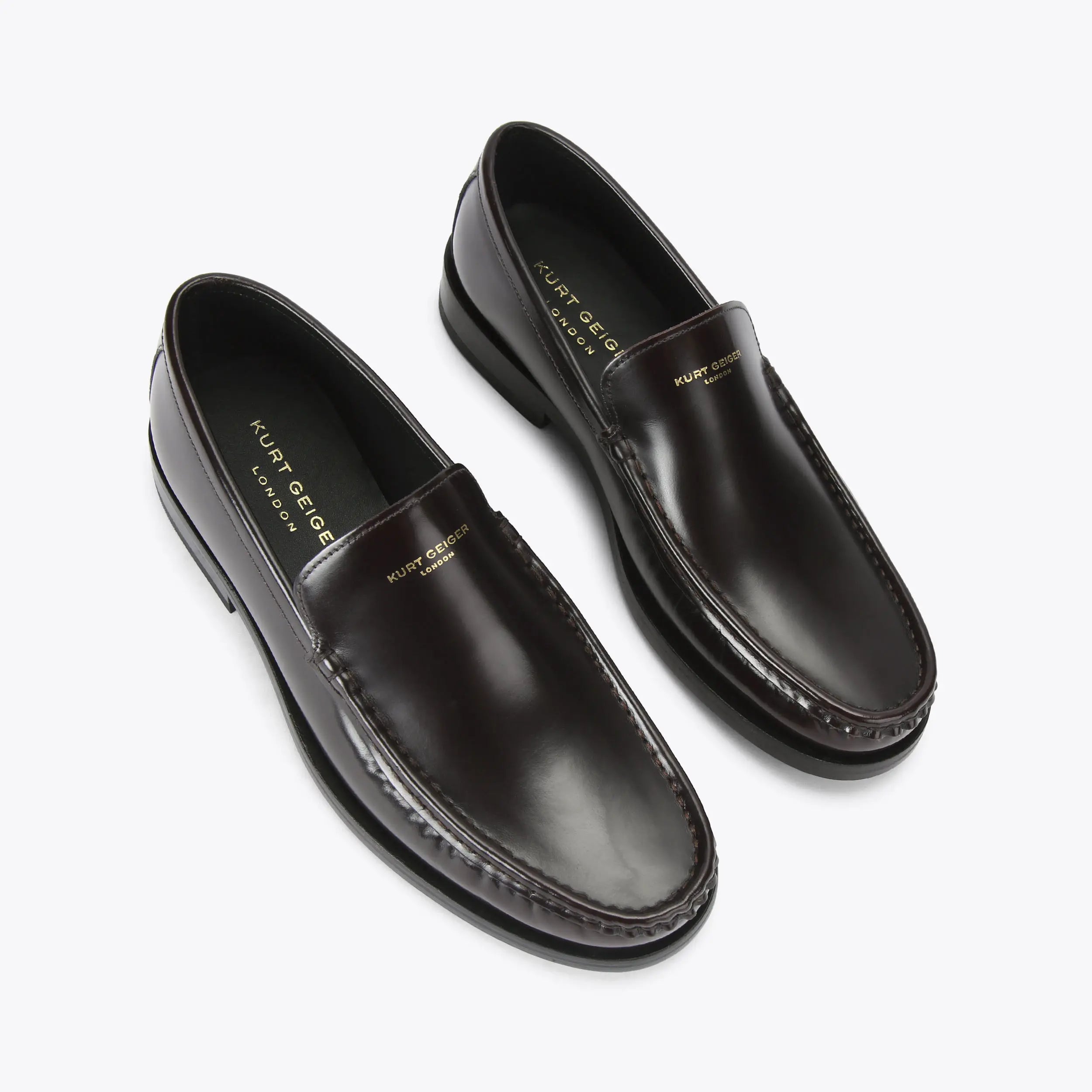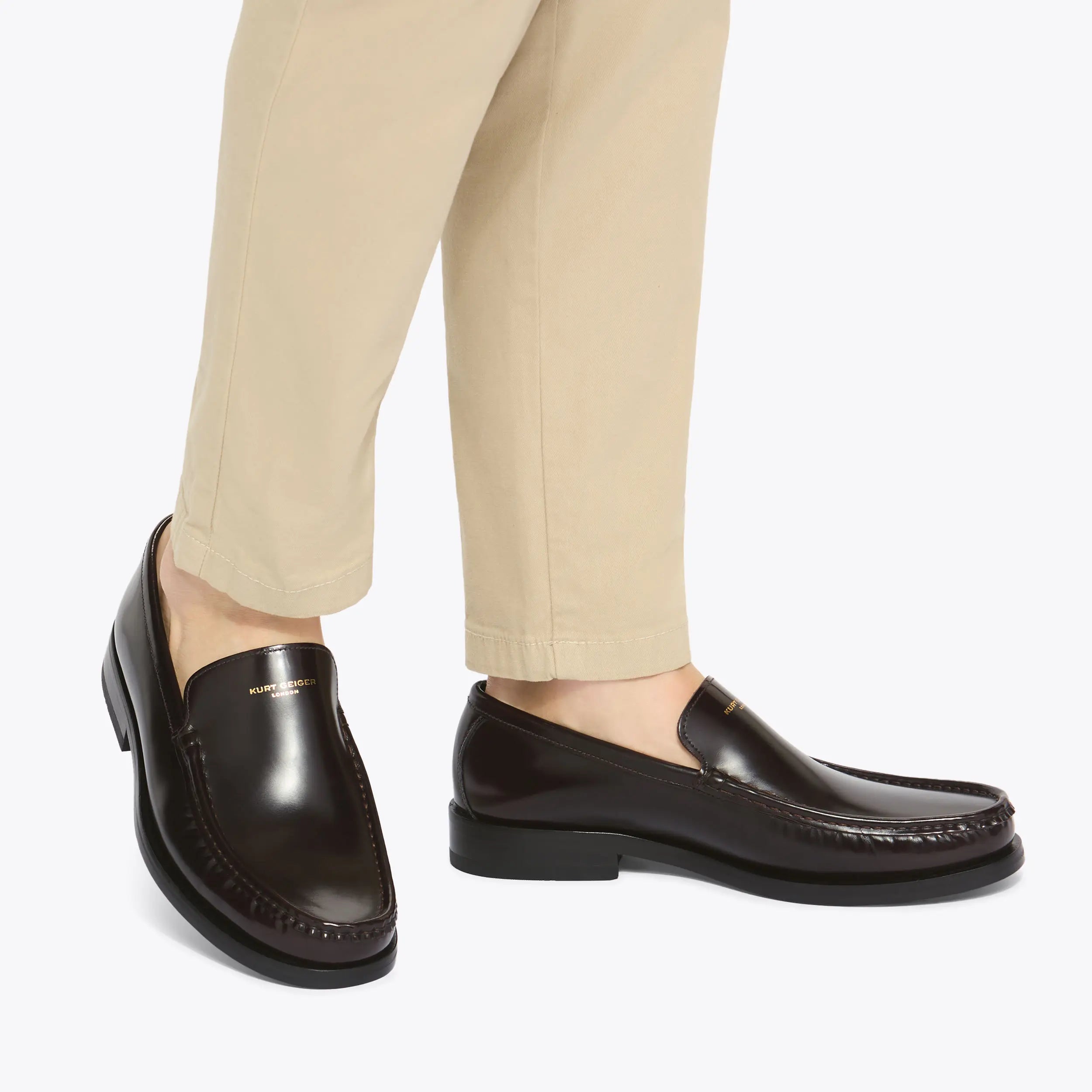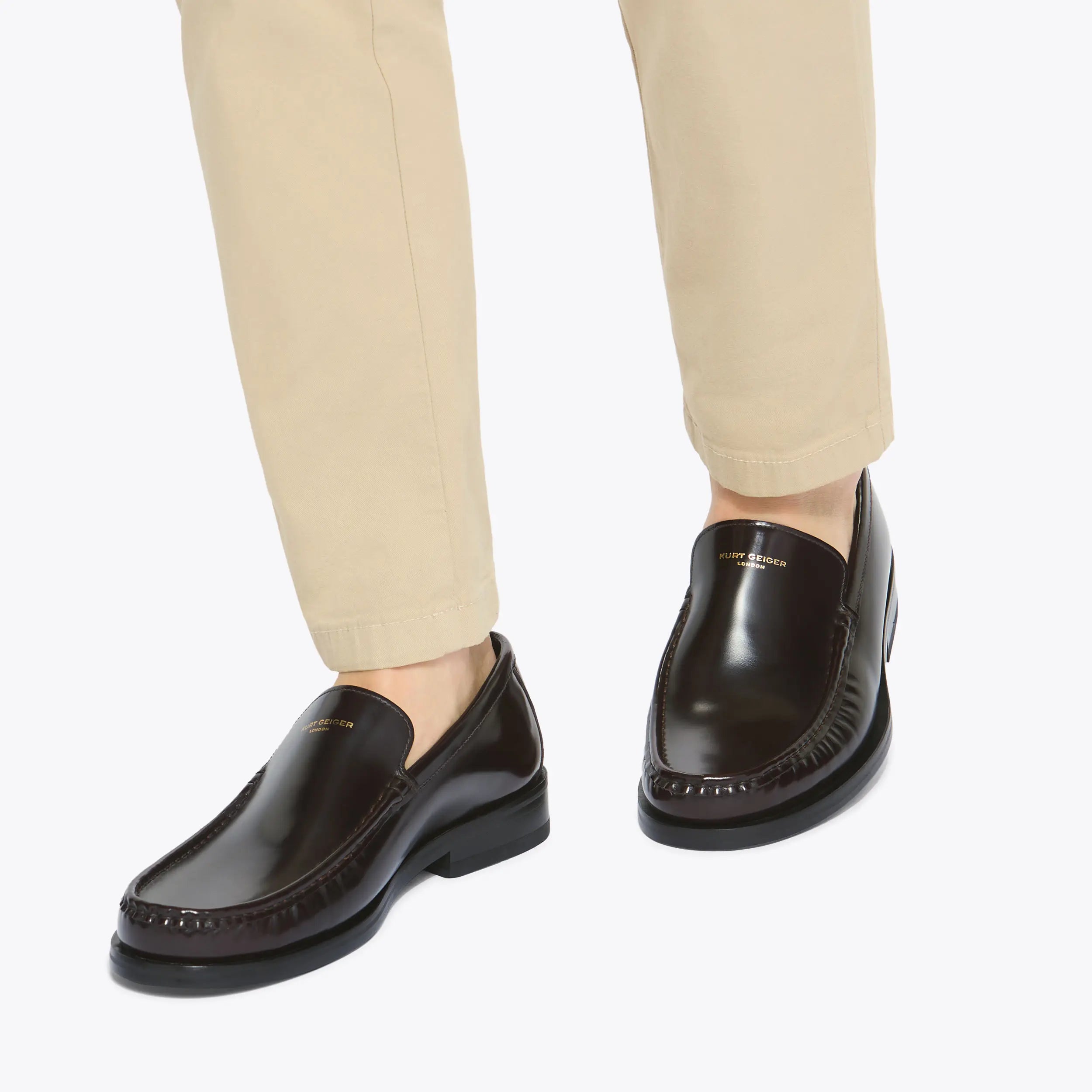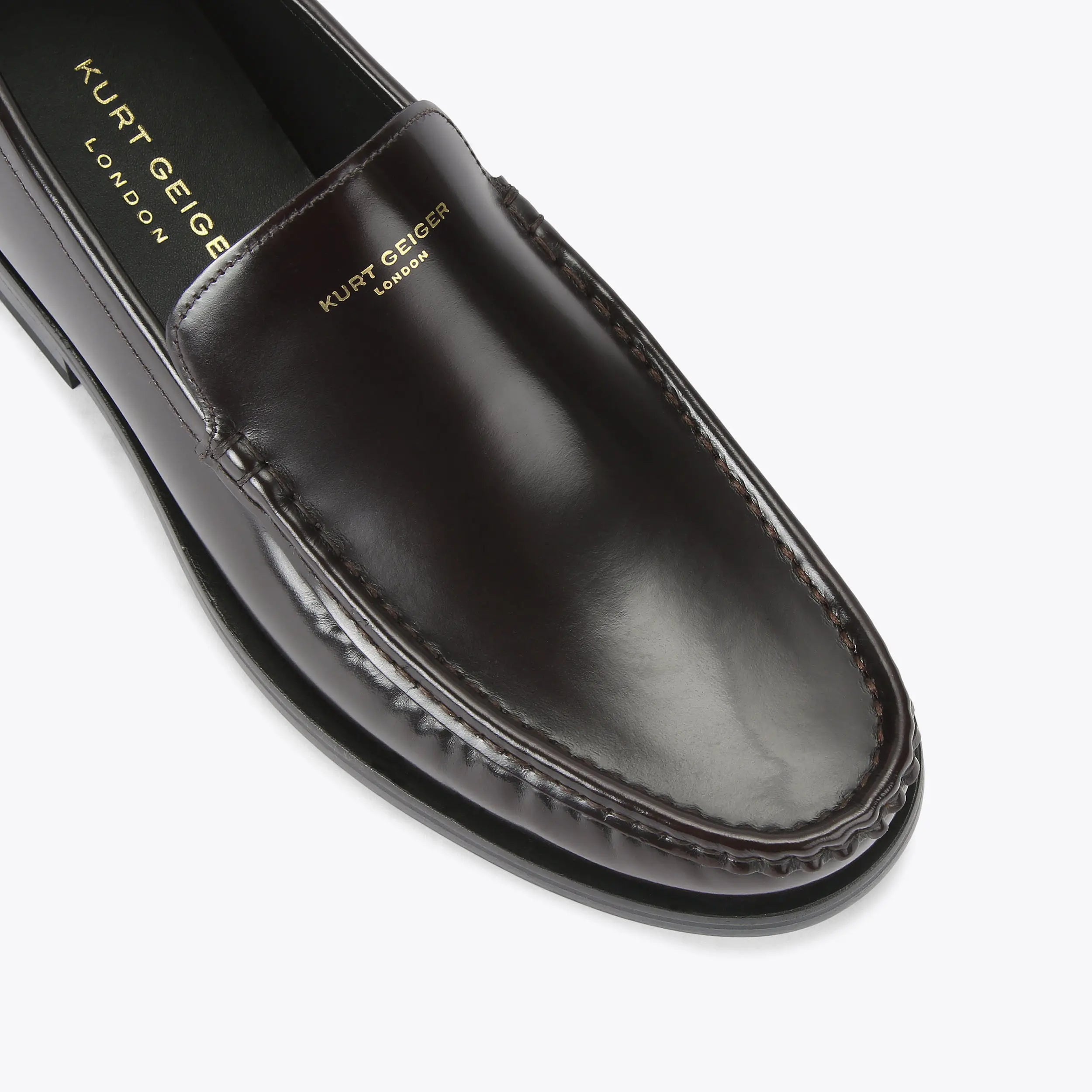 This Denman Loafer is crafted from a wine shiny leather. There is simple gold foil embossed branding on the vamp.