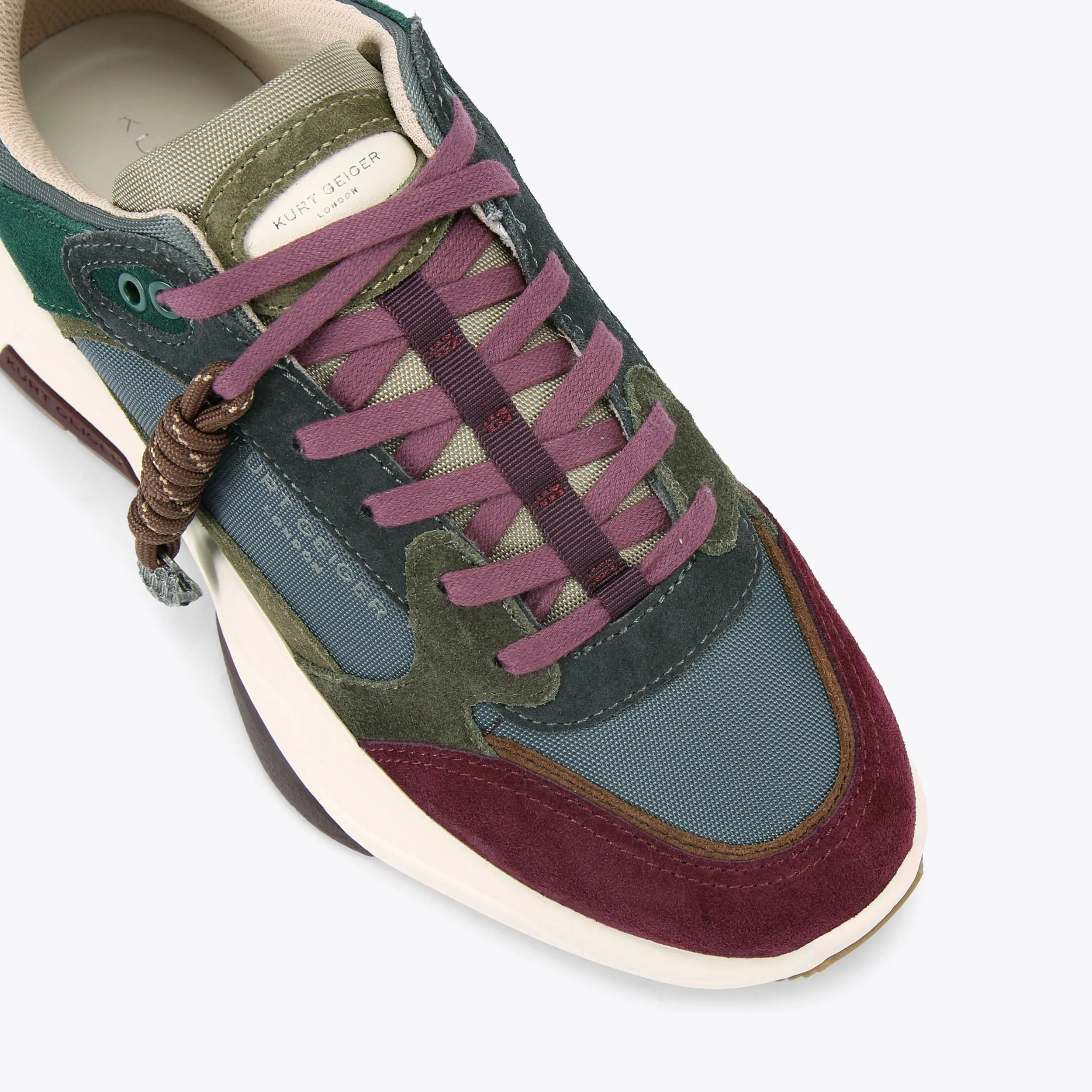 This Rosyton Sneaker arrives in a muted green and red chunky style. There is a statement brown fabric tag with an antiqued silver eagle head attached to the laces.