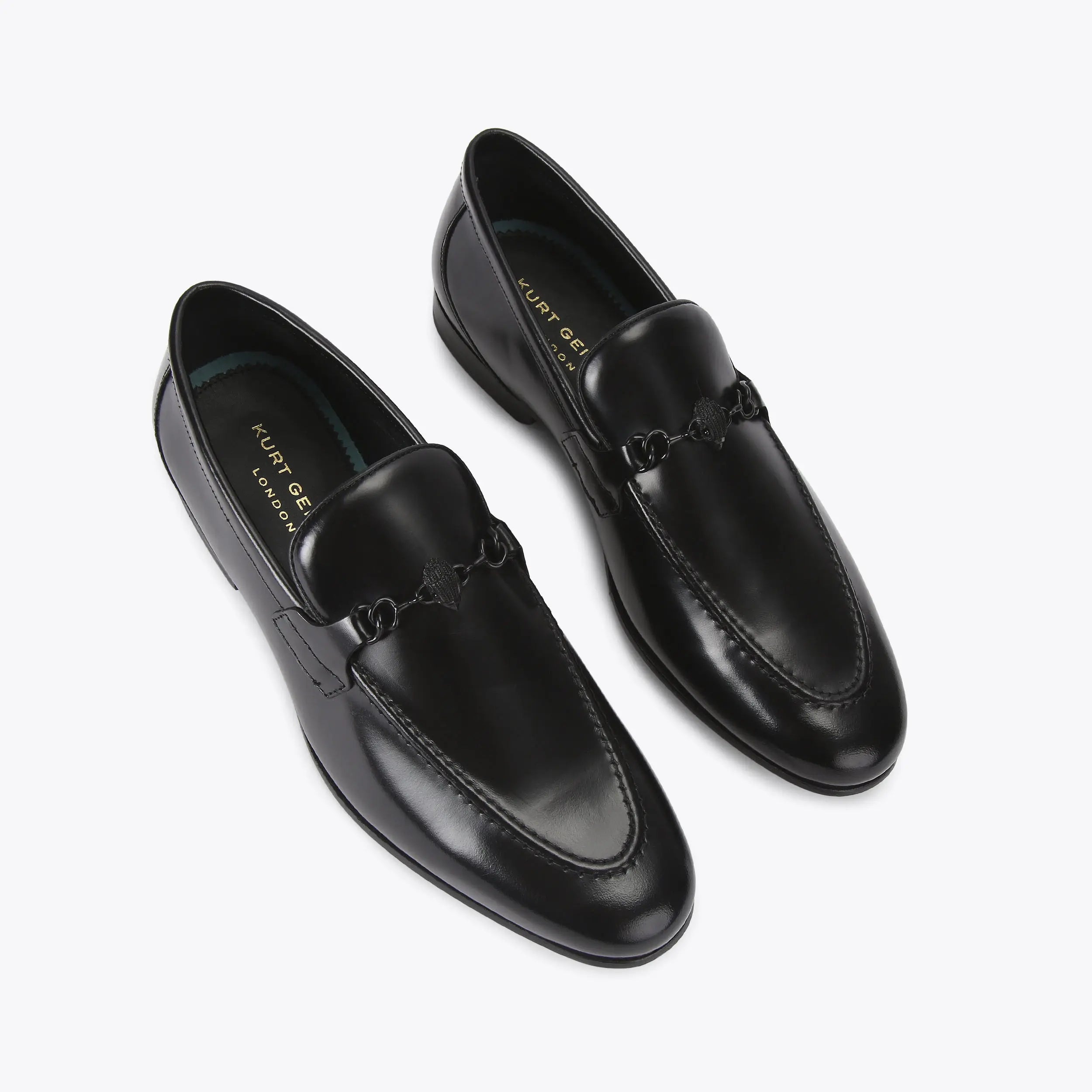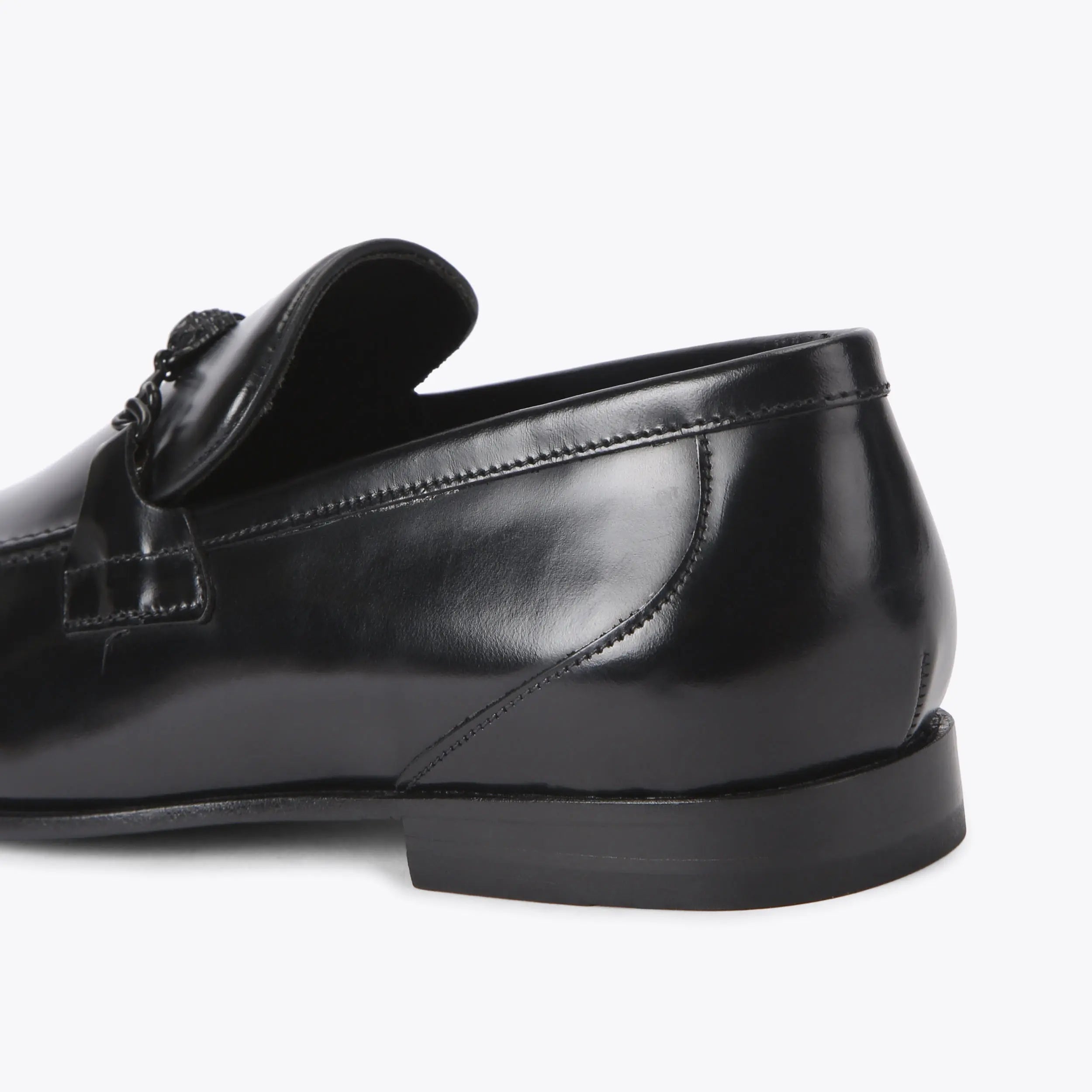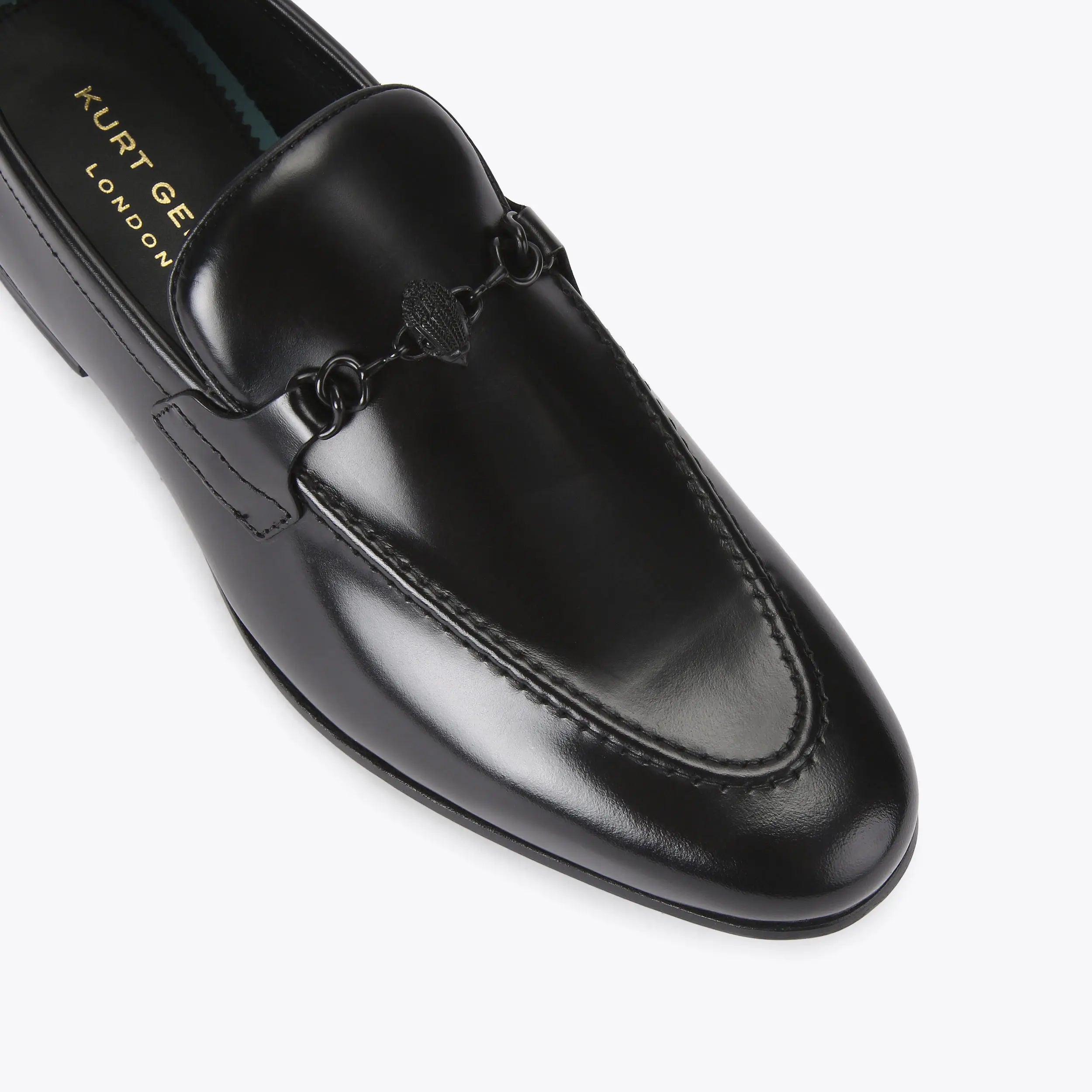 The Alton Brush Off Loafer is crafted from a black smooth leather with rounded toe. There is a black eagle head in the centre of a horsebit style chain detail on the toe.