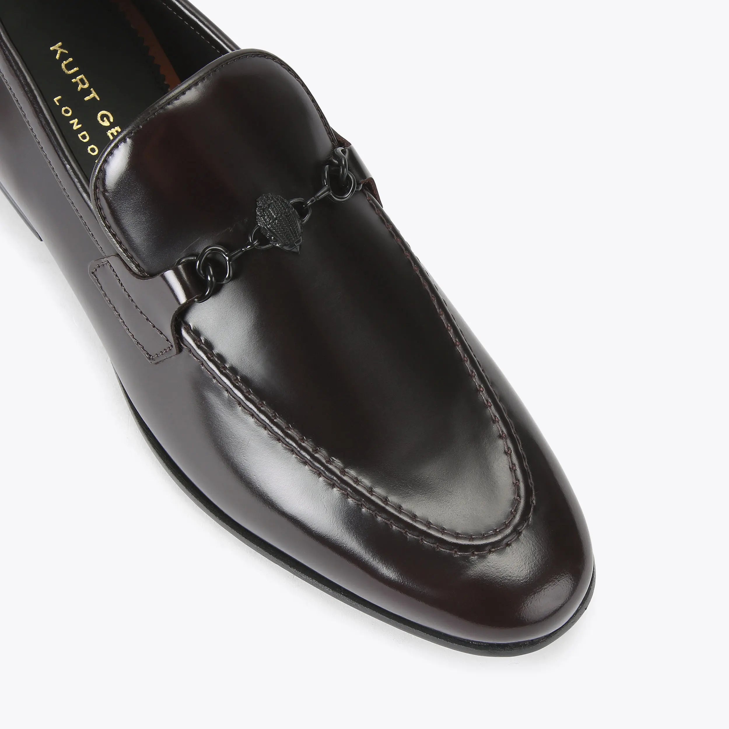 The Alton Brush Off Loafer is crafted from a wine smooth leather with rounded toe. There is a black eagle head in the centre of a horsebit style chain detail on the toe.