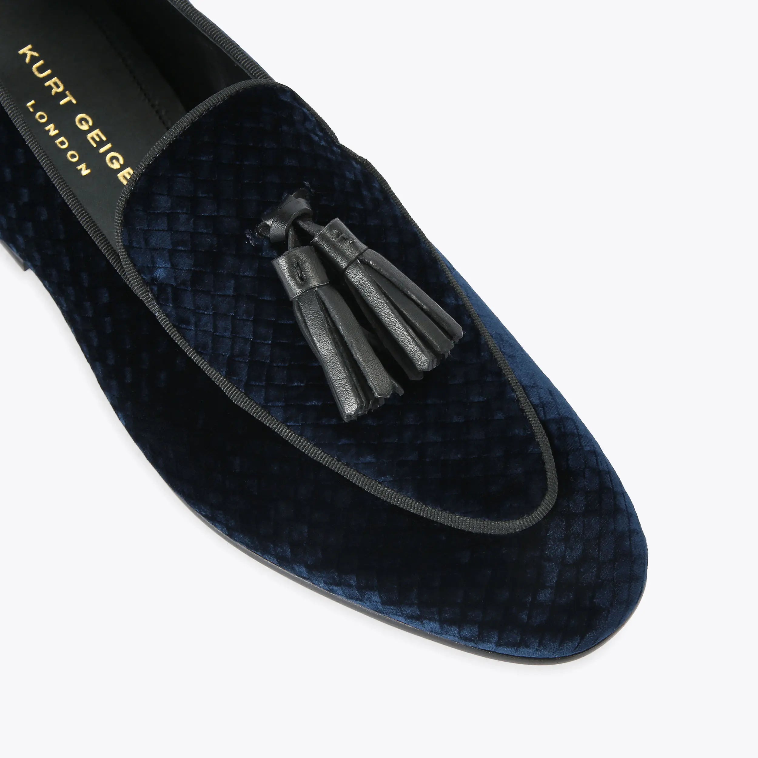 This Bedford Tassel Loafer is crafted from a navy velvet with snake embossing. There is a black leather tassel detail on top of the vamp.