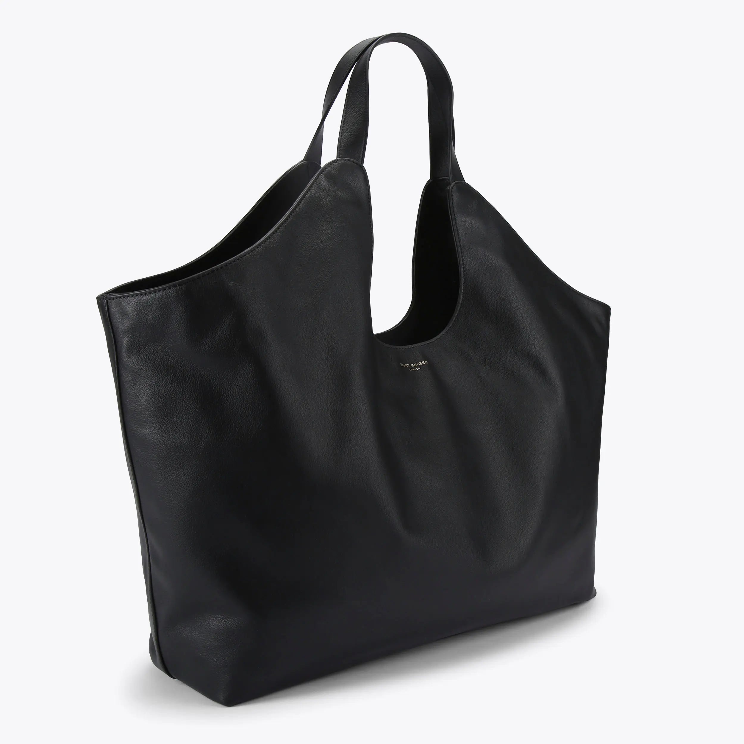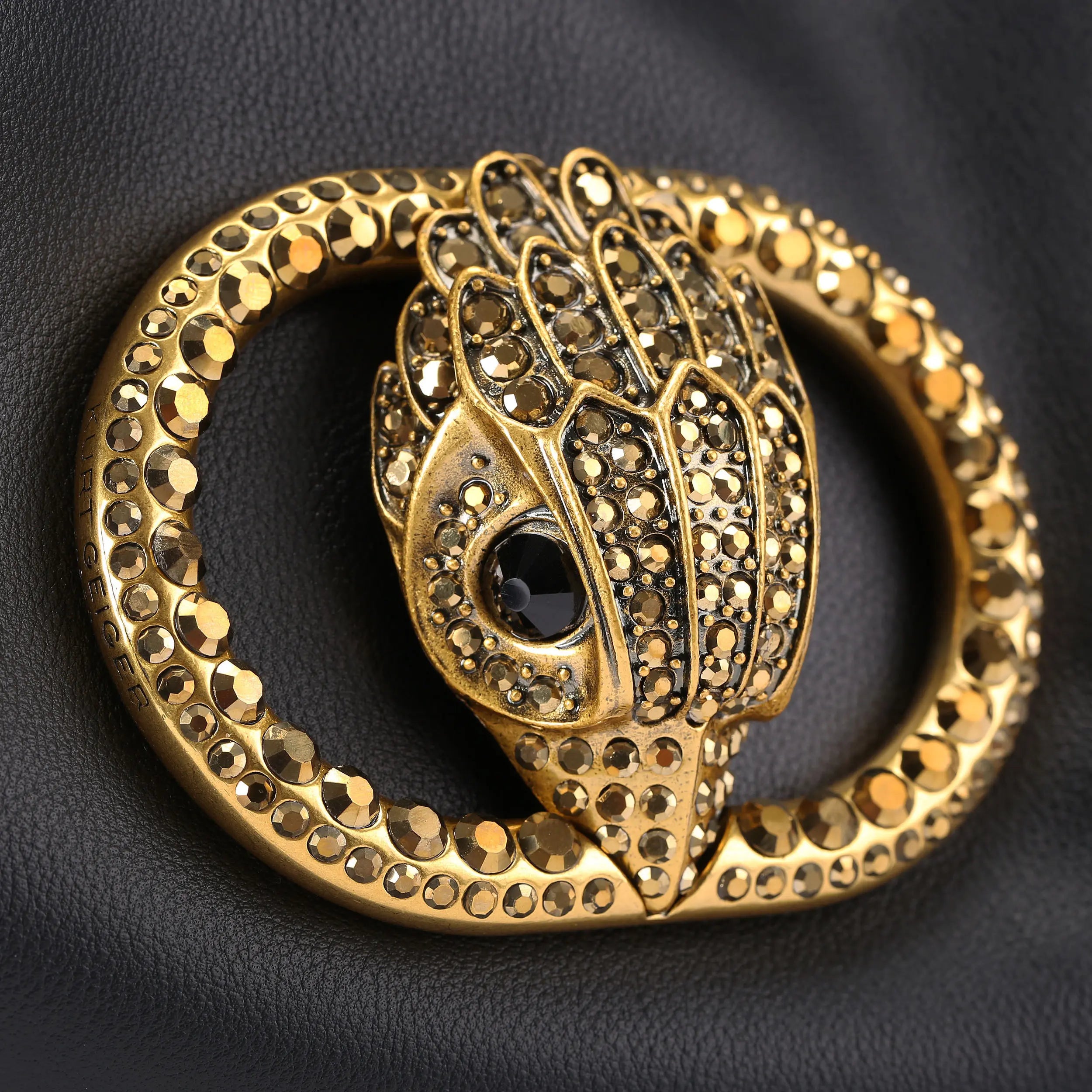 This XXL Chelsea Soft Tote Purse arrives in a black leather. There is an oversized antiqued brass oval trim with eagle head at the centre on the front of the bag.