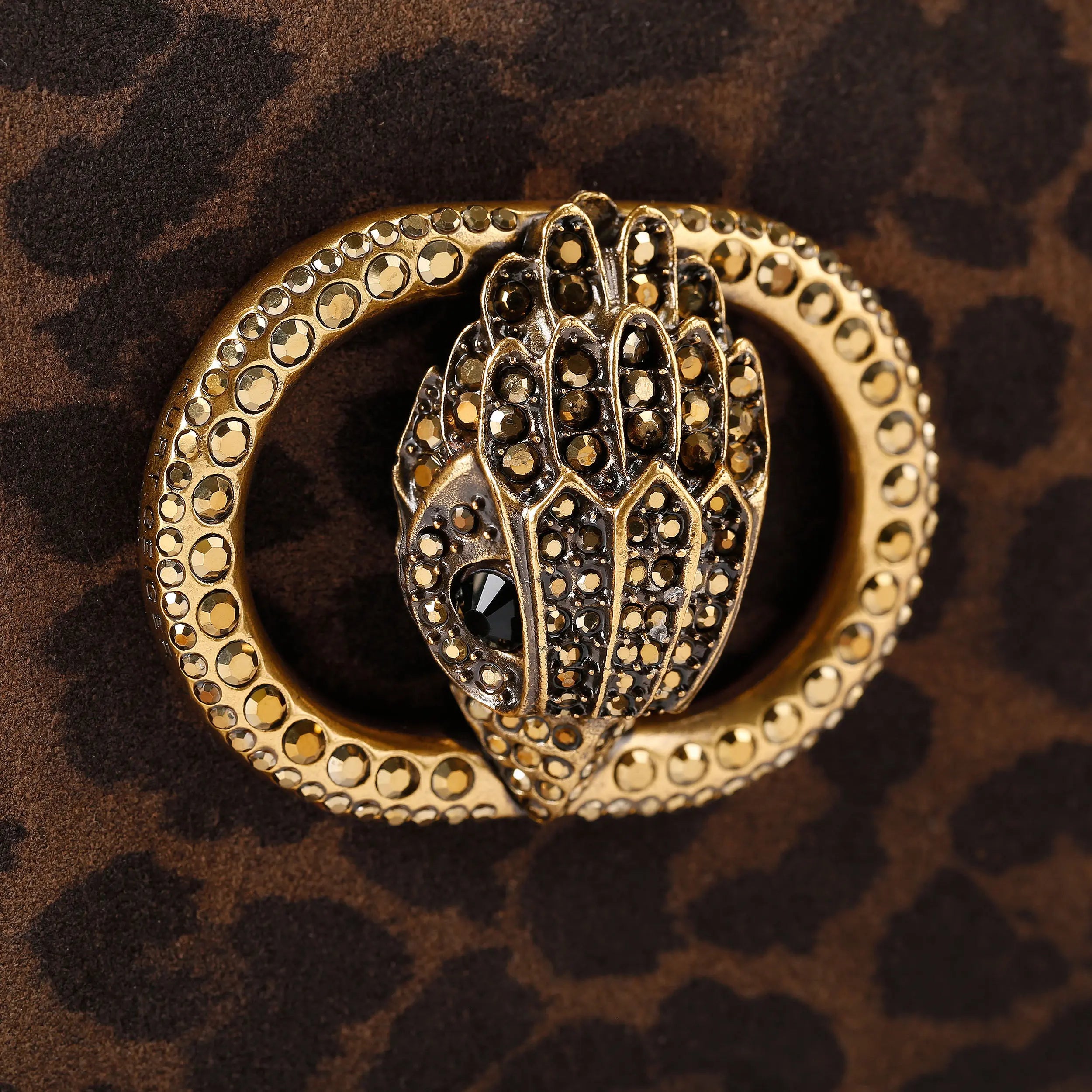This Soft Chelsea Shoulder Purse is crafted from a leopard print suede leather. There are dark brown croc embossed leather trims and two antiqued brass buckles on either side of the shoulder strap.