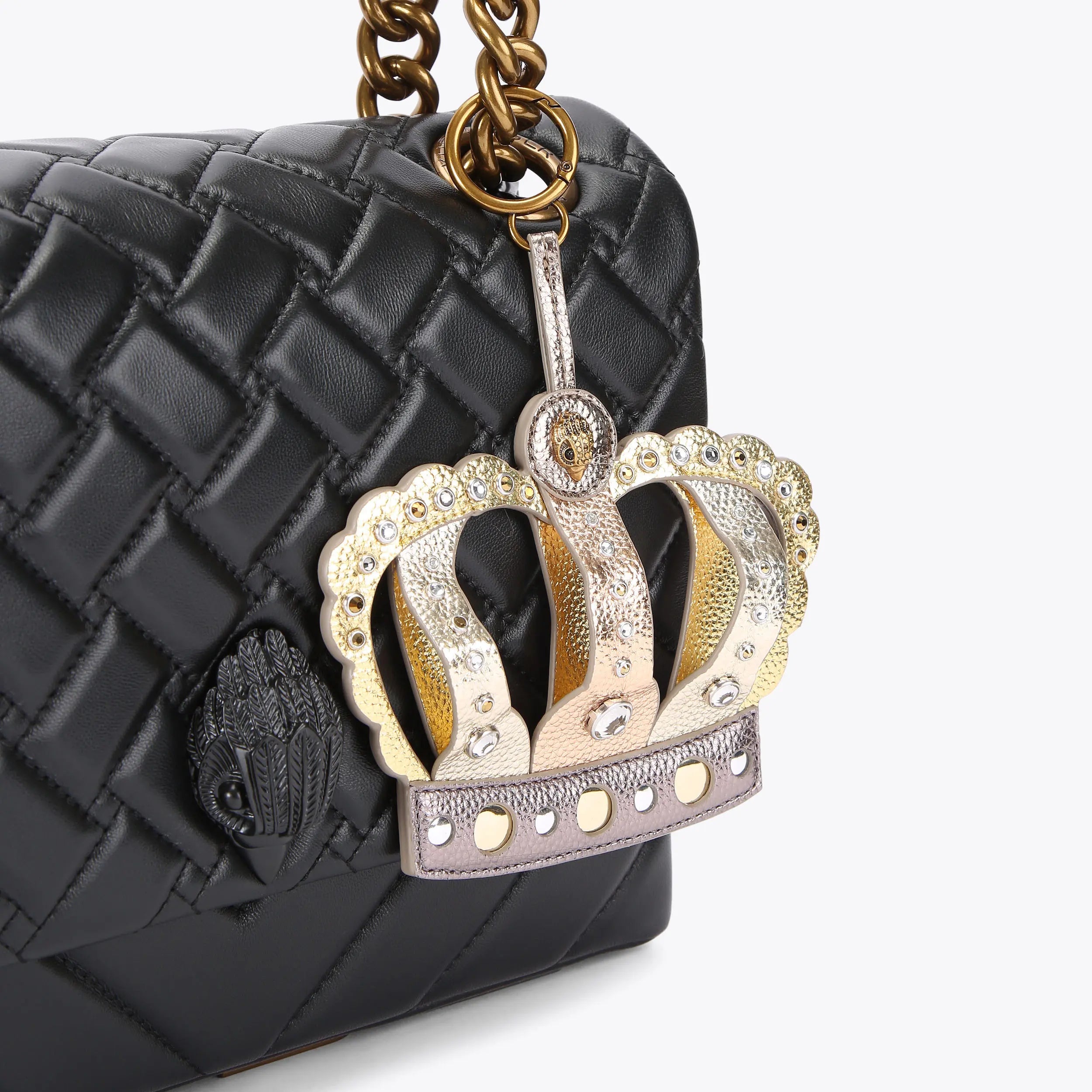 The Crown Charm is an oversized leather alternative keyring to attach to your favourite Kurt Geiger purse. The 3D crown is comprised of metallic pebble grained base which is embellished with crystals.