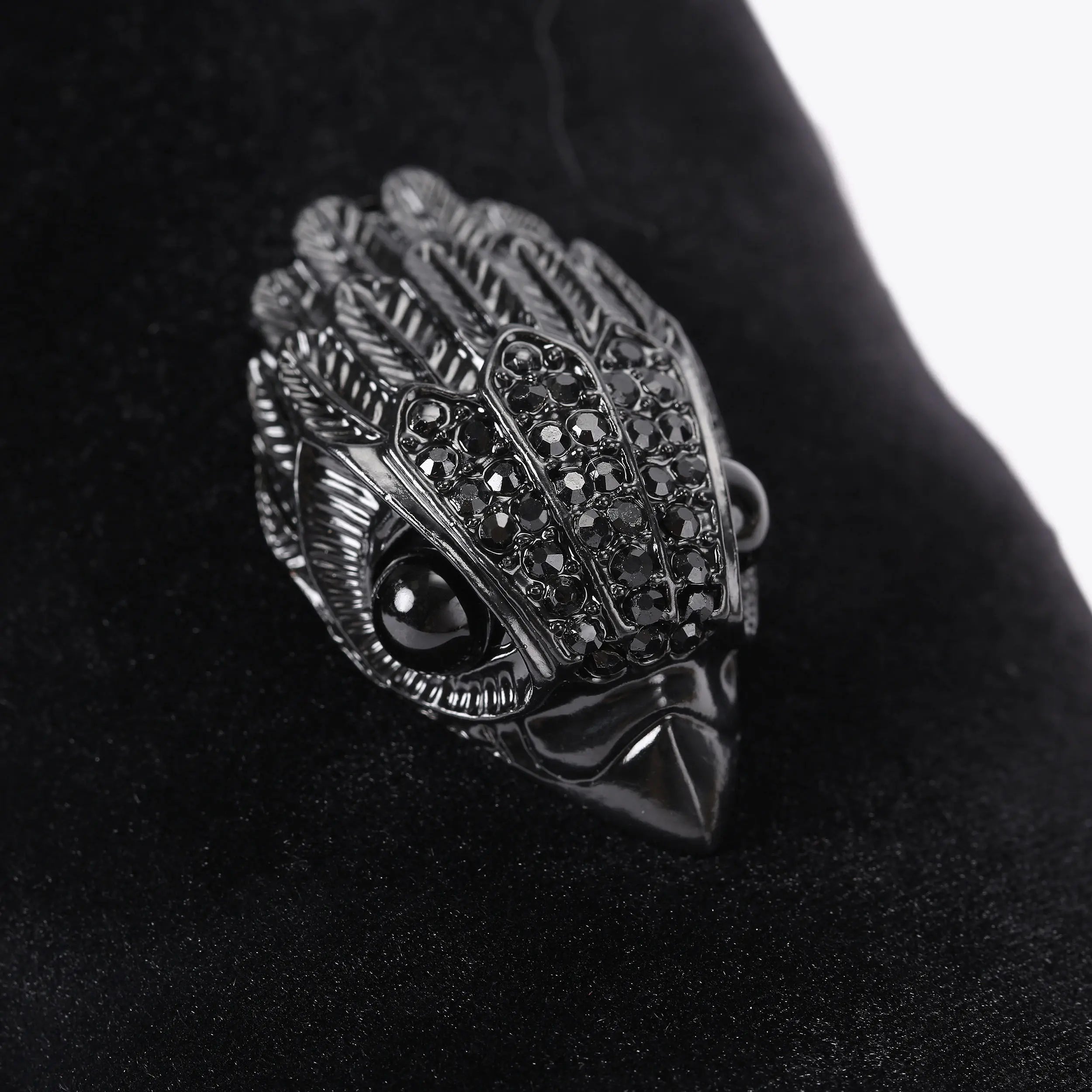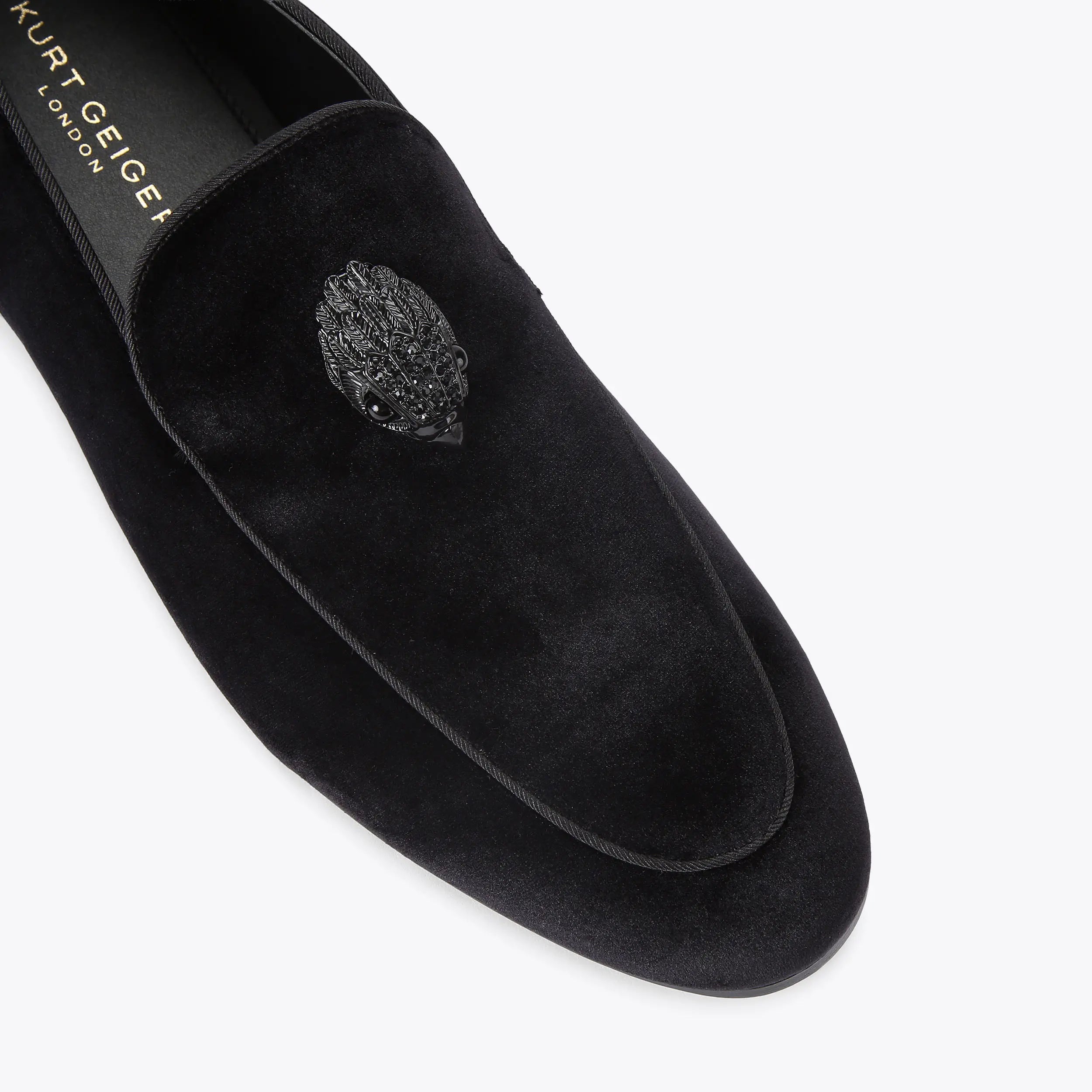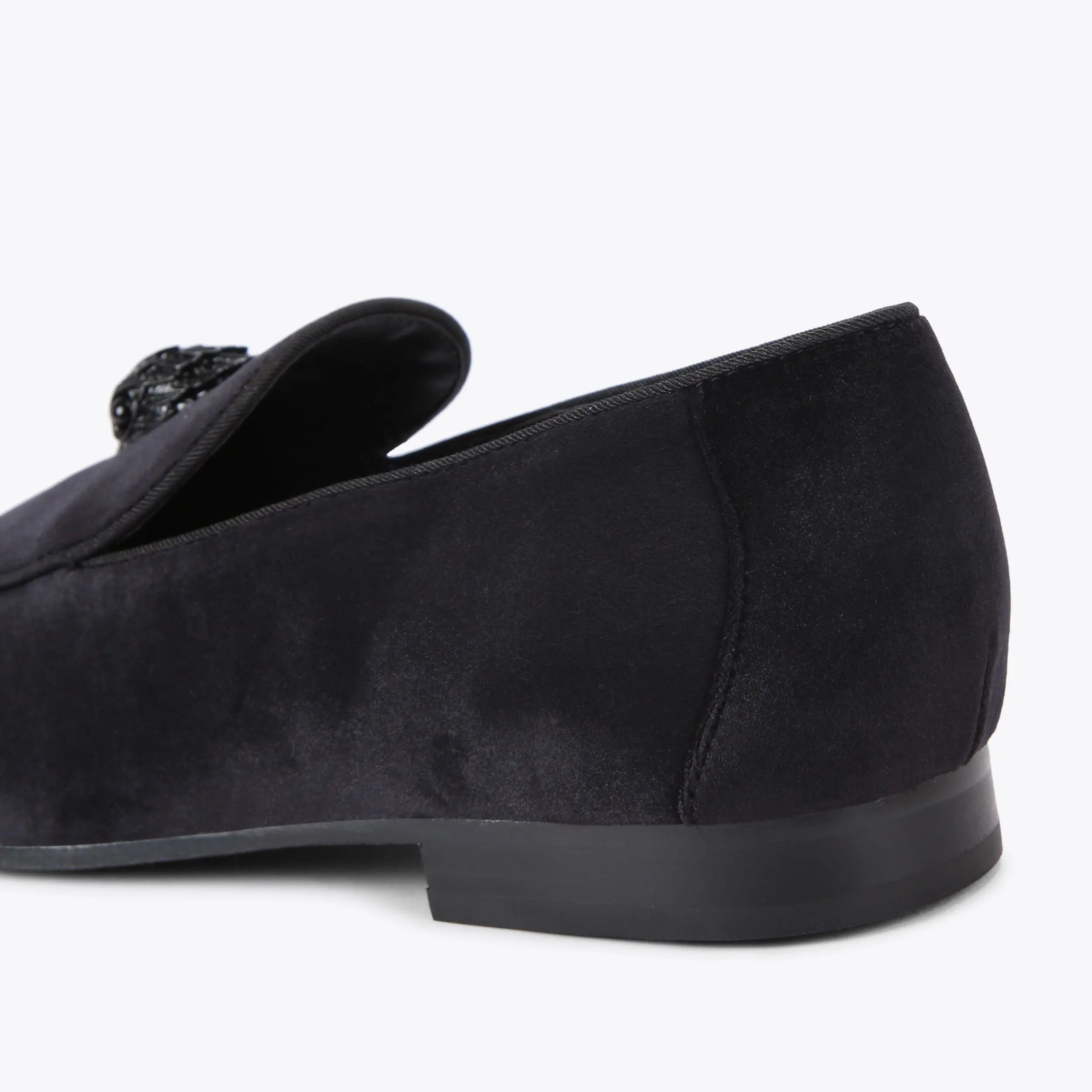The Hugh Eagle Velvet loafer has a black velvet upper. The vamp is topped with a black metal eagle head emblem with crystals.