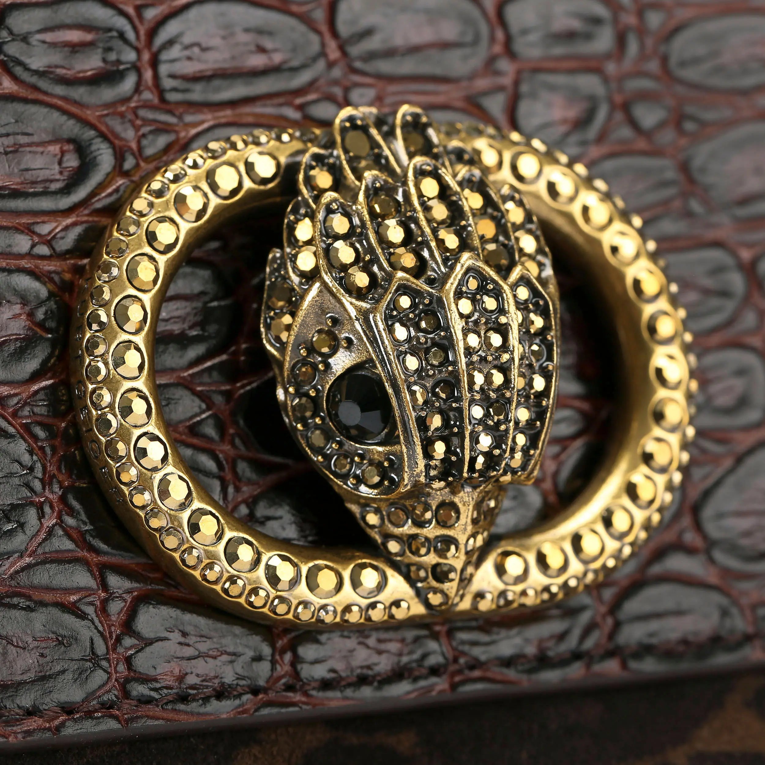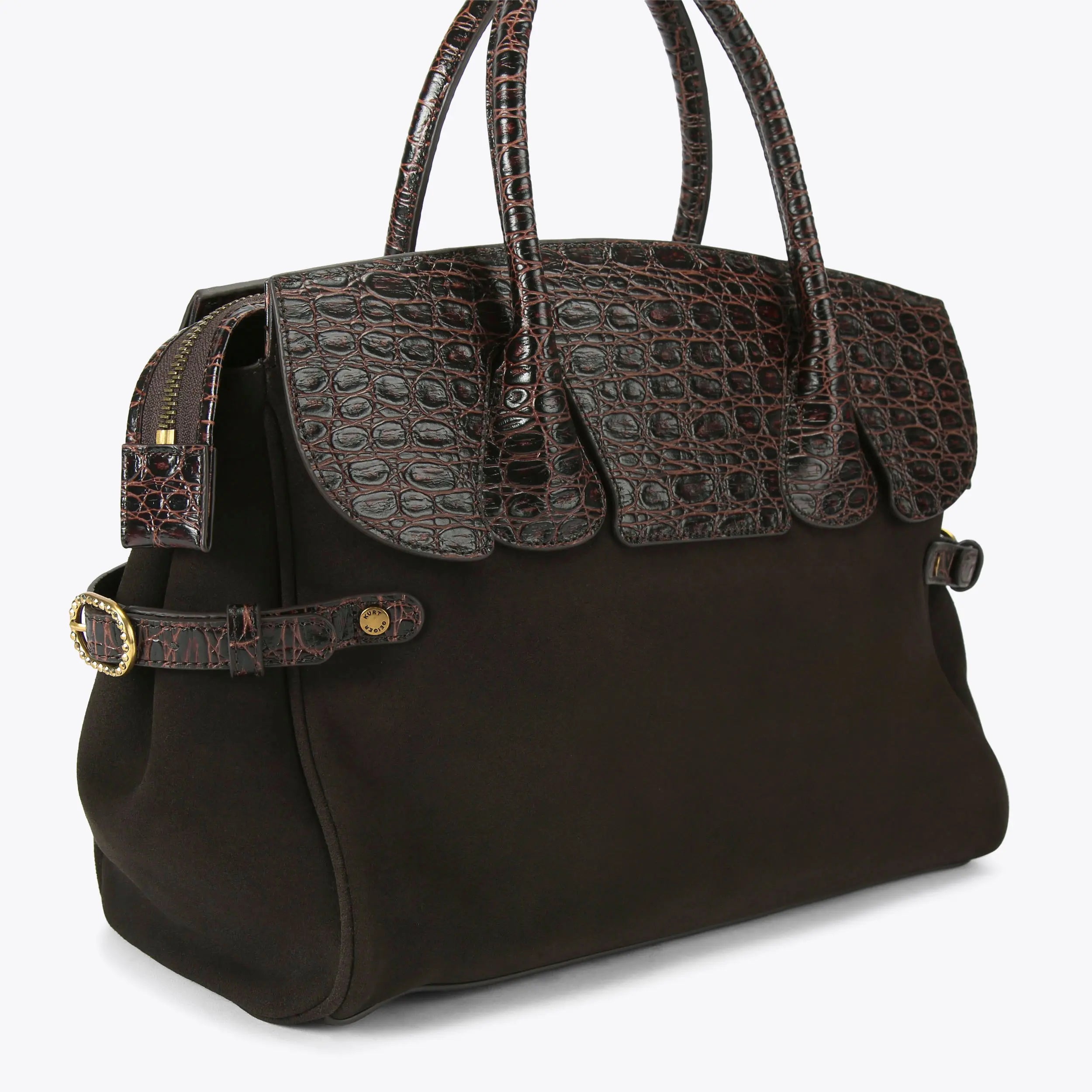 This Chelsea Drench Tote is crafted from a dark brown suede leather and the flap is embossed in a croc embossed style. There is an antiqued brass oval trim with eagle head at the centre embellished with crystals.