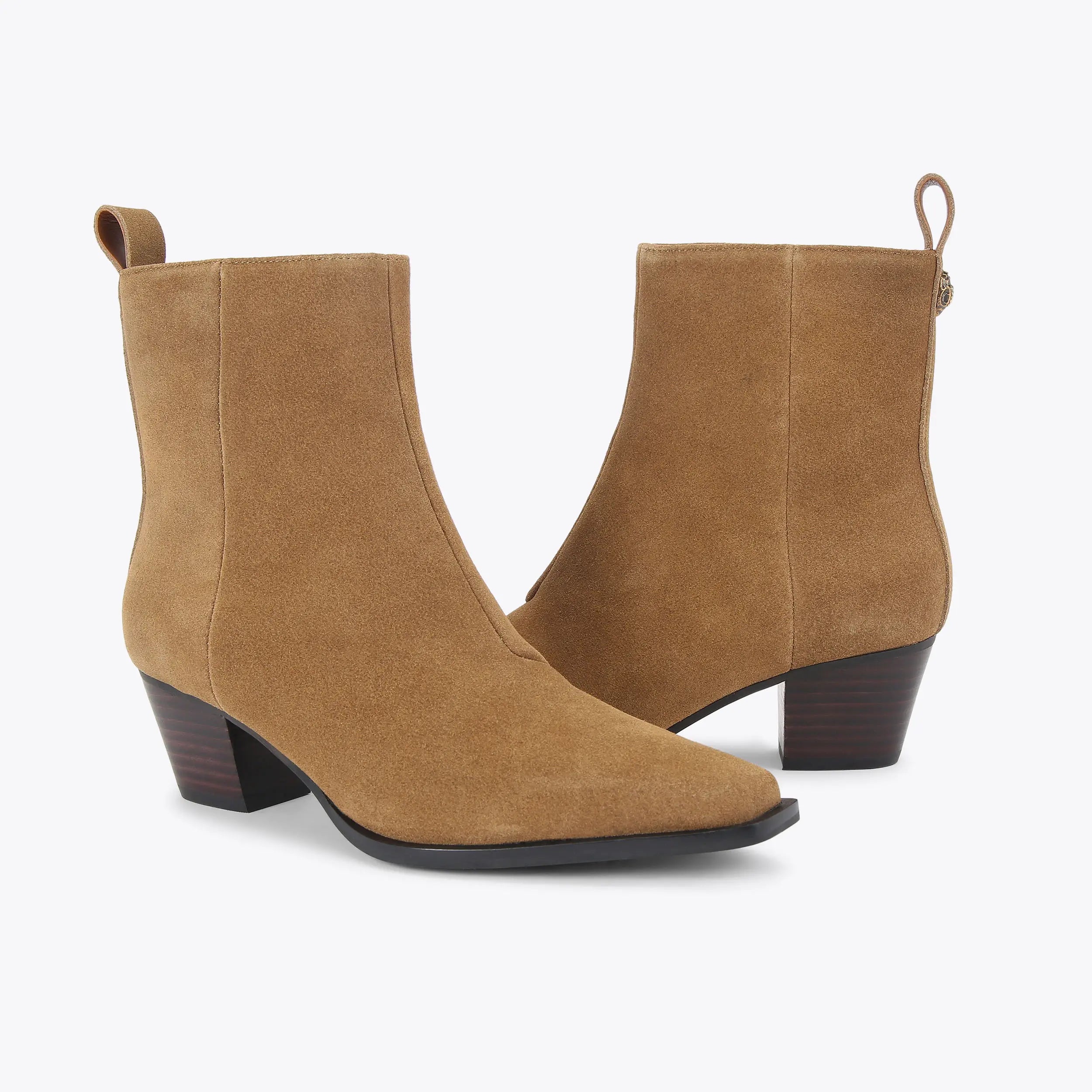 This Mini Eagle Ankle Boot arrives in a brown suede leather. There is a small antiqued brass eagle head at the back of the ankle.