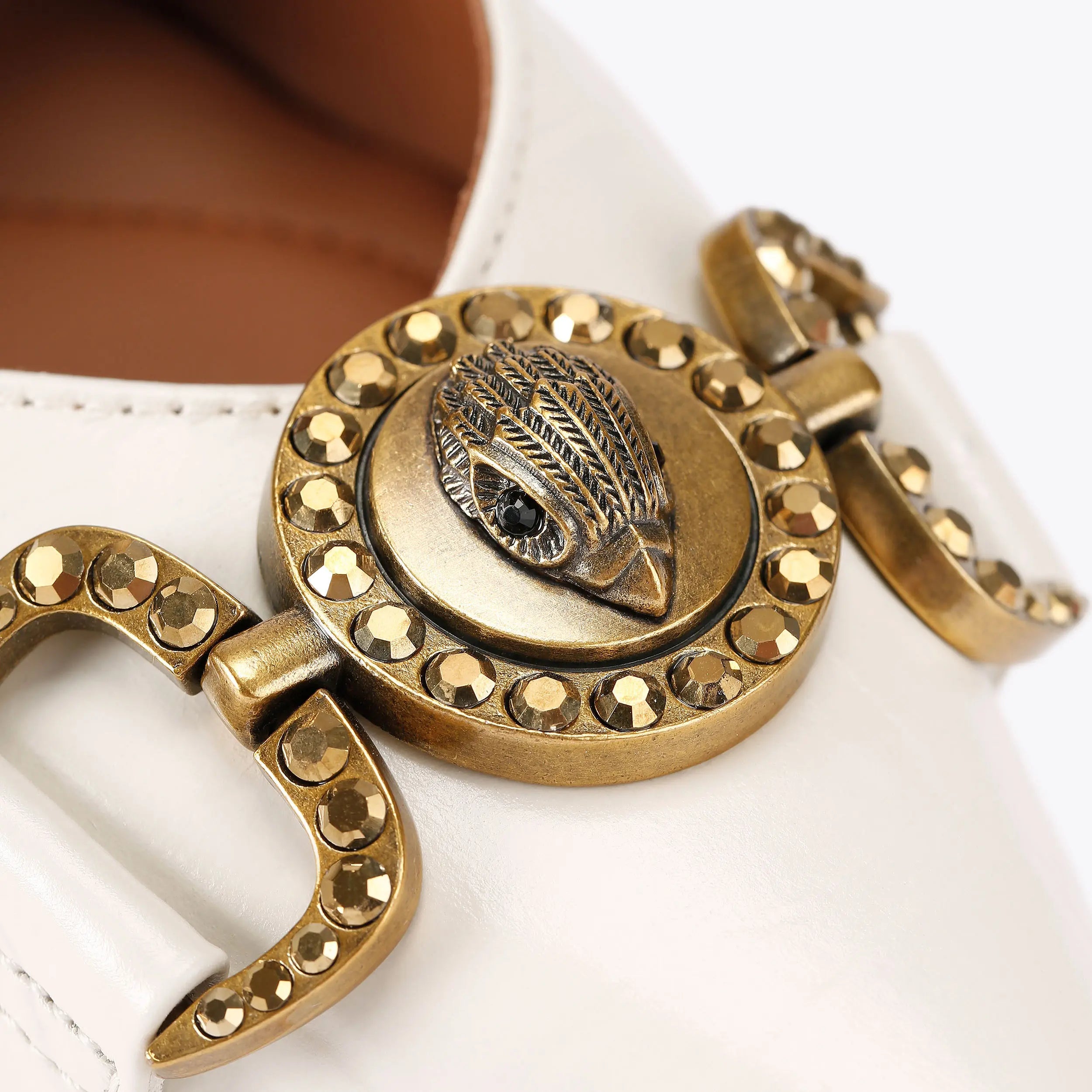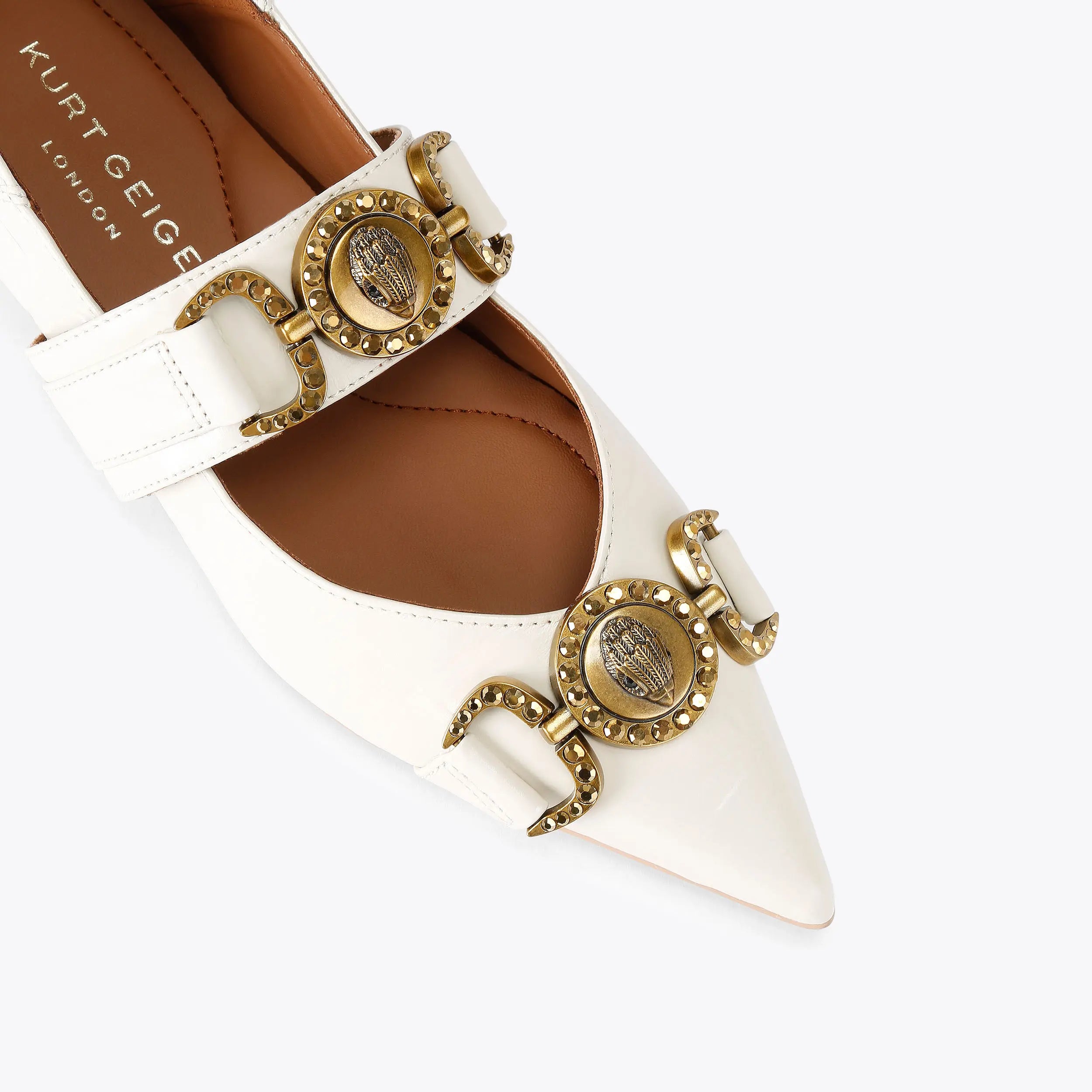 This Mansion Point Slip On arrives in a large croc embossed leather. The toe is fashionably pointed and the heel is soft to be worn up or down. There are two antiqued brass horse bit chains across the foot.