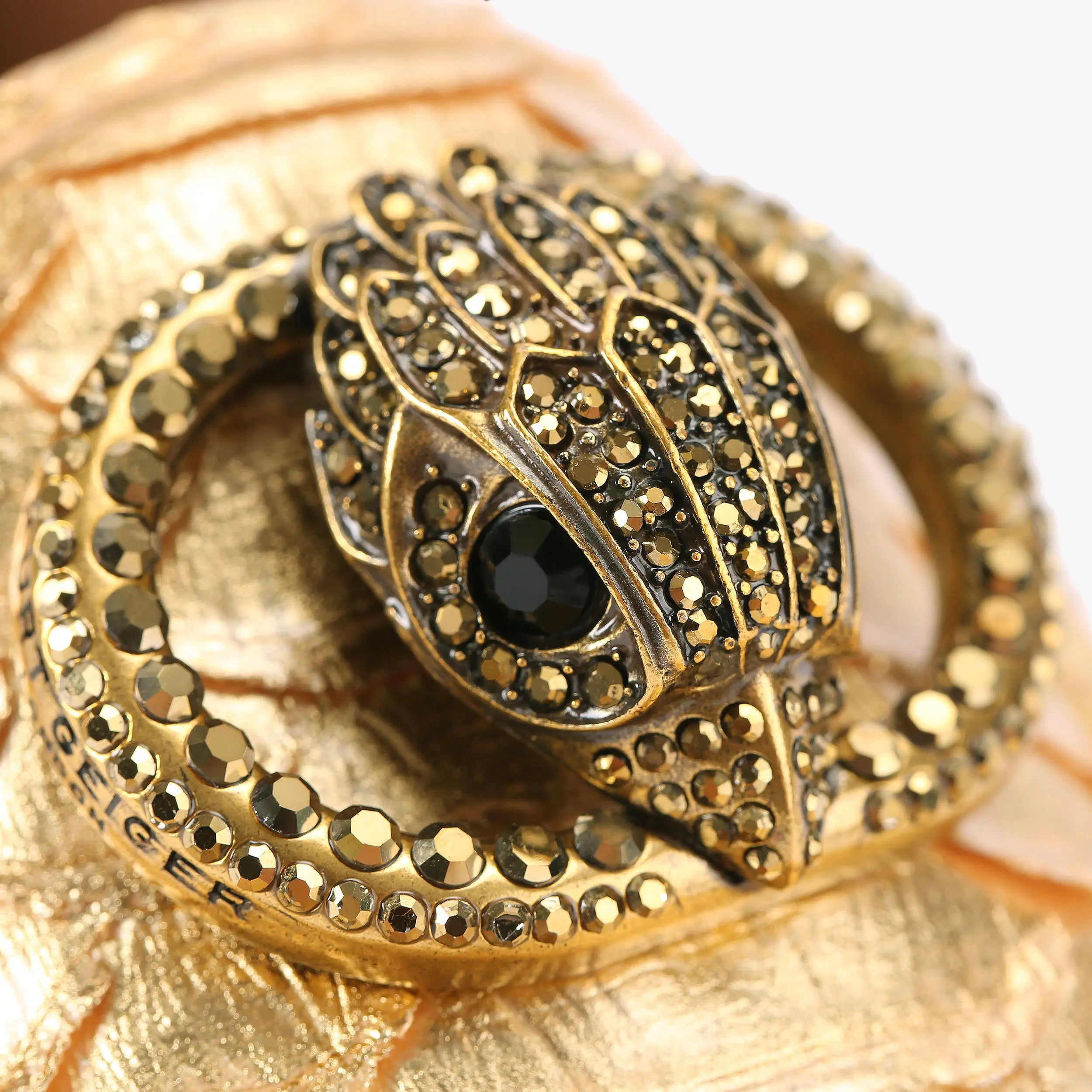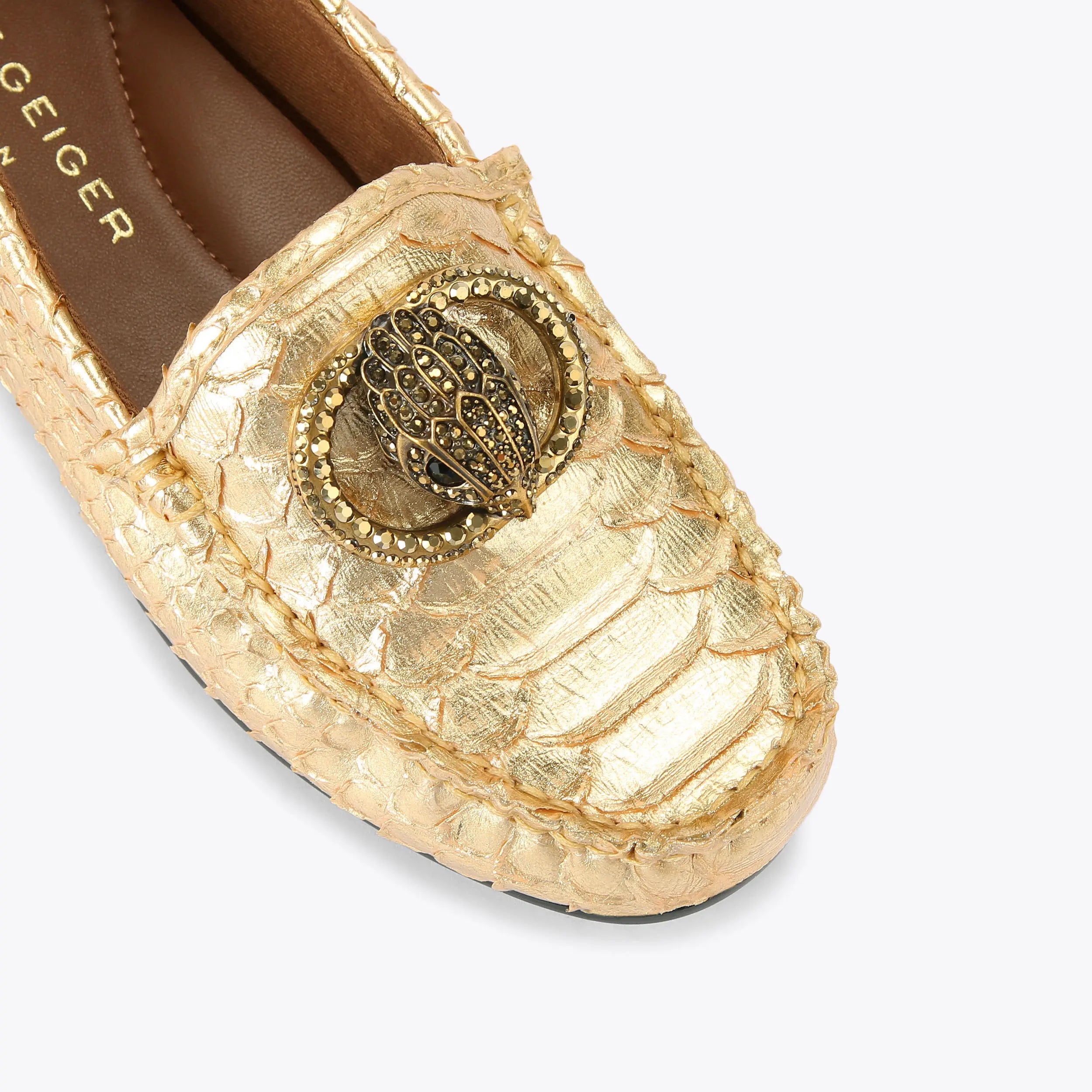 This Chelsea Moccasin loafer is crafted from a metallic gold 3D embossed lizard leather. There is a crystal embossed antiqued brass oval trim with eagle head at the centre on top of the toe.