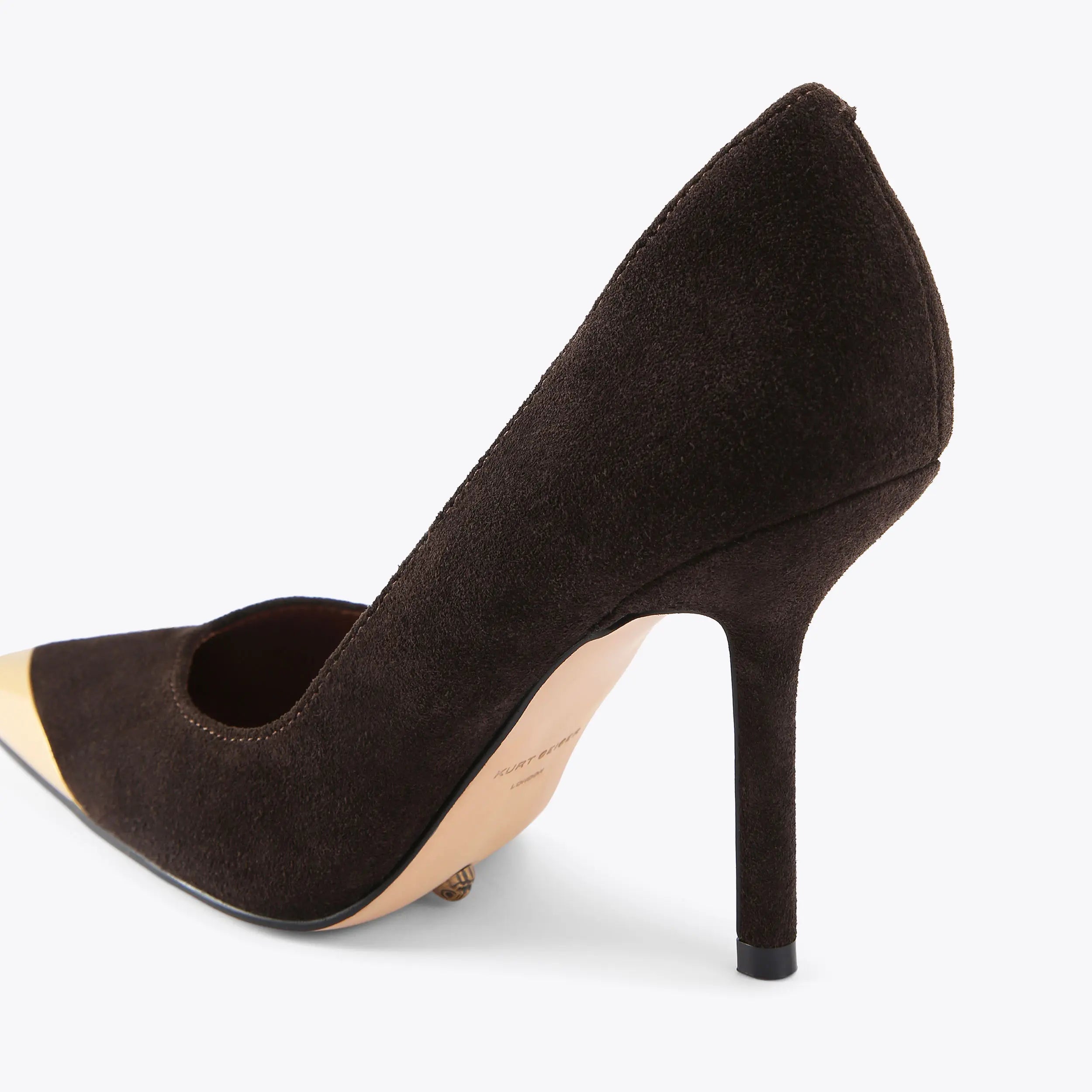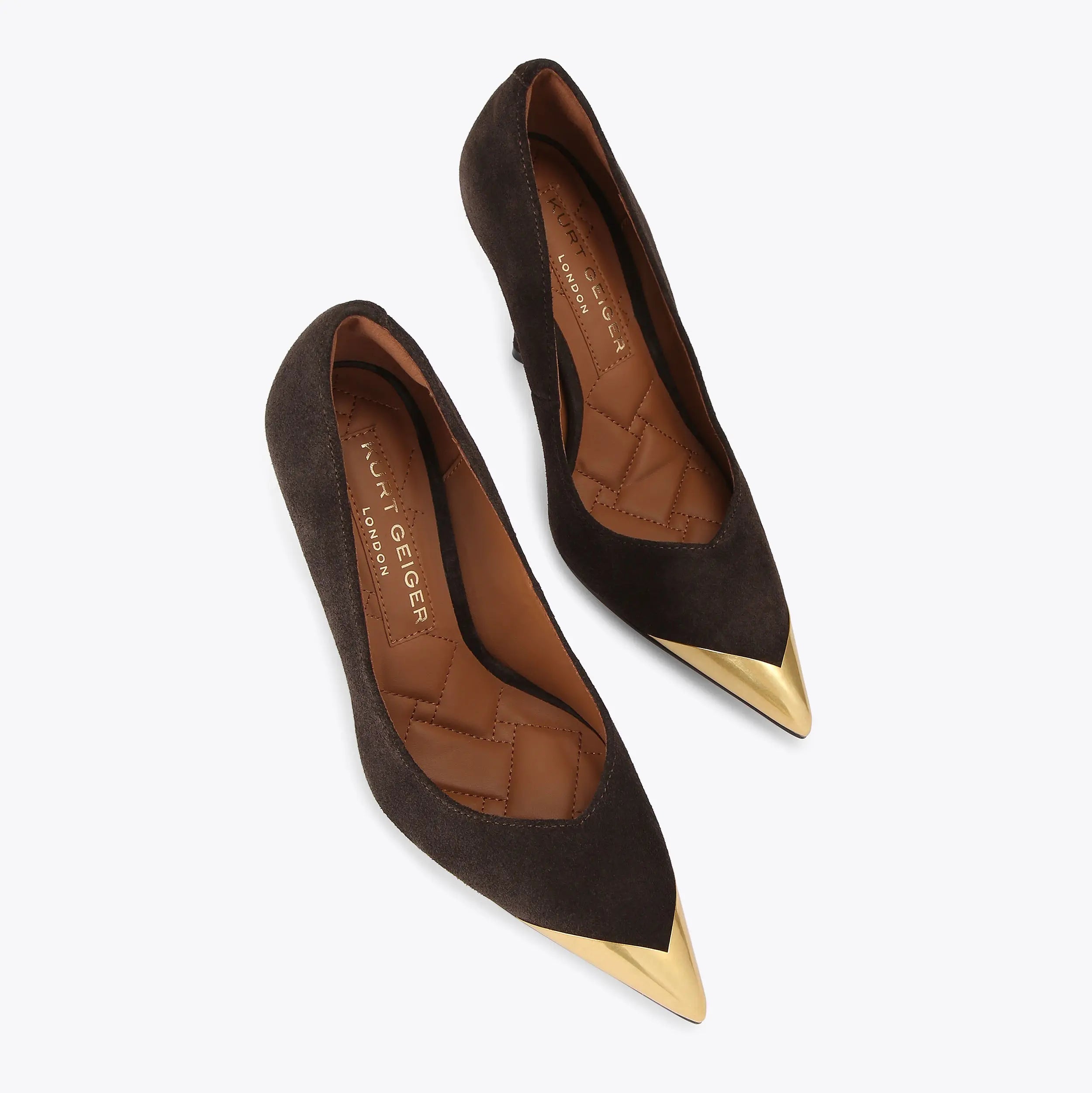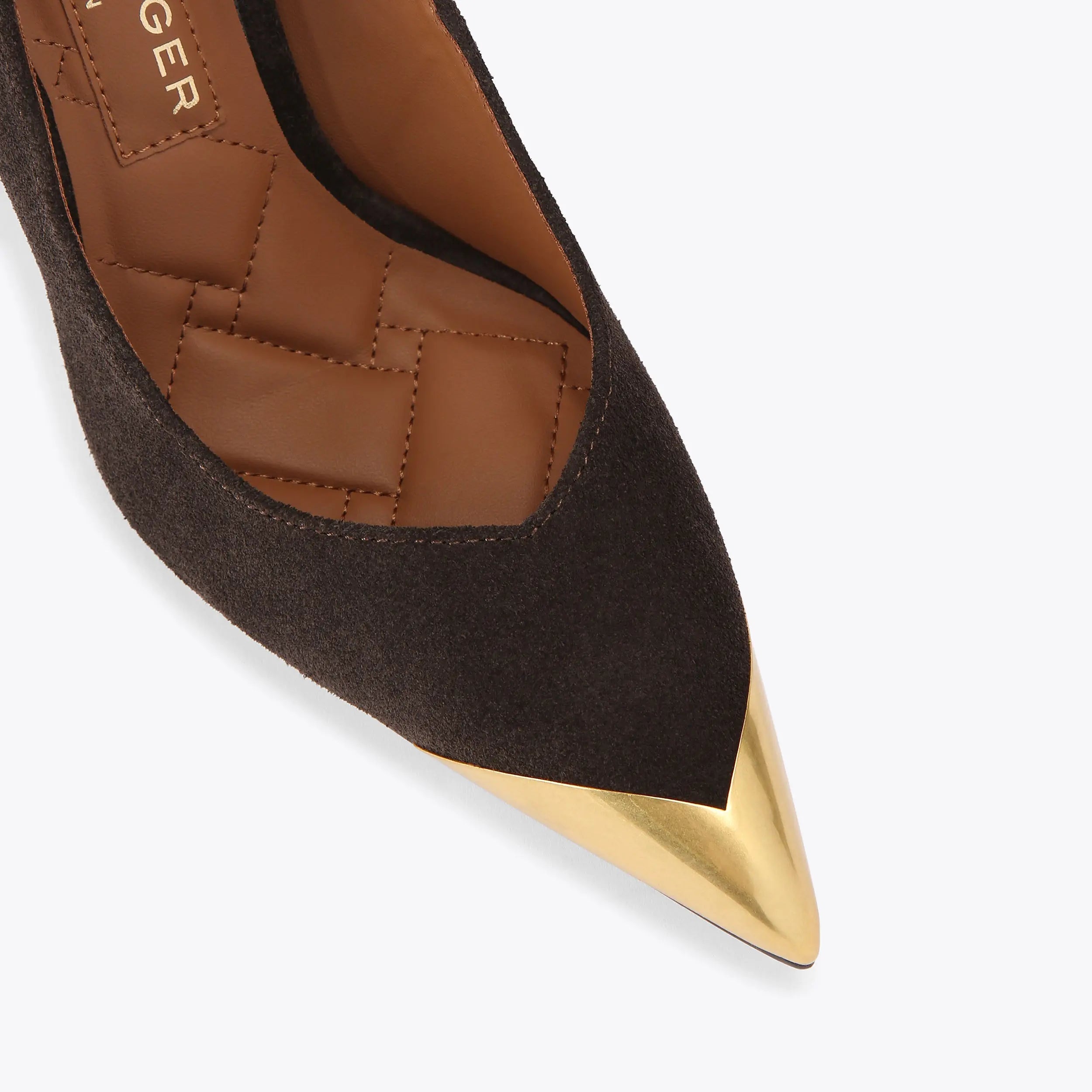 This Regent Point Court heel features a brown suede leather upper. There is a brushed brass tip on the pointed toe.