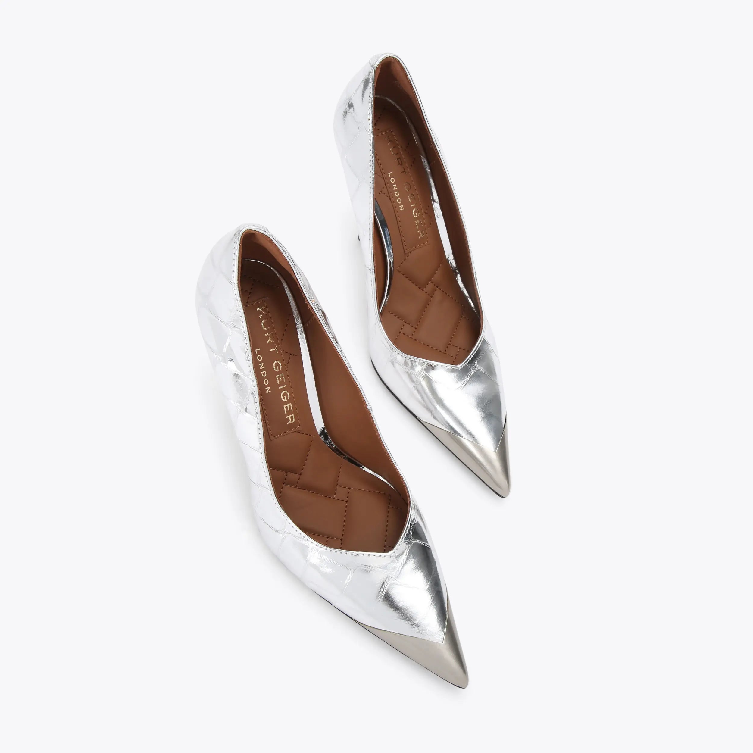 This Regent Point Court heel features a metallic silver ostrich effect embossed leather upper. There is a brushed silver tip on the pointed toe.