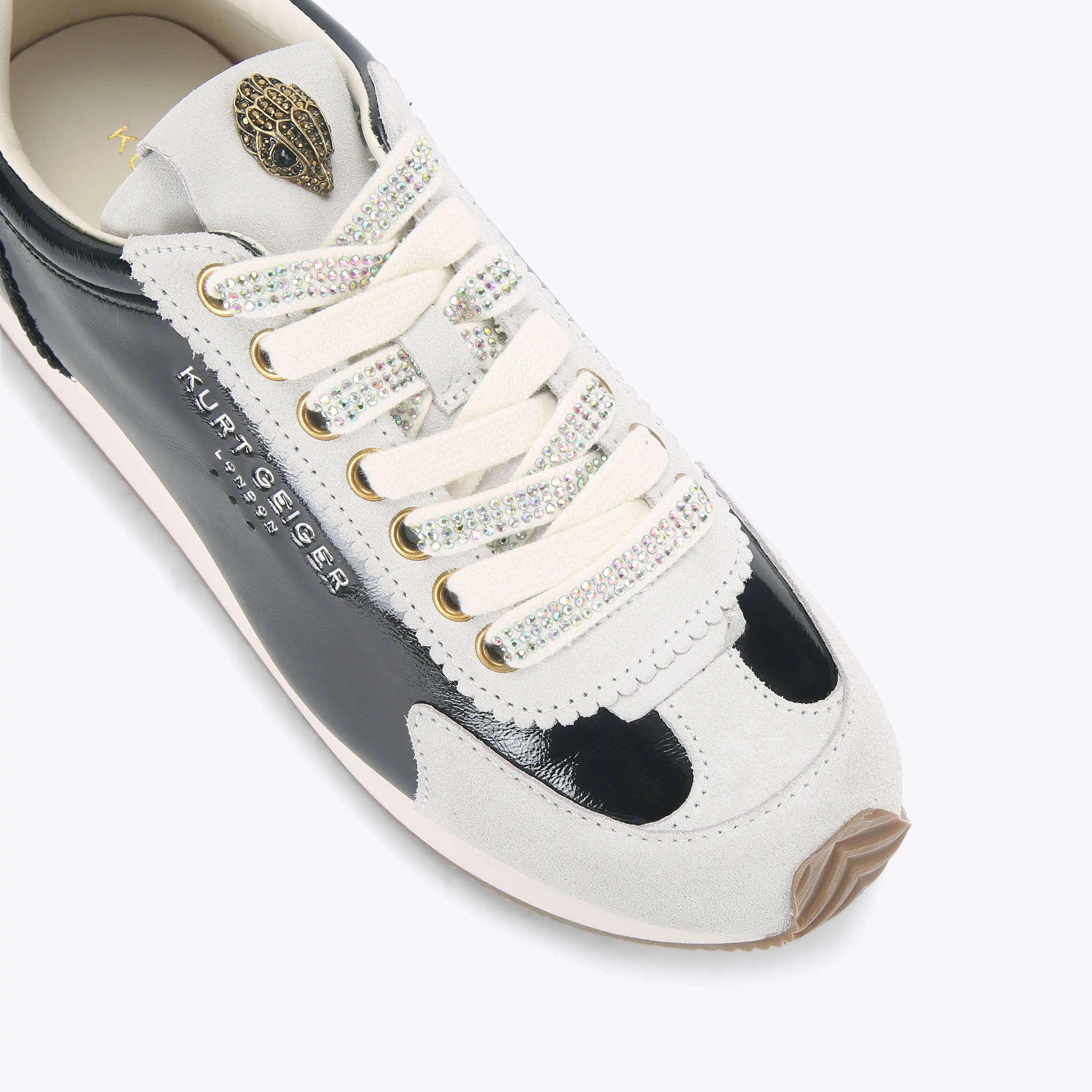 This Islington Pump Sneaker is crafted from a black leather with leopard print rear pull tab. The front is laced up with embellished crystal white laces. There is an antiqued brass eagle head with crystals sat on the tongue.