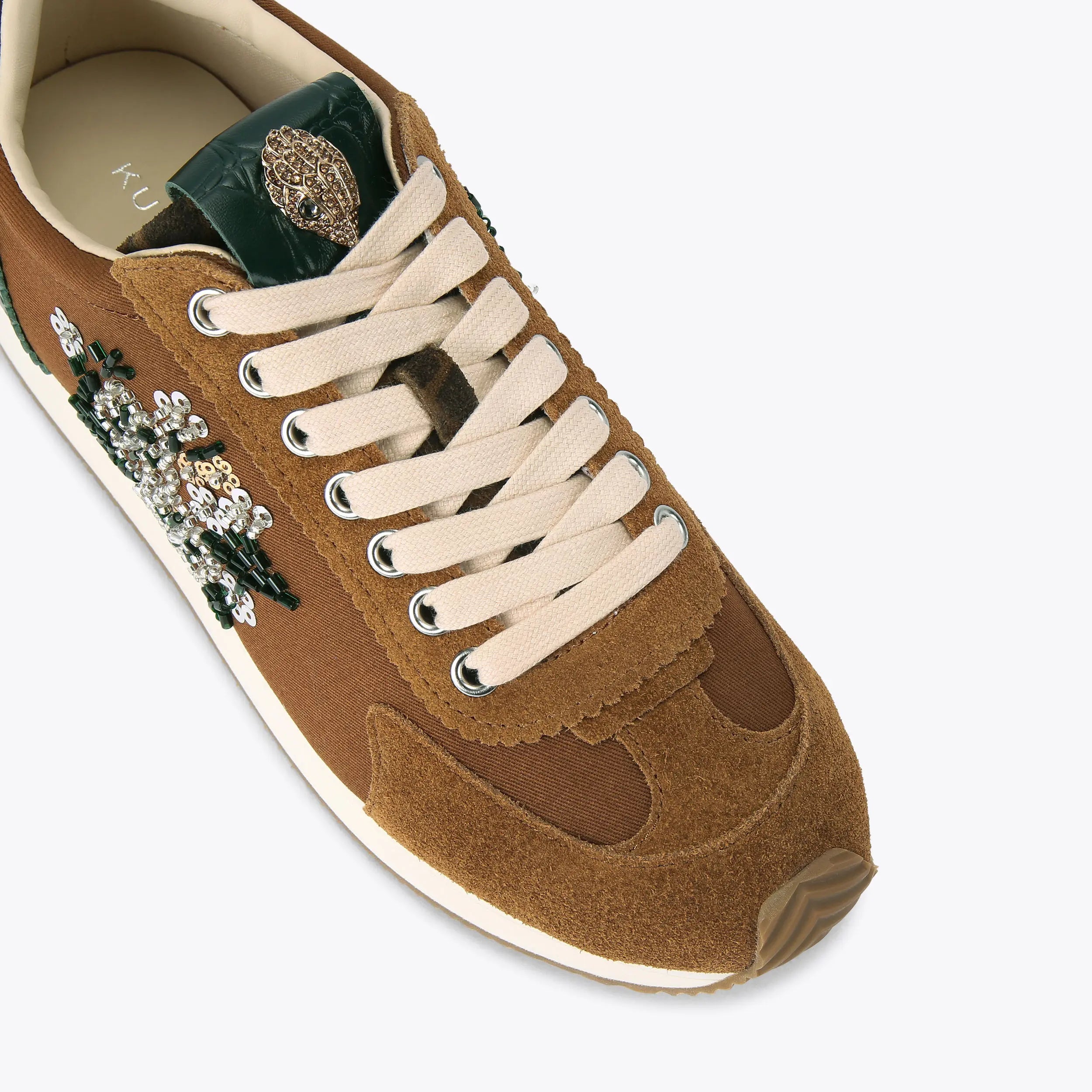 This Islington Pump Sneaker is crafted from a brown fabric and suede with beaded and sequin floral motif on the outer sides of the shoe. There is a gold eagle head with crystals sat on the tongue.