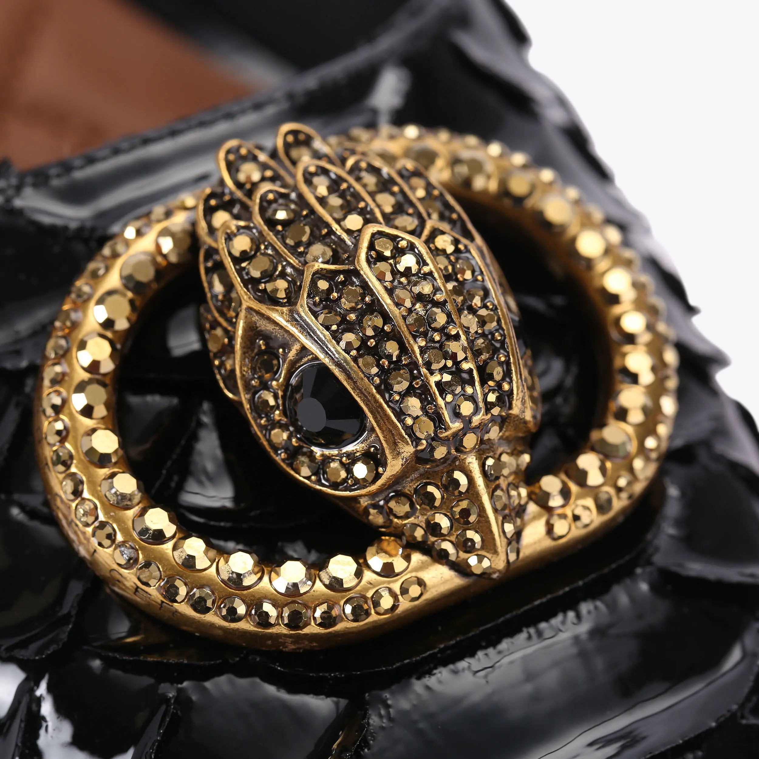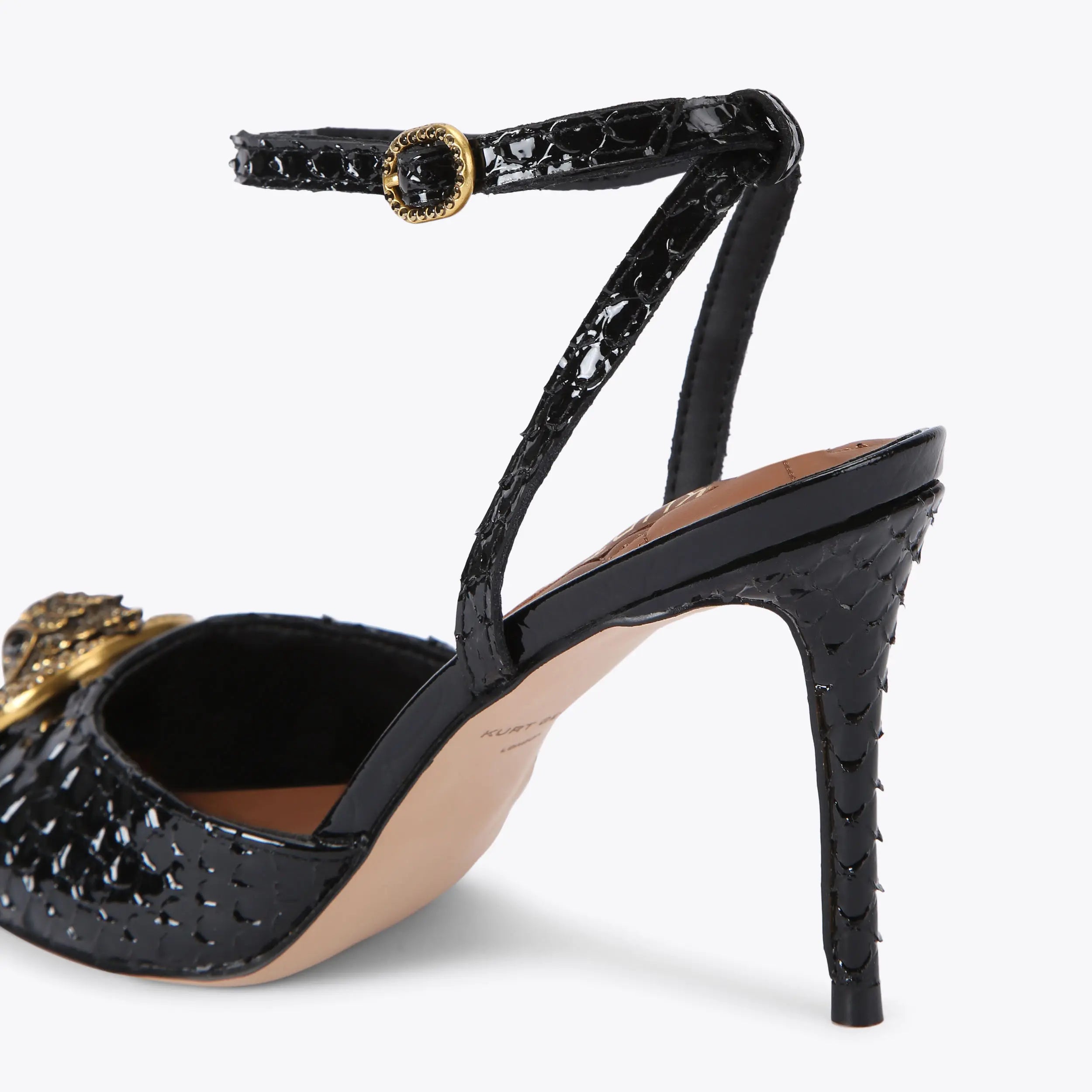 The Chelsea Ankle Strap is a black 3D snake embossed heel with closed toe. There is a crystal embossed antiqued brass oval trim with eagle head at the centre sat on the toe.