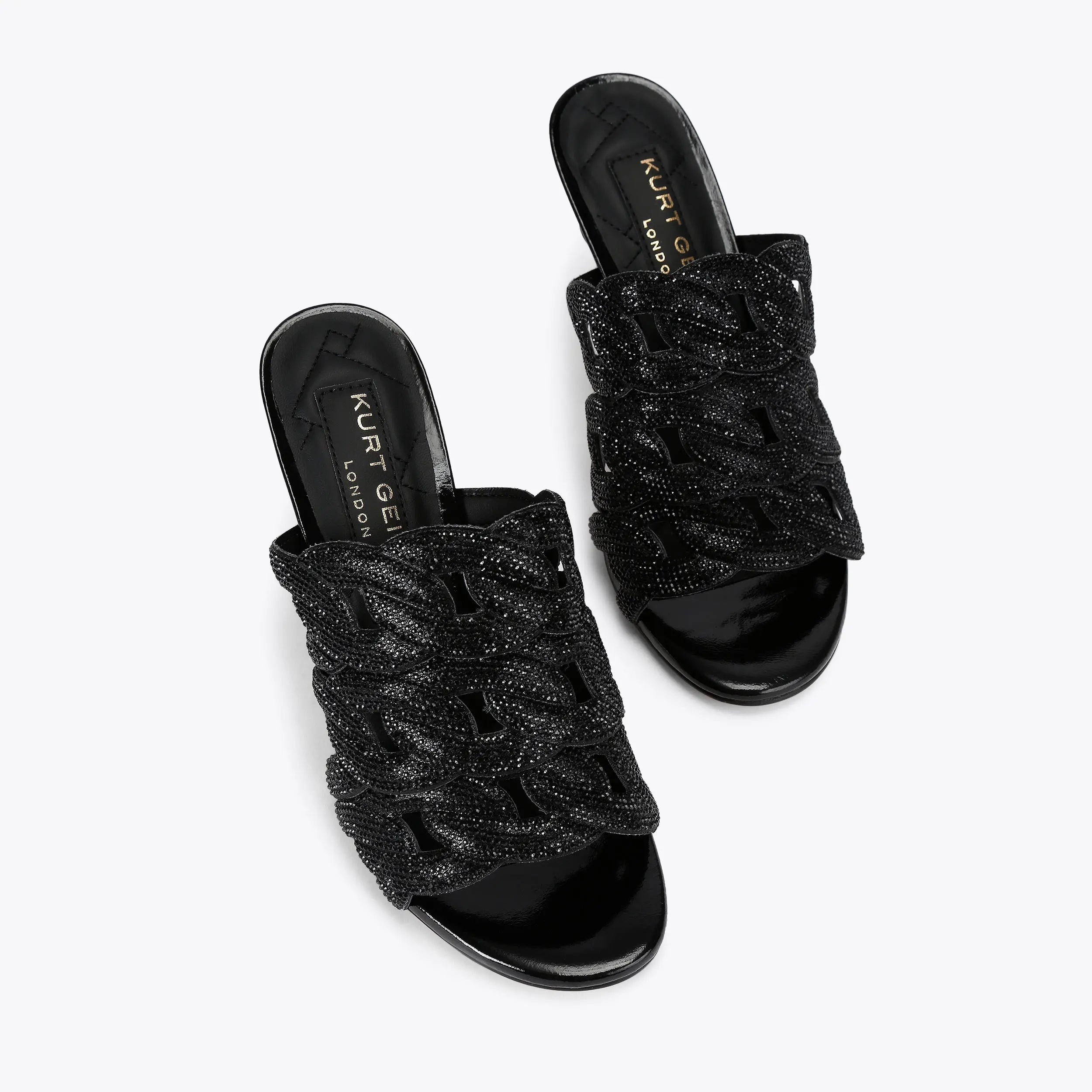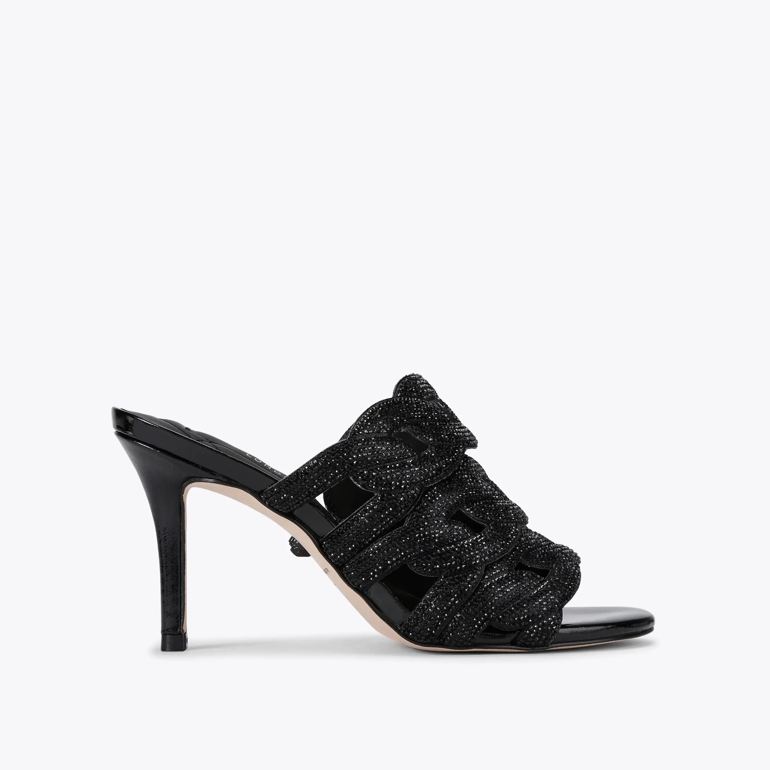 This Crystal Chain Mule is a high black heel crafted from a patent leather. There are three crystal embellished chain style straps across the foot.
