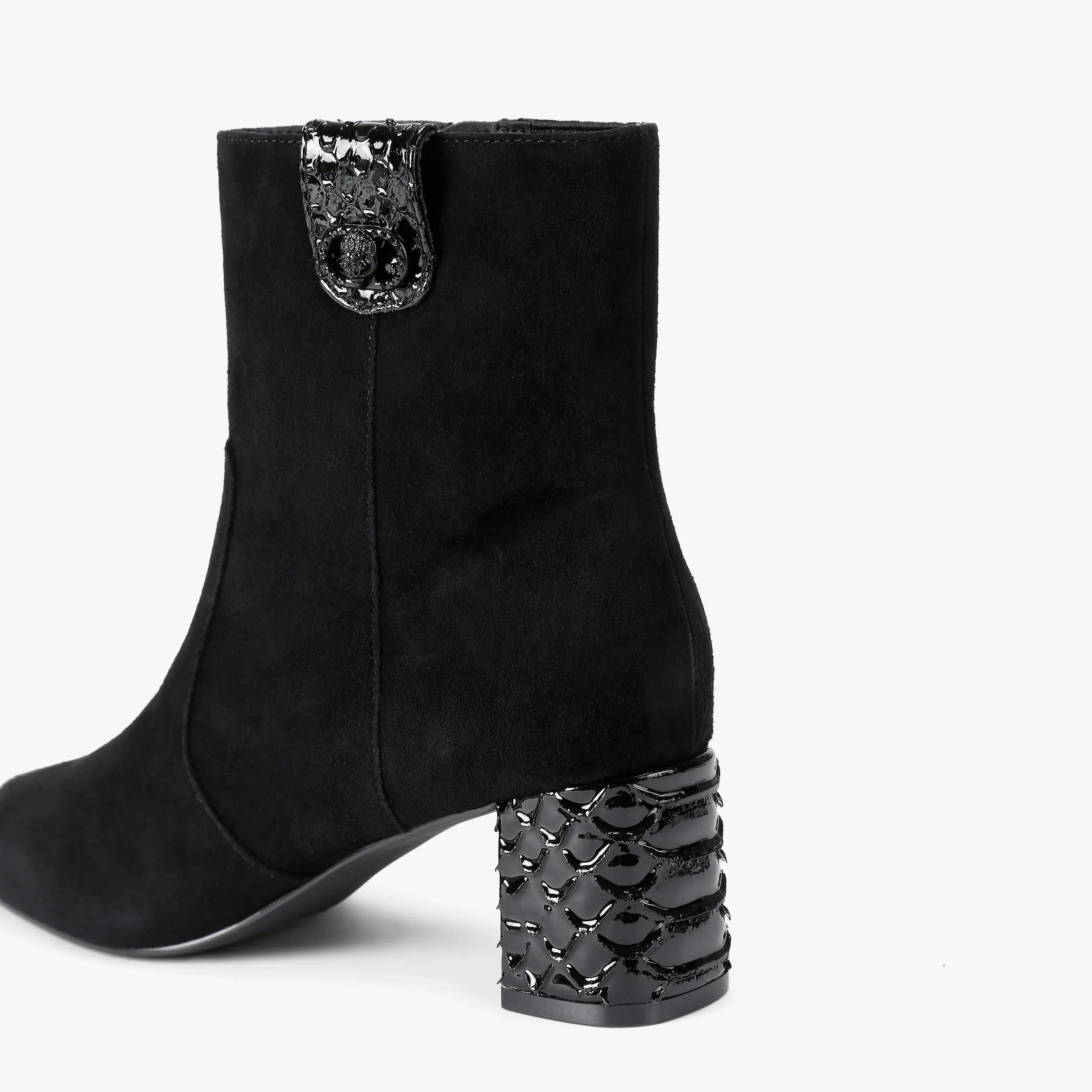 This Chelsea Trim Ankle Boot is crafted from a black suede. There is a 3D lizard embossed tab on the ankle which compliments the block heel.