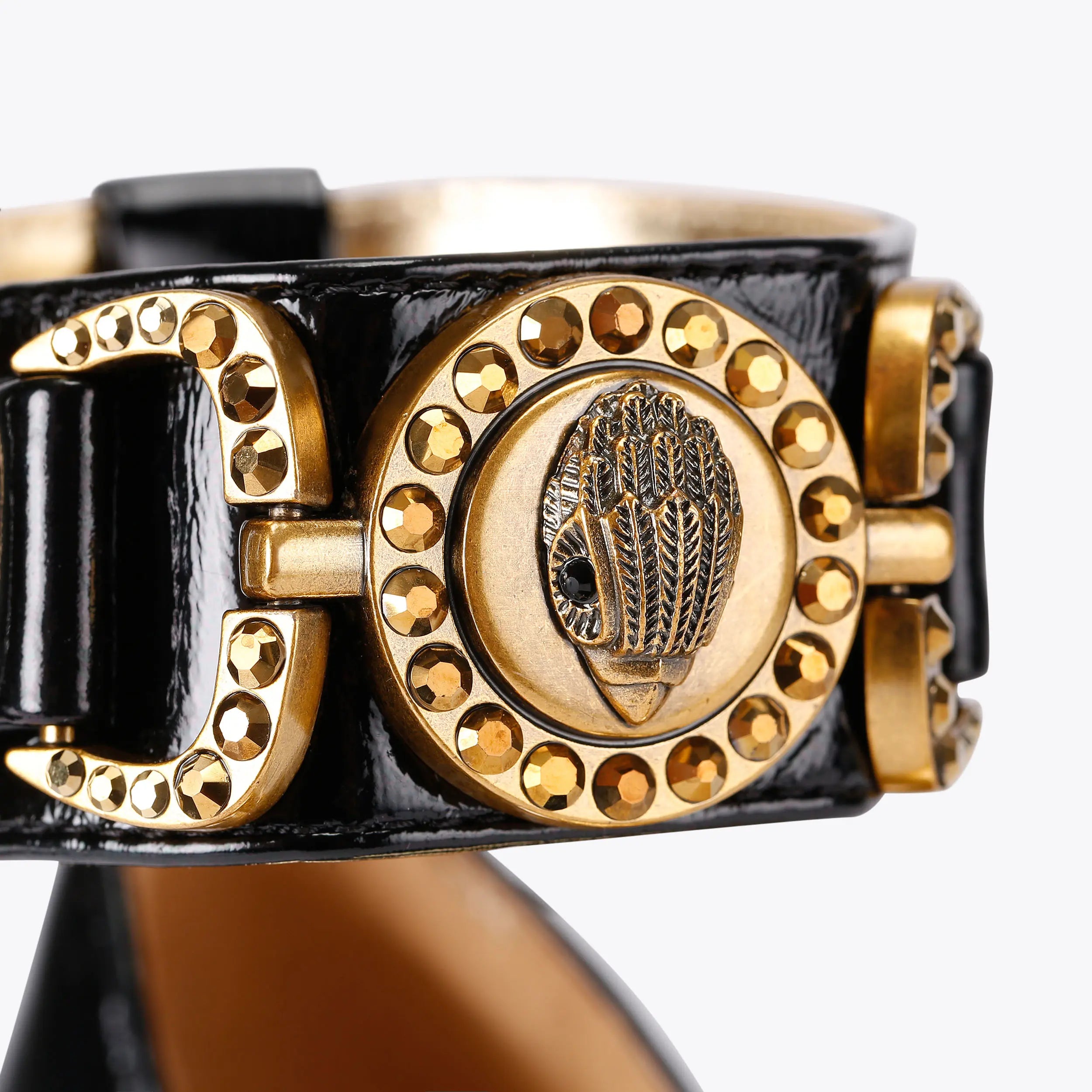 This Mansion Ankle Strap Court heel arrives in a black patent leather. There is a large strap around the ankle which is accented with an antiqued brass horse bit style chain with eagle head on the front.