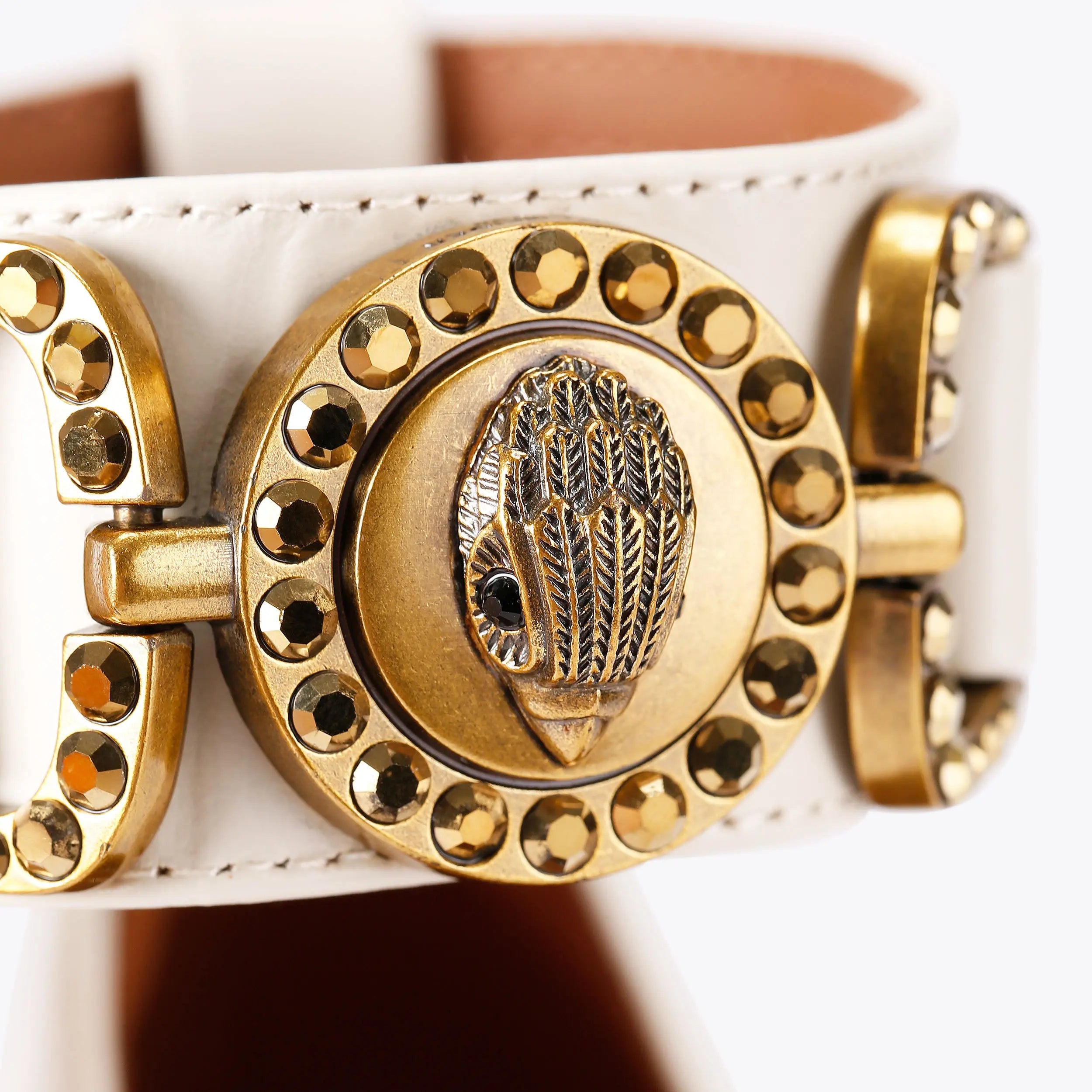 This Mansion Ankle Strap Court heel arrives in a bone enlarged croc embossed leather. There is a large strap around the ankle which is accented with an antiqued brass horse bit style chain with eagle head on the front.