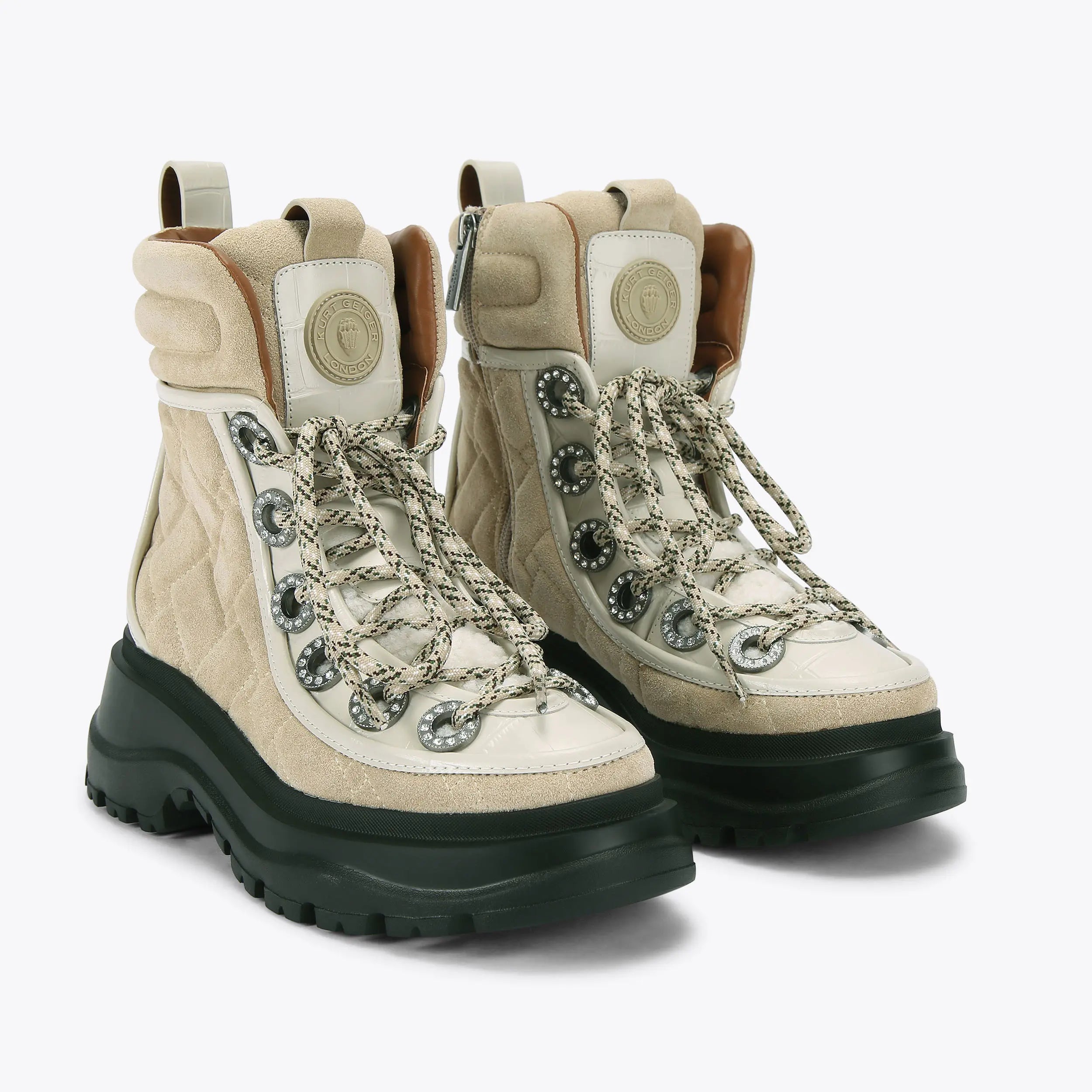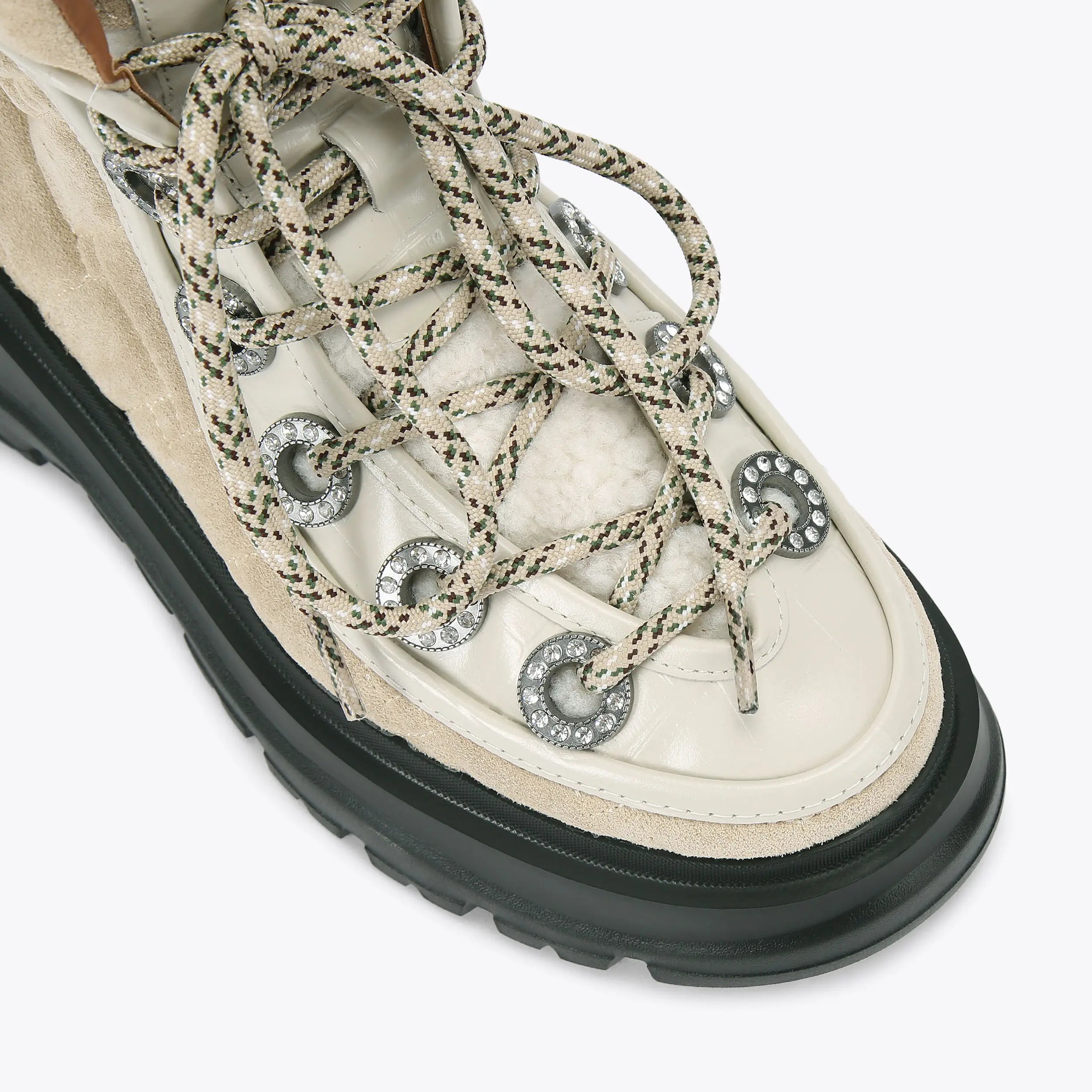 This Kensington Hiking boot is crafted from a beige suede and croc embossed bone leather. The front laces up with silver crystal embellished eyelets. There are two pull loops on the front and back of the ankle.
