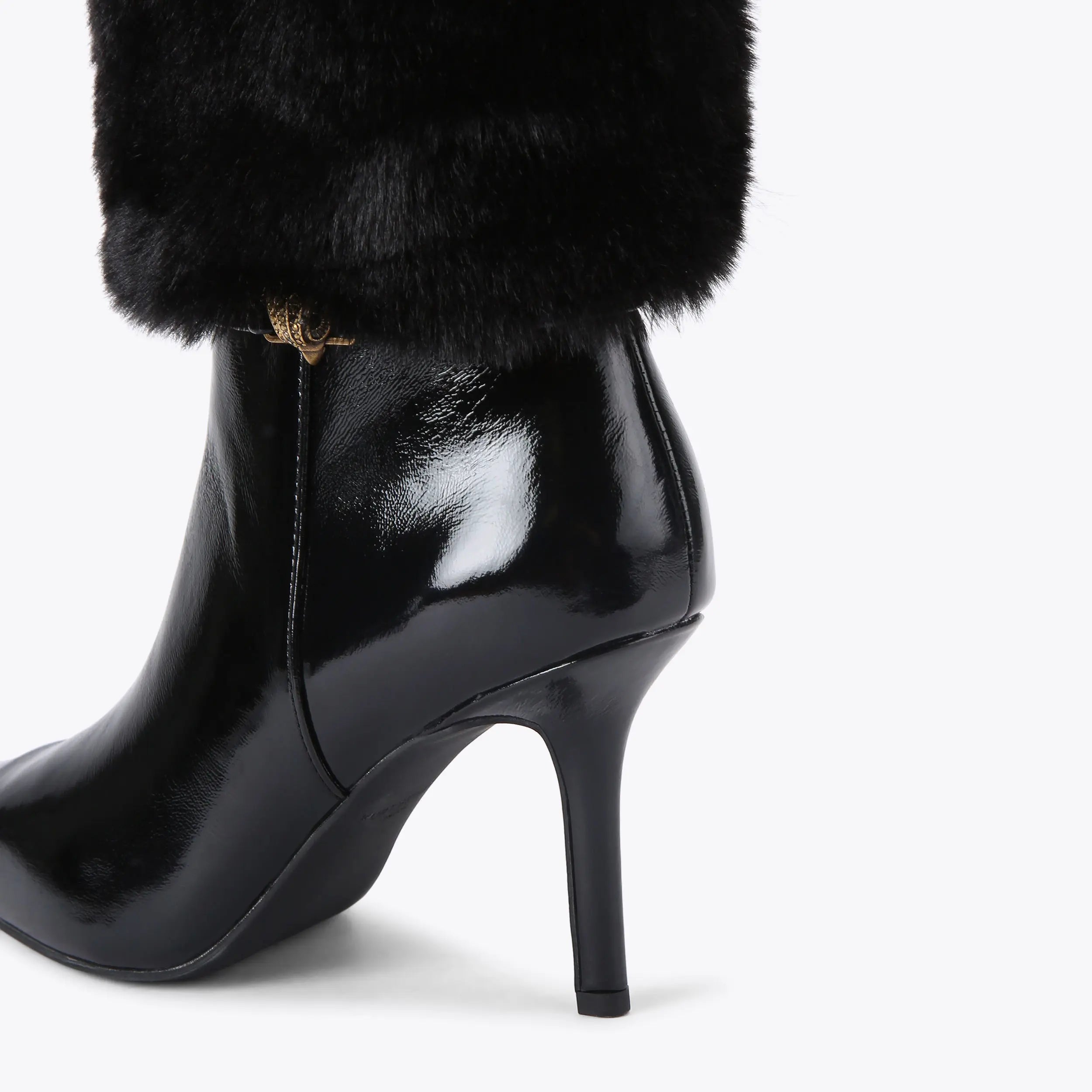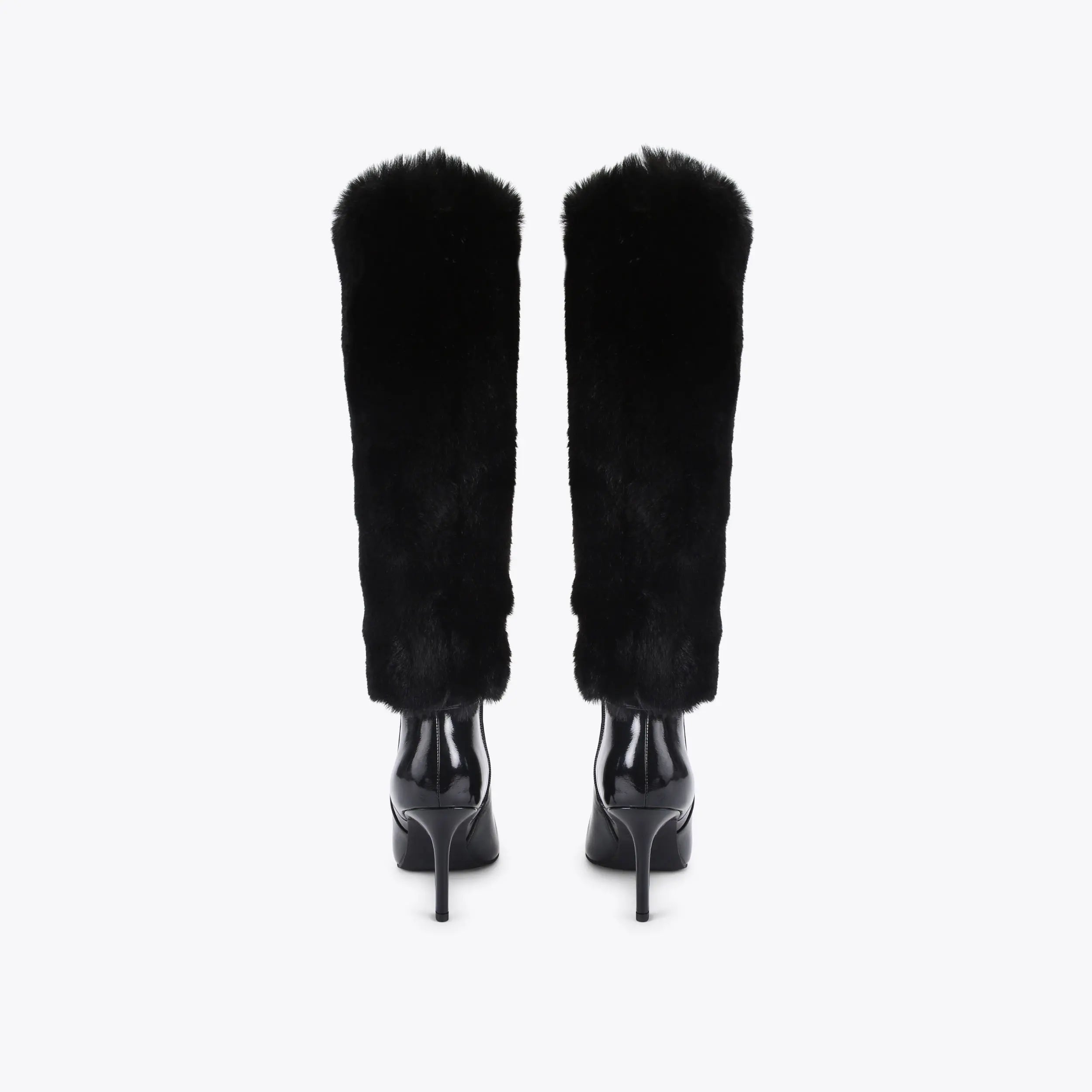 This Kensington Knee High Boot arrives in a black leather with pointed toe. The ankle shaft is embellished with a soft black faux fur fabric. There is an antiqued brass eagle head on the outer side of the ankle strap.