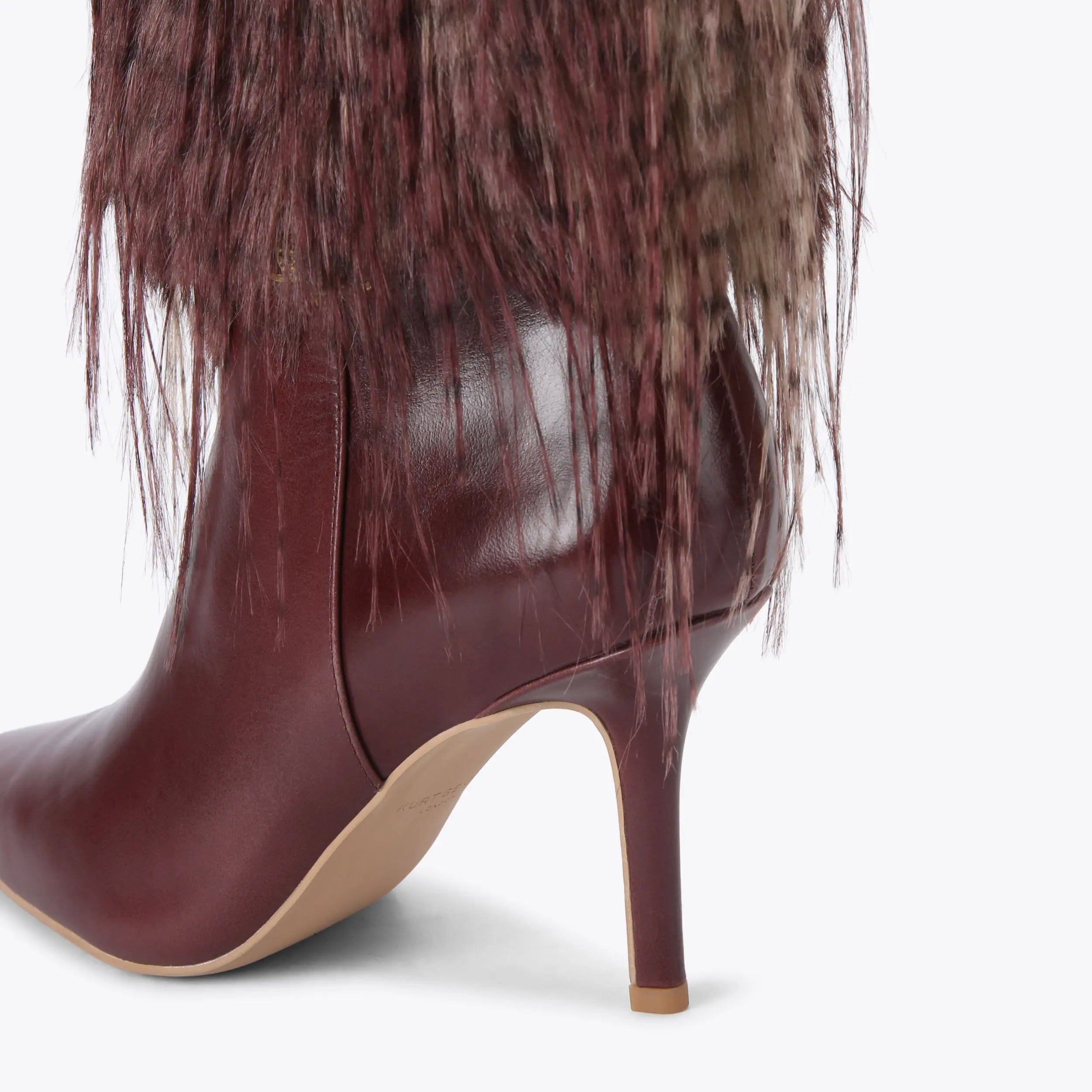 This Kensington Knee High Boot arrives in a wine leather with pointed toe. The ankle shaft is embellished with a soft ostrich style feather with ombre wine tips. There is an antiqued brass eagle head on the outer side of the ankle strap.