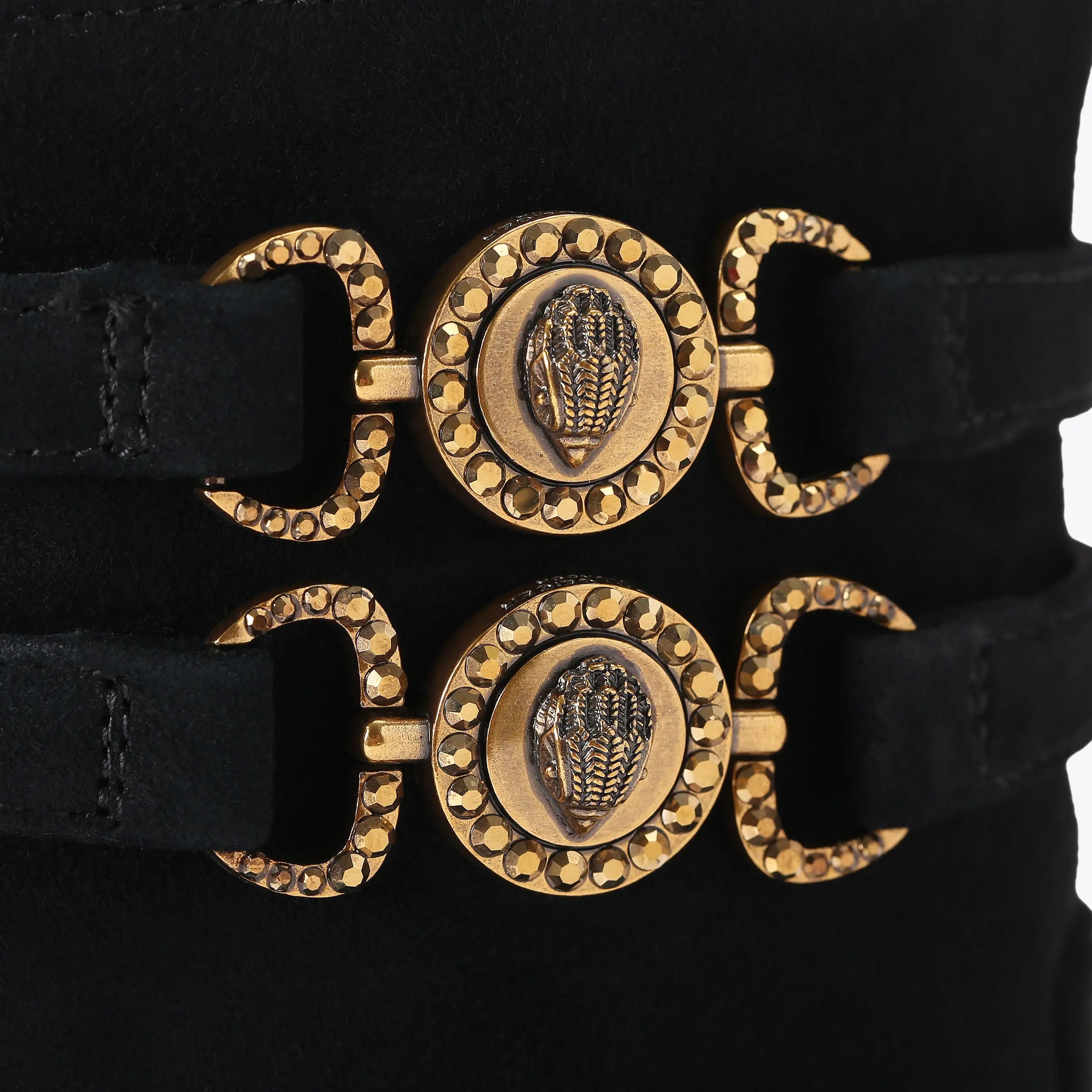 This pair of Mansion Ankle Boots are crafted from a black suede leather. The toe is pointed and there are two statement straps around the ankle each with an antiqued brass horsebit eagle chain.