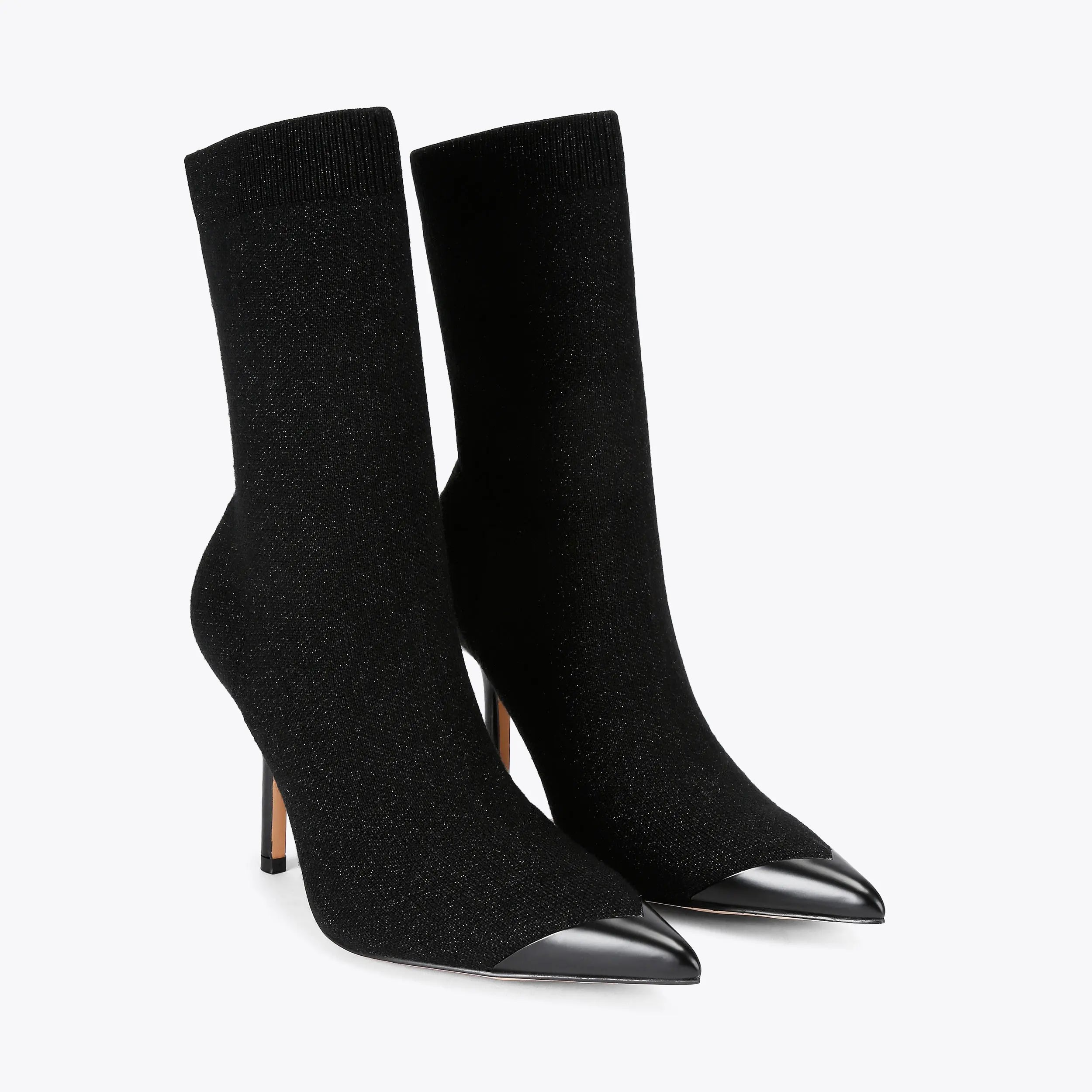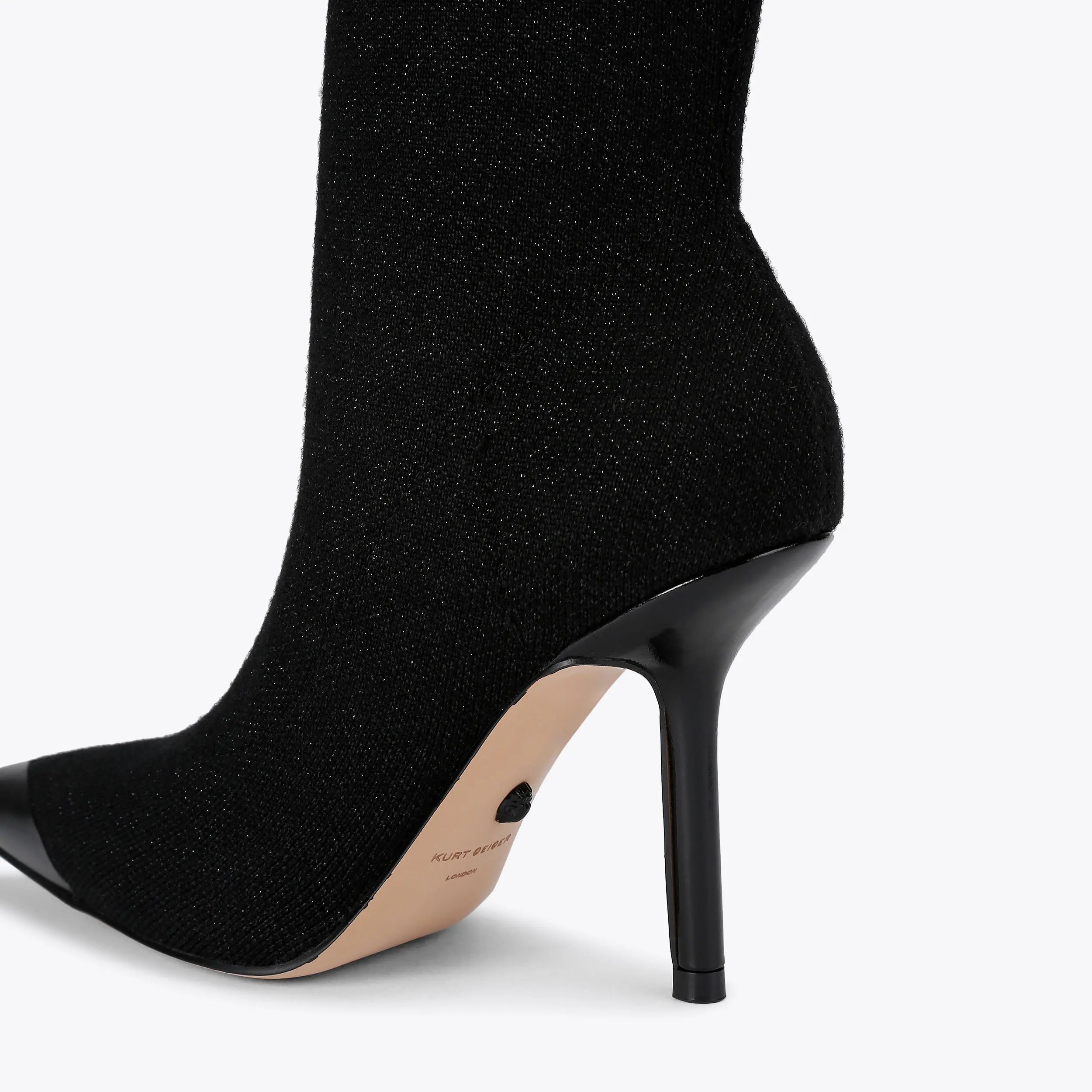 This Regent Point Sock Boot arrives in a black metallic stretch fabric. The pointed toe is coated in a flattering curved metal tip. The heel is in a stiletto style.