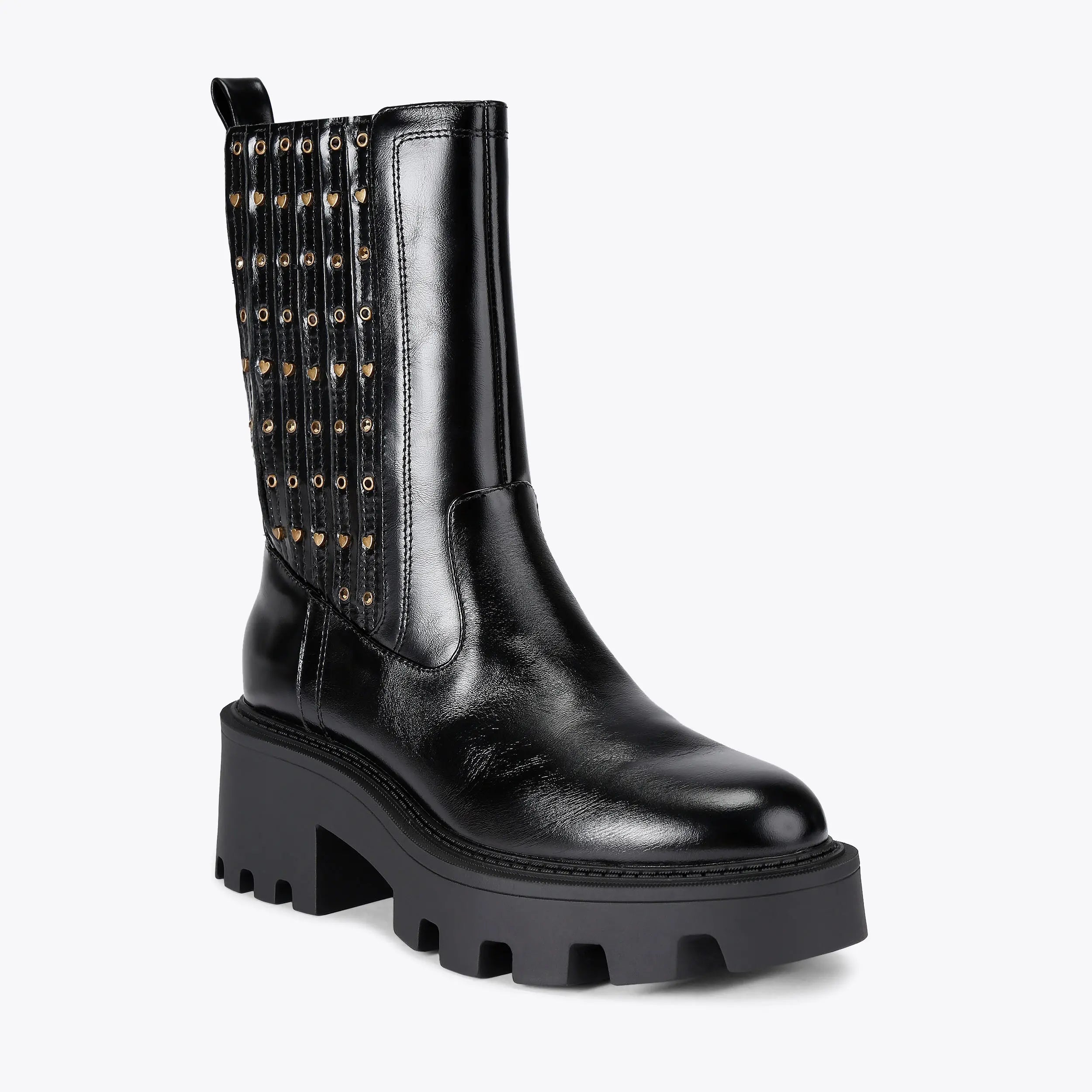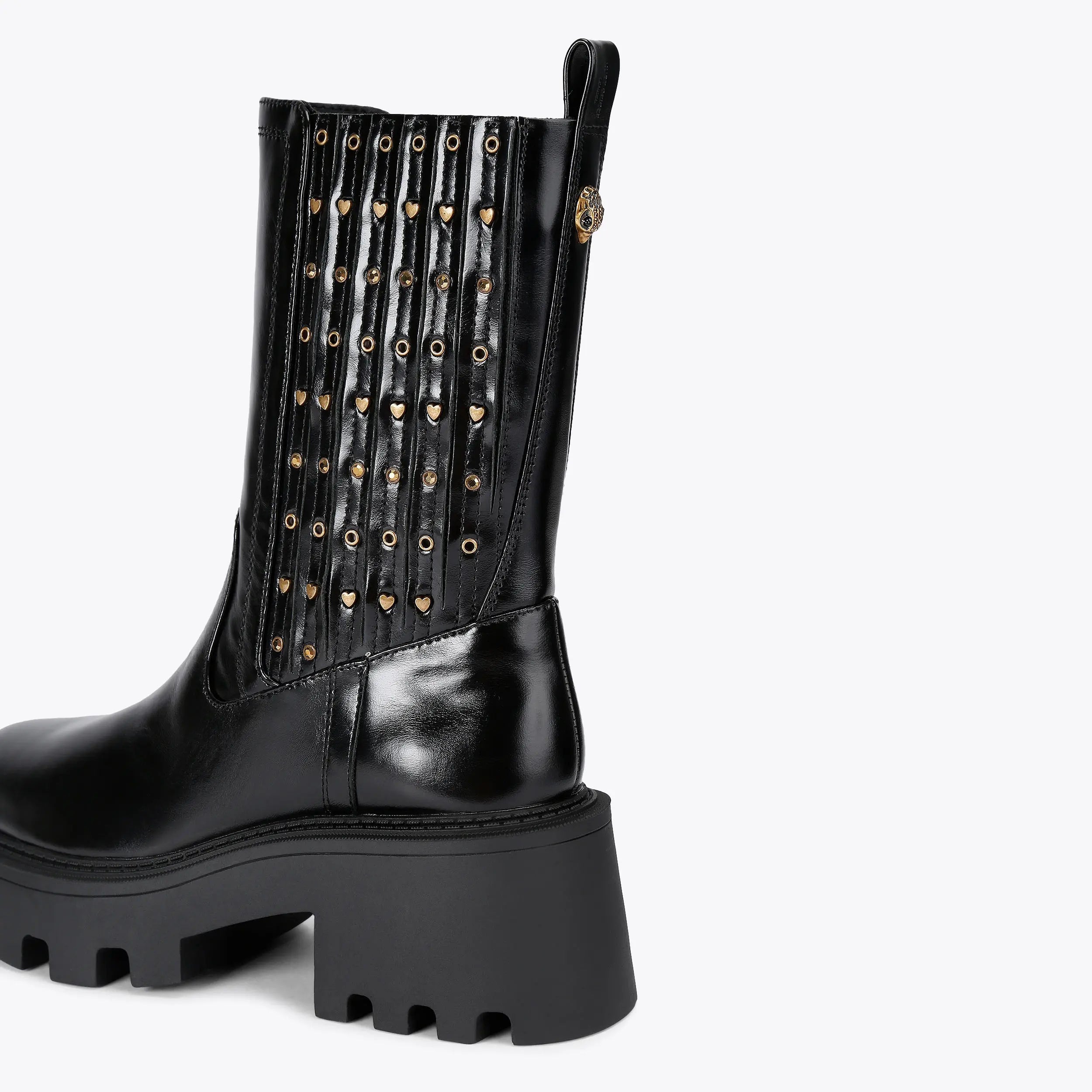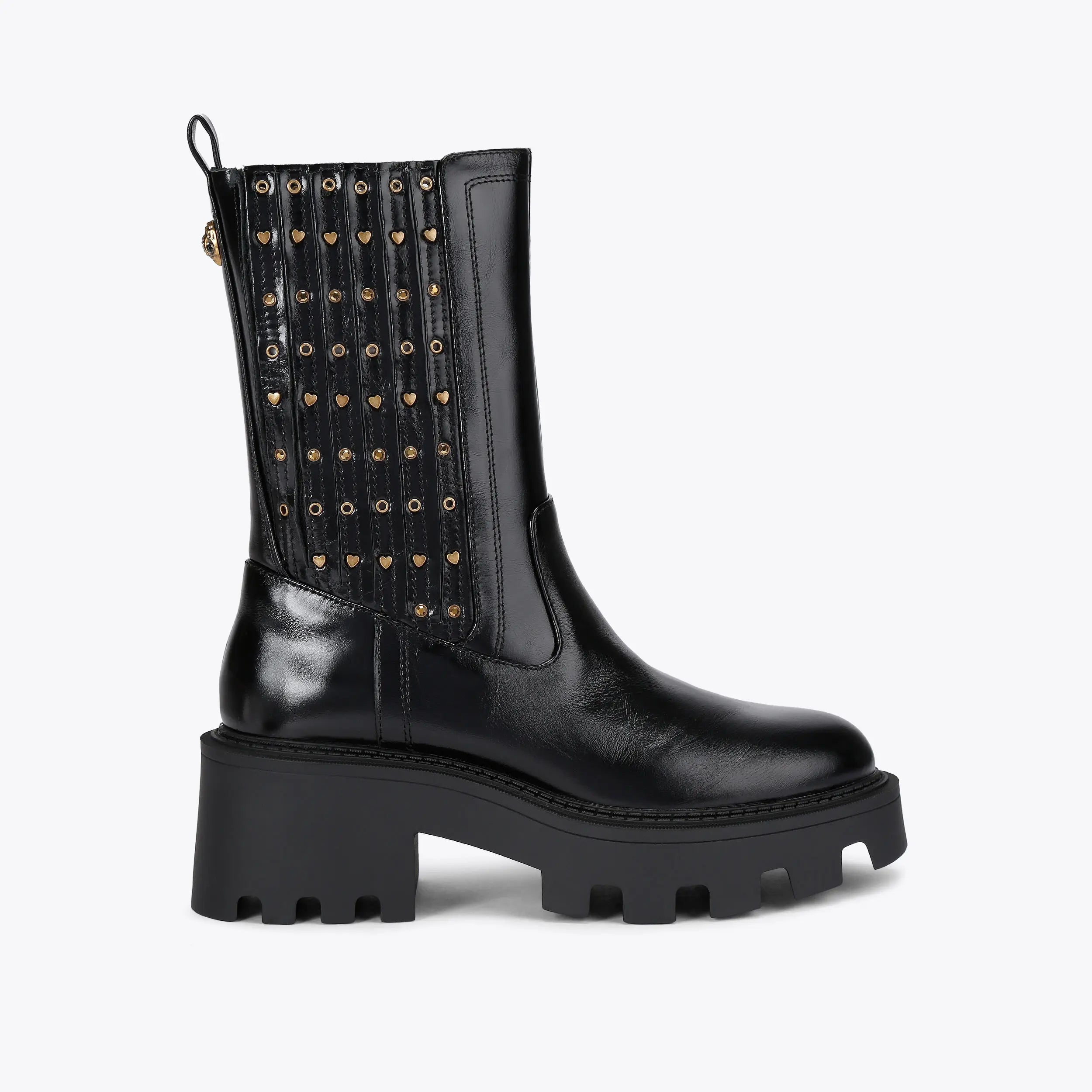 This Stud Chelsea Ankle Boot arrives in a black leather. There are antiqued brass heart studs and eyelets across the elasticated ankle shaft. The sole is extra chunky with heavy tread.