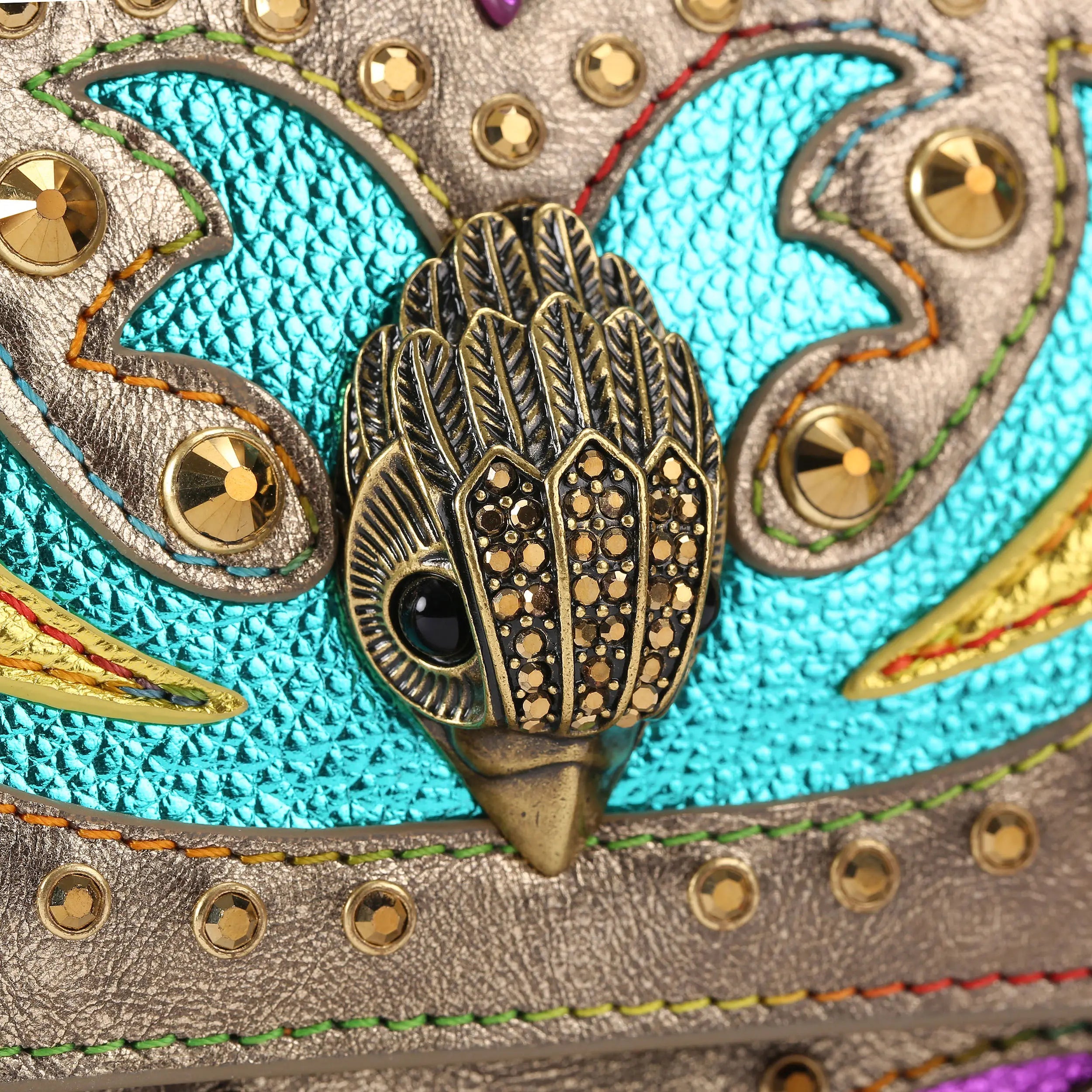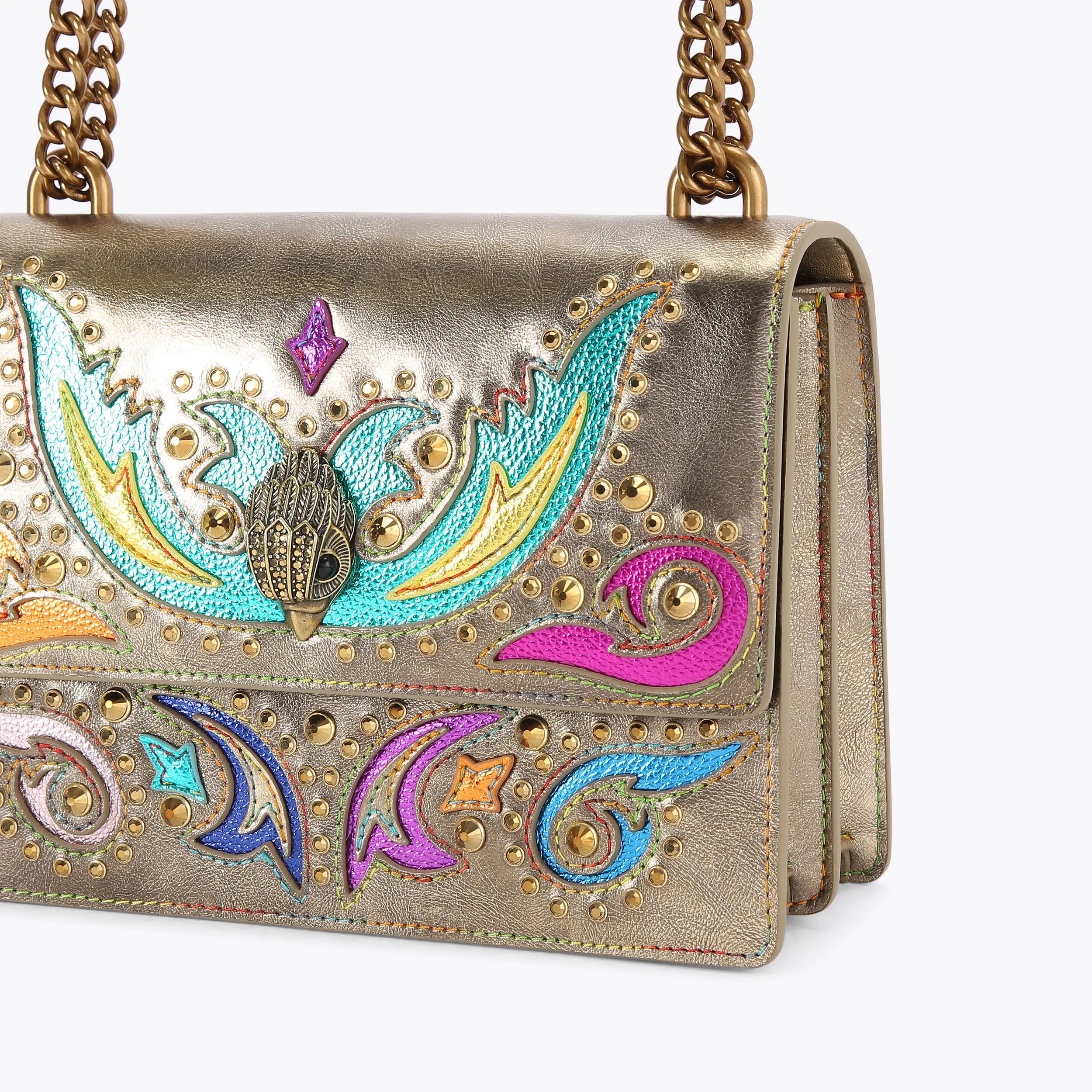 This Shoreditch Western Shoulder Purse is crafted from a bronze leather. There are metallic Western style cut outs across the front of the purse which is accented with bronze crystals. There is also an antiqued brass eagle head on the front flap.