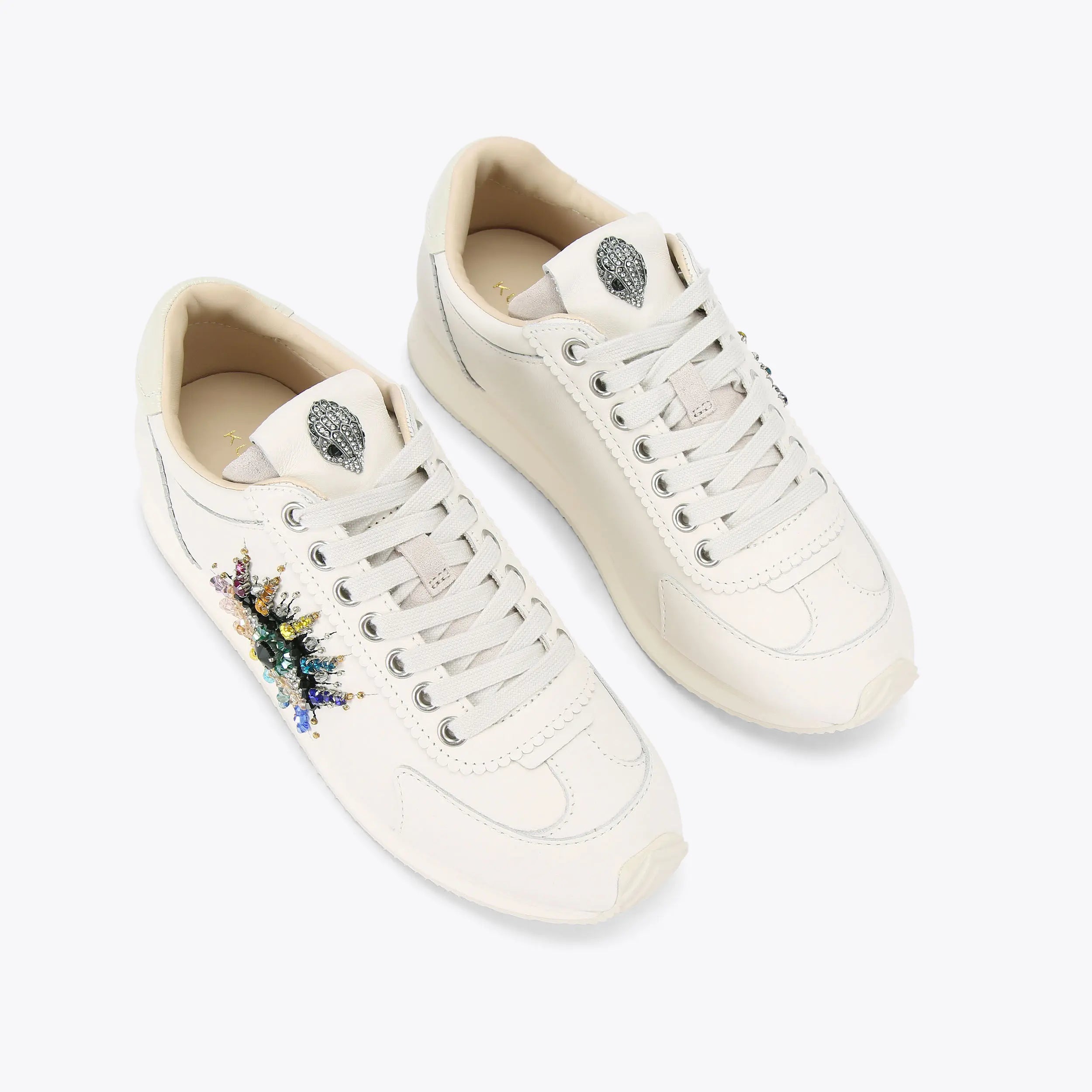 This Islington Pump Eye is crafted from a white leather. There is a scalloped edging detail around the eyelets and a statement crystal embellished eye on the outer side of the trainer.