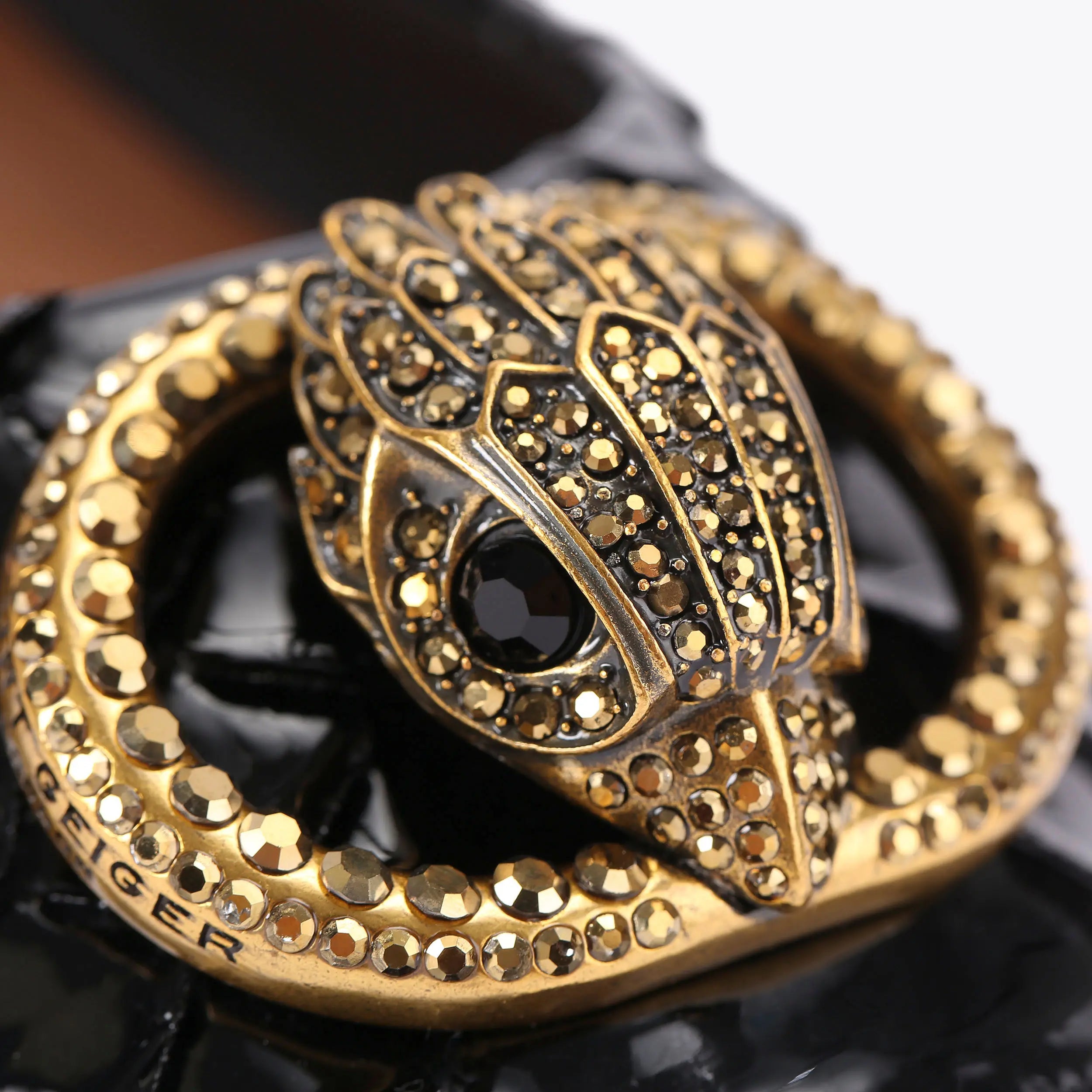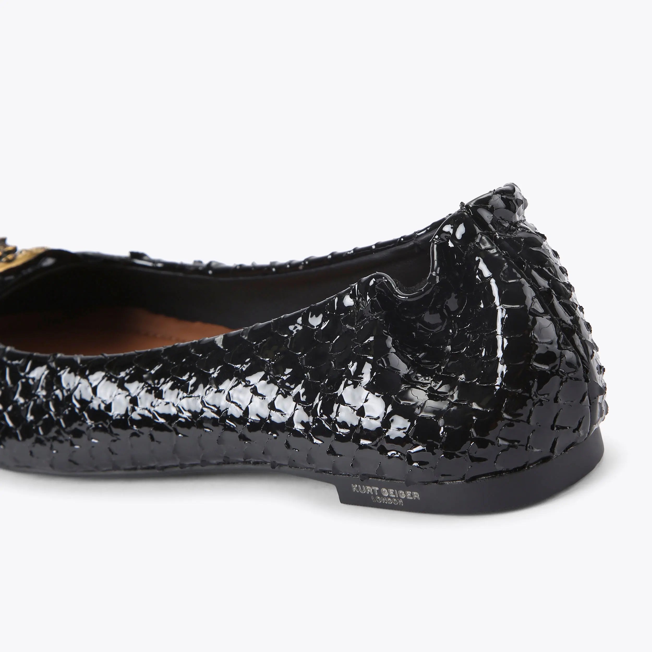 This Chelsea Ballerina Flat is crafted from a black 3D embossed snake printed leather. There is an antiqued brass metal oval trim with eagle head at the centre on top of the toe.