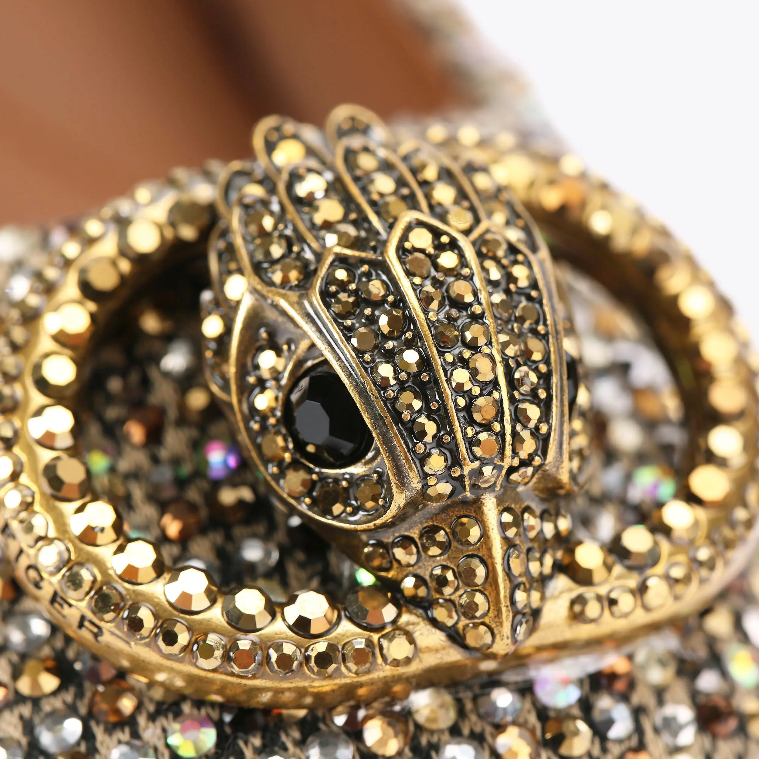 This Chelsea Ballerina Flat is crafted from a beige houndstooth fabric that is embellished with iridescent crystals. There is an antiqued brass metal oval trim with eagle head at the centre on top of the toe.