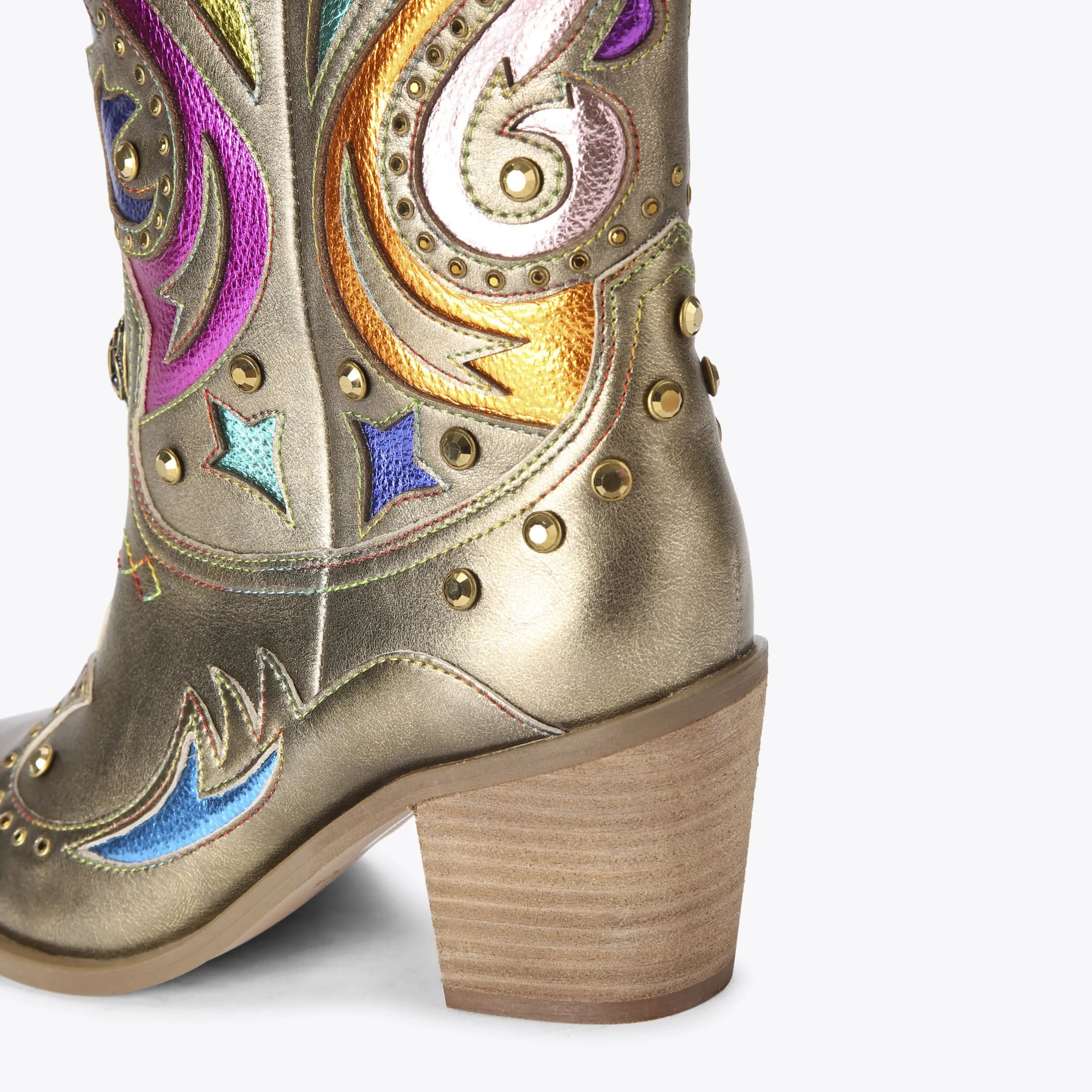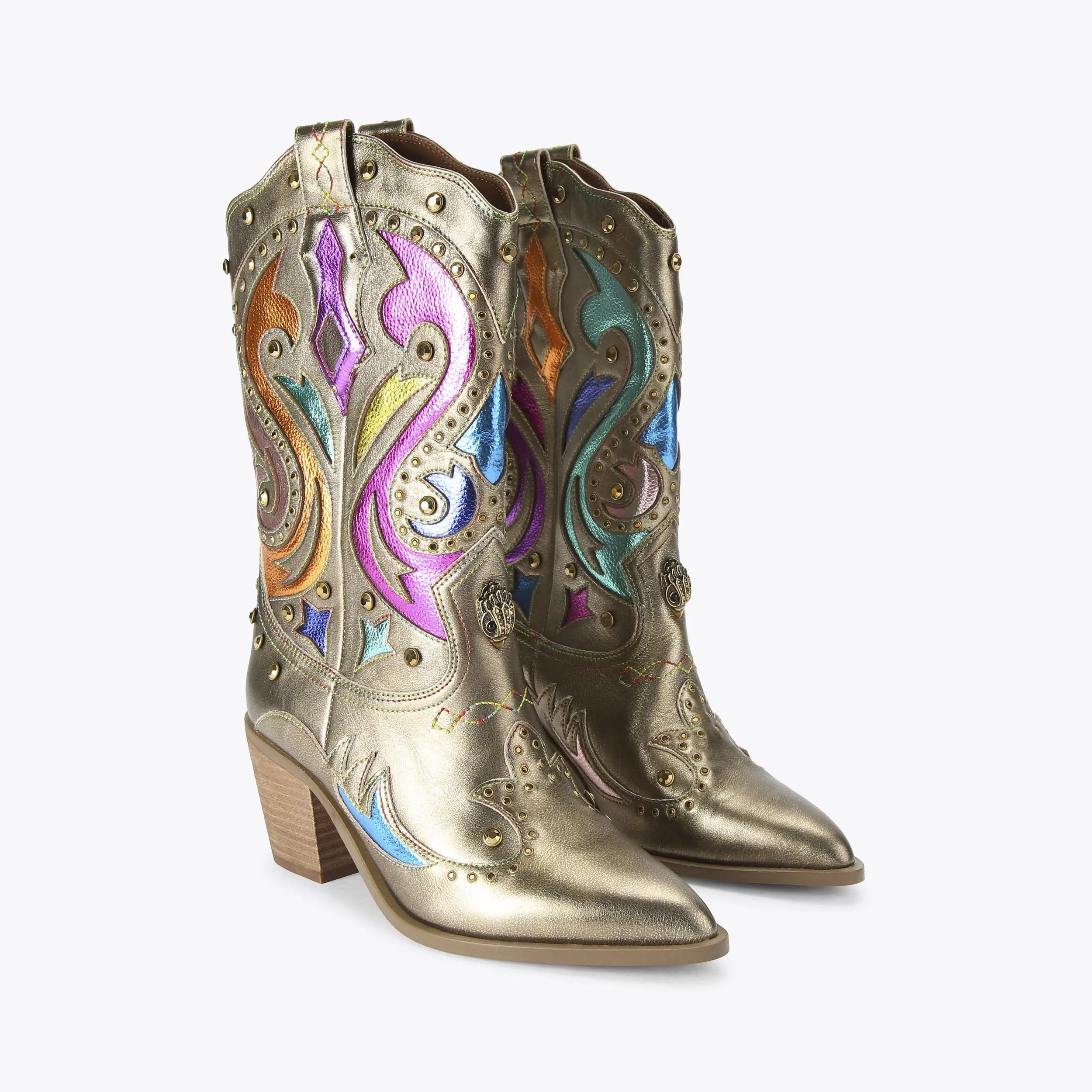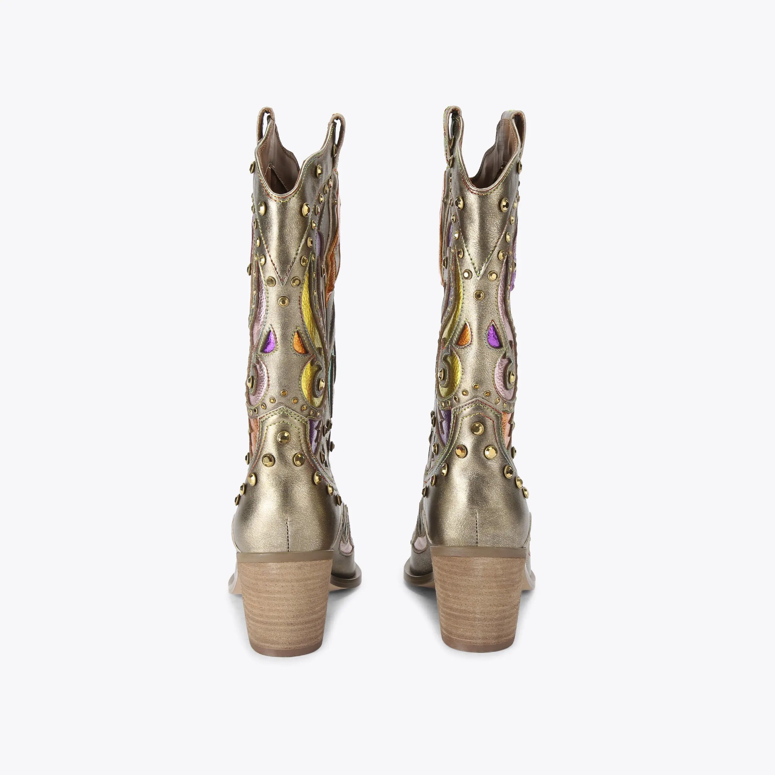 This pair of Kensington Cowboy Boots feature a gold upper with multiple cut outs and crystal embellishments. There is an antiqued brass eagle head on the front of the boot.