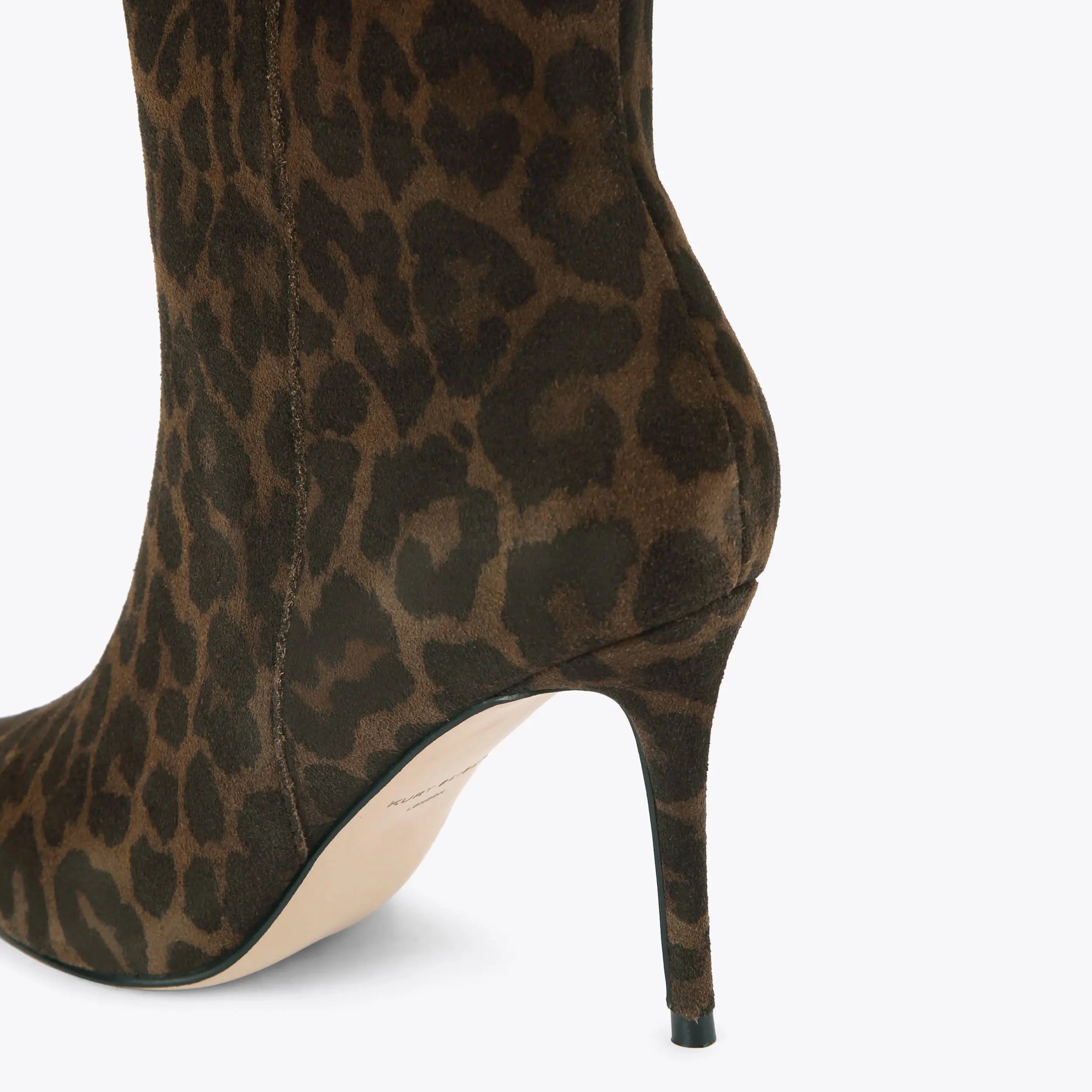 This Belgravia Knee Boot arrives in a leopard print dark brown suede. The toe is pointed and the heel is in a stiletto silhouette. There is an antiqued brass eagle head on the outer side on the ankle shaft.