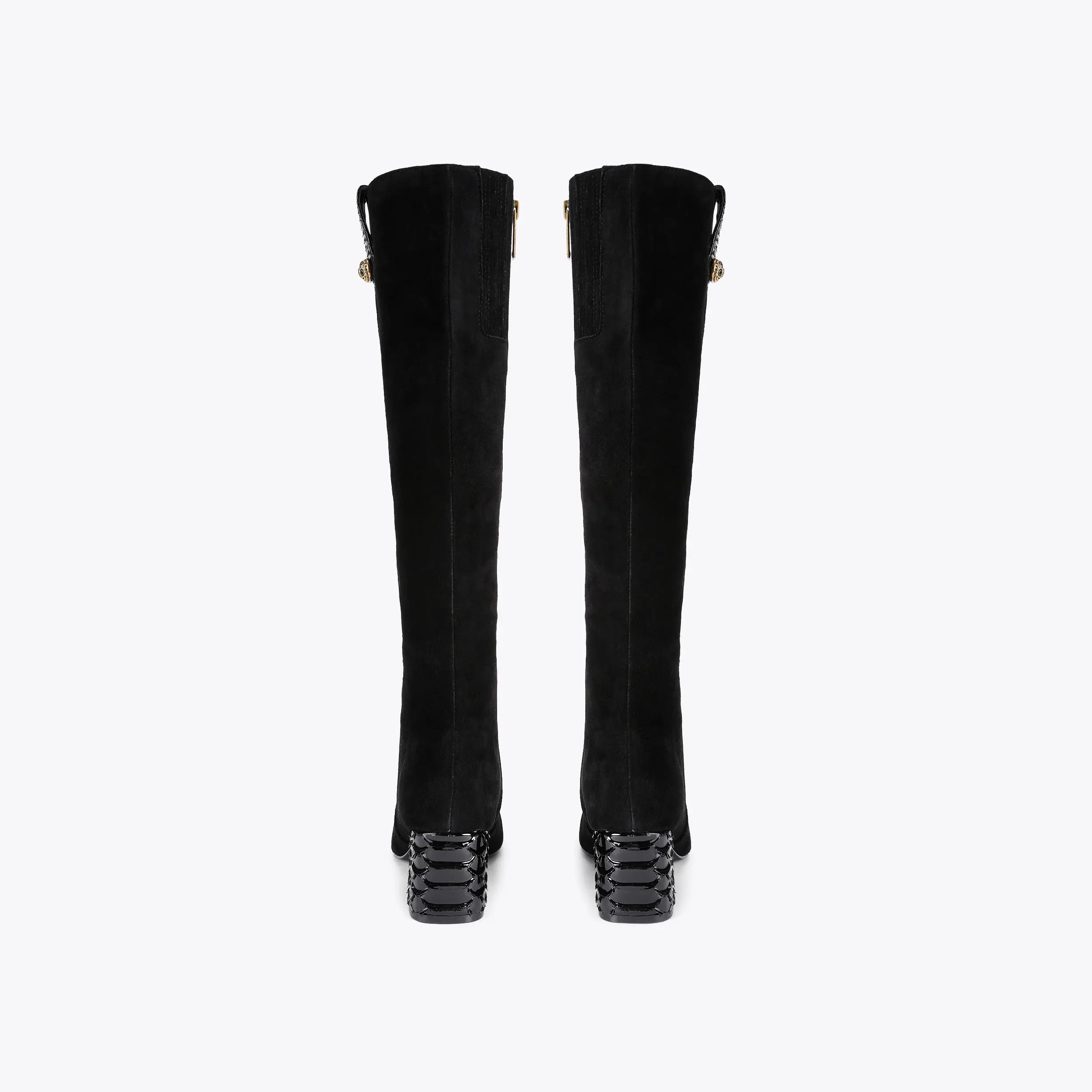 This Chelsea Trim Knee Boot is crafted from a black suede. There is an antiqued brass oval trim with eagle head at the centre on the side of the shaft. The heel is in a 3D embellished block style.