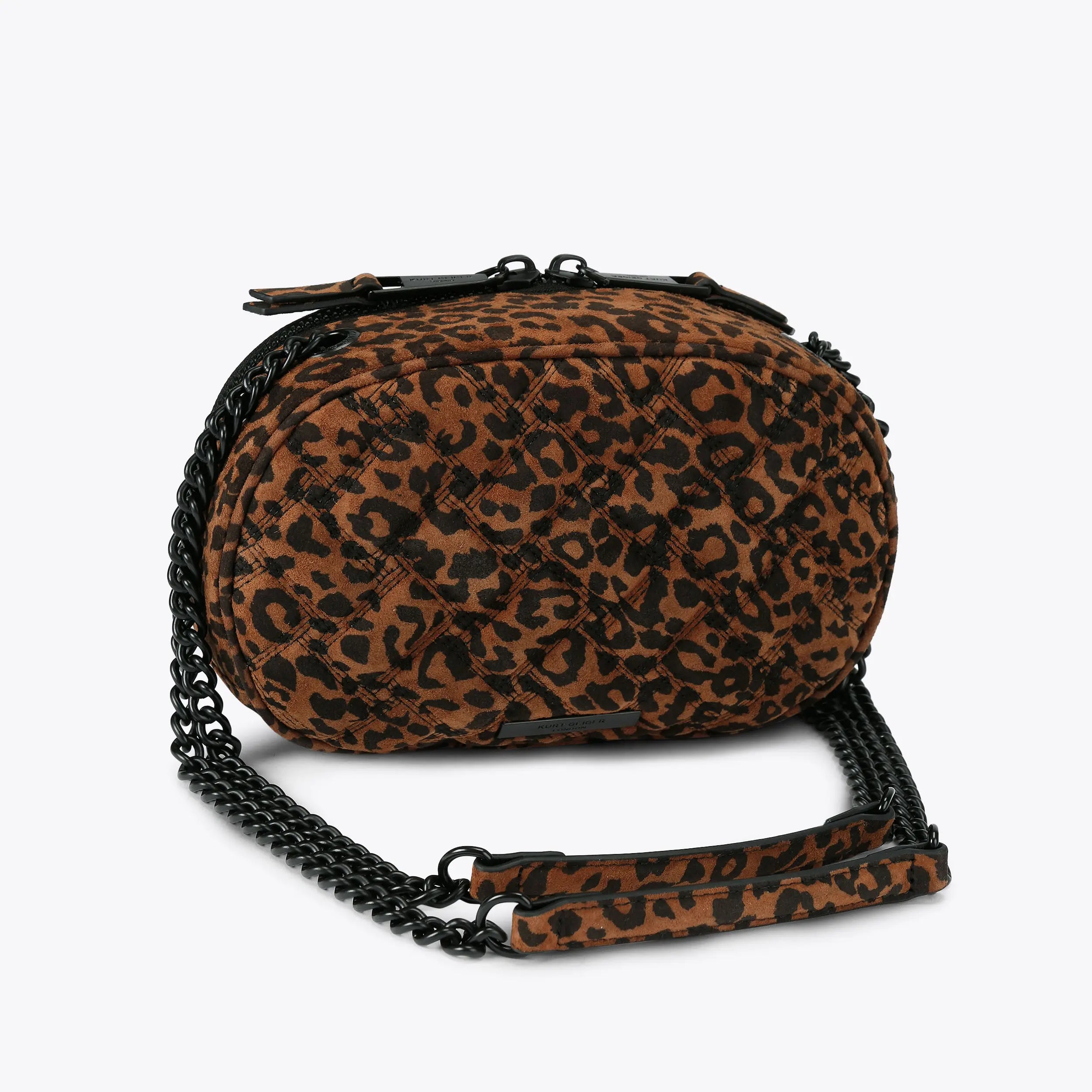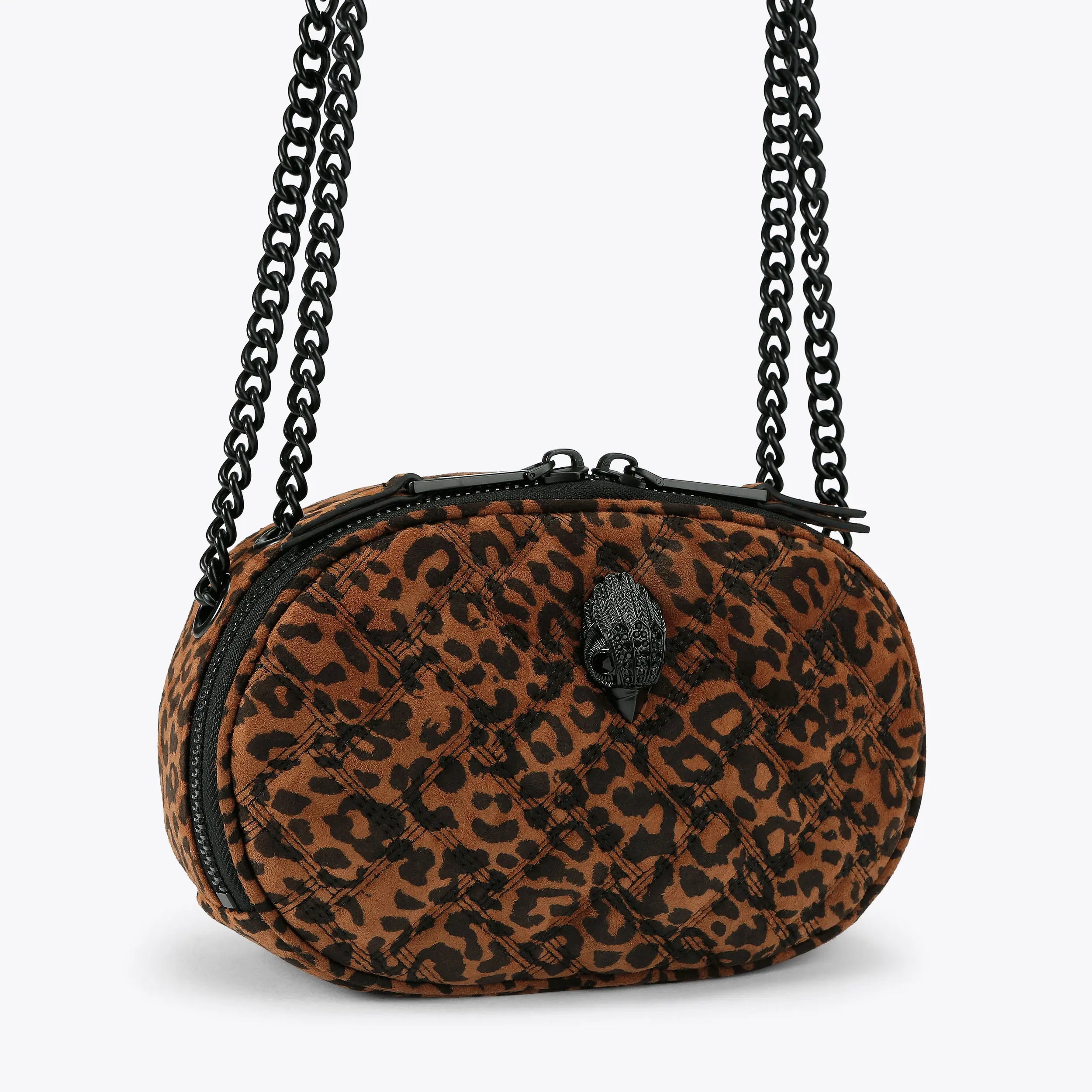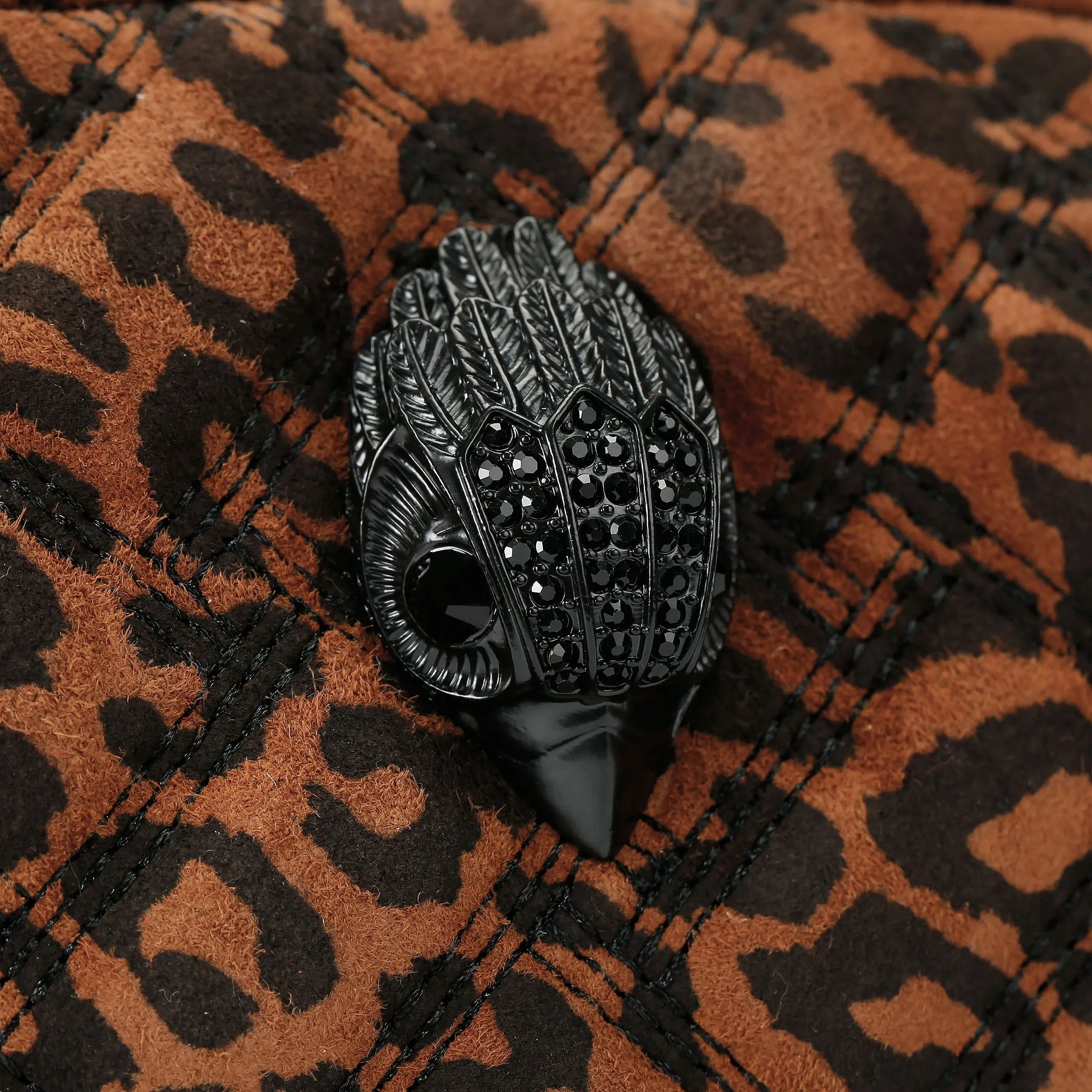 This Kensington Union Jack tote bag is crafted from a leopard printed suede leather with overstitch quilting creating a Union Jack. There is a black eagle on the front of the bag.