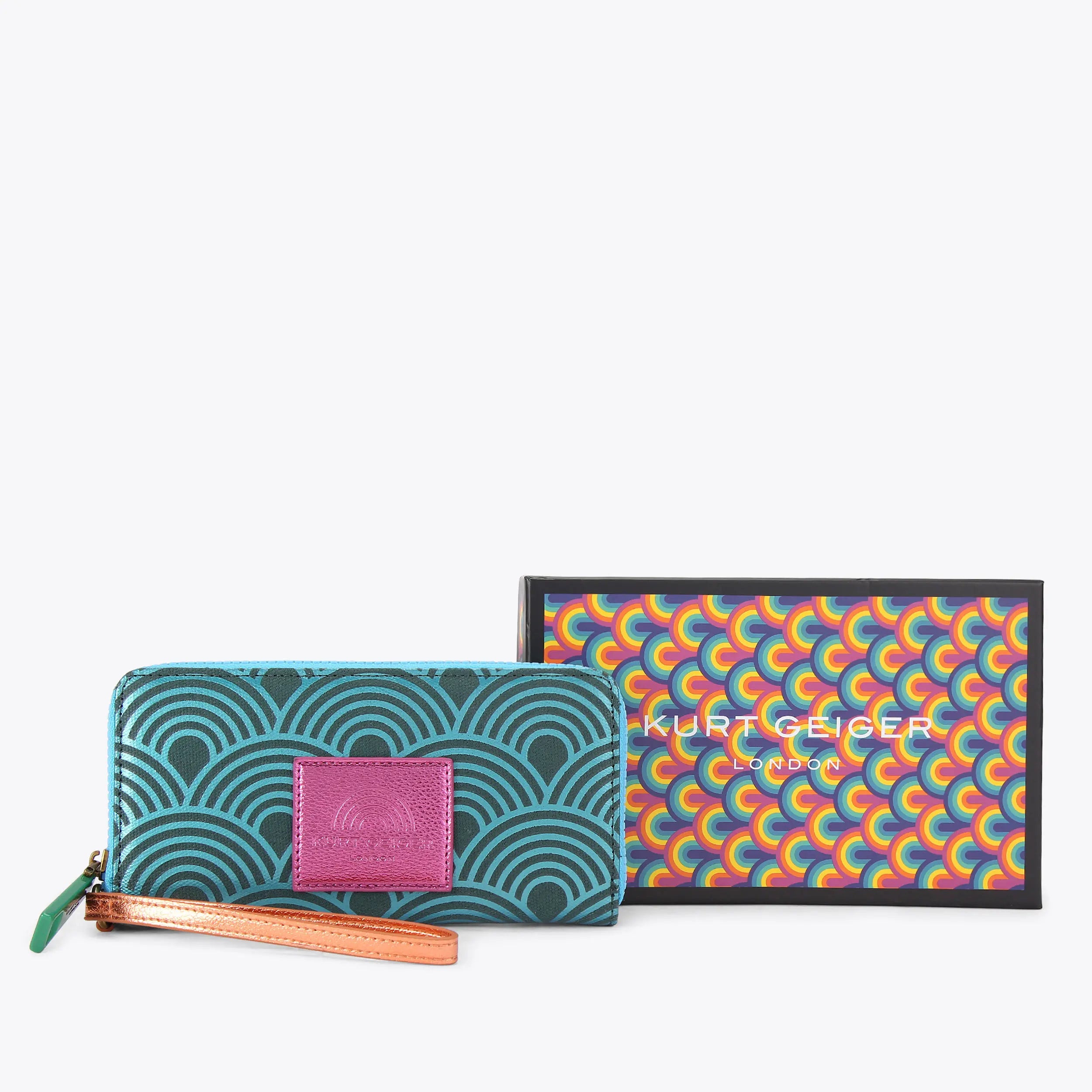 This Southbank Zip Around Wallet is crafted from a green canvas with metallic rainbow branding detail over the top. There is a metallic orange wristlet handle.